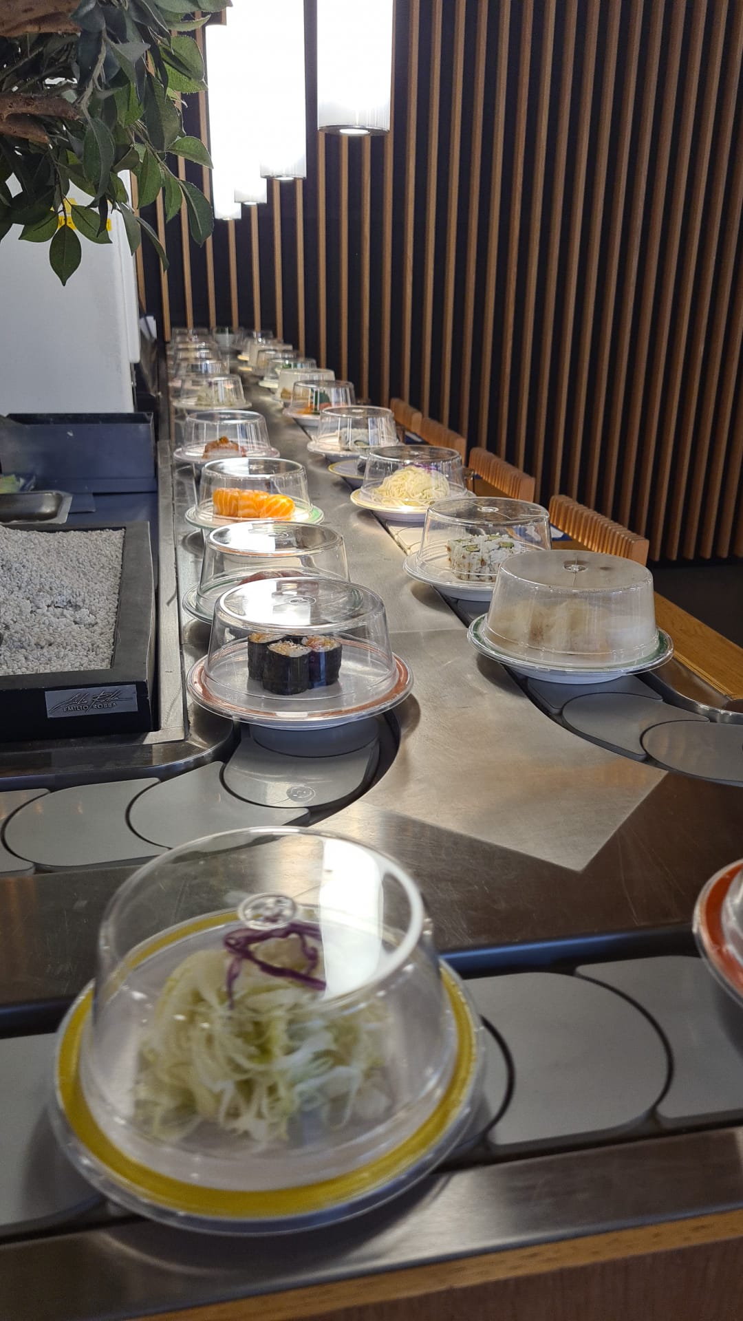 Très agréable première expérience. Sur le tapis roulant les préparations toutes plus jolies et appétissantes les unes que les autres : on a envie de tout goûter ! Un code couleur indique le prix de l'assiette les comptes se font à la fin avec les piles d'assiettes vides. Beau mobilier, ambiance calme. Un service discret mais attentif pour les boissons et commandes spéciales repérées sur la carte. A renouveler avec plaisir.