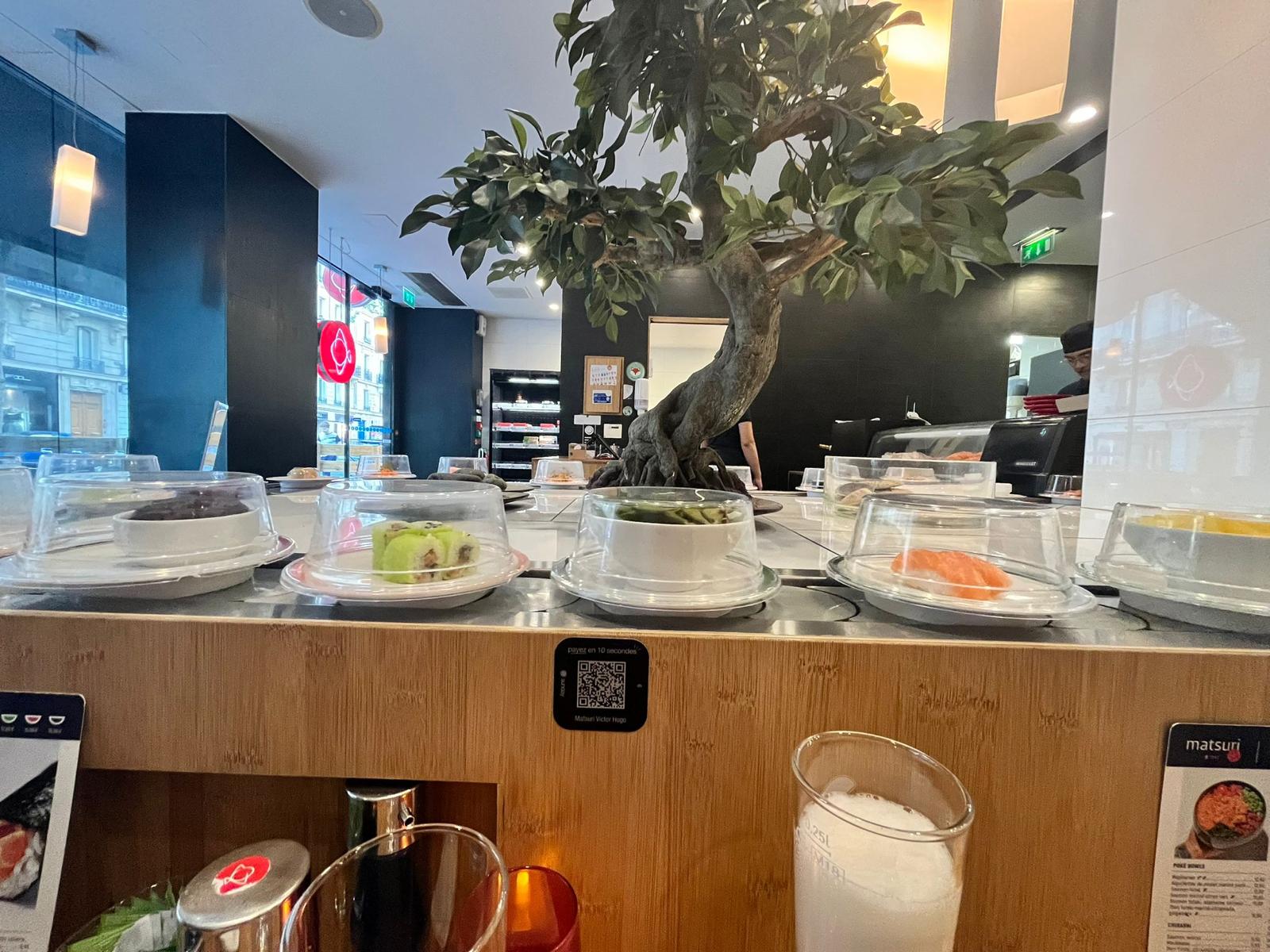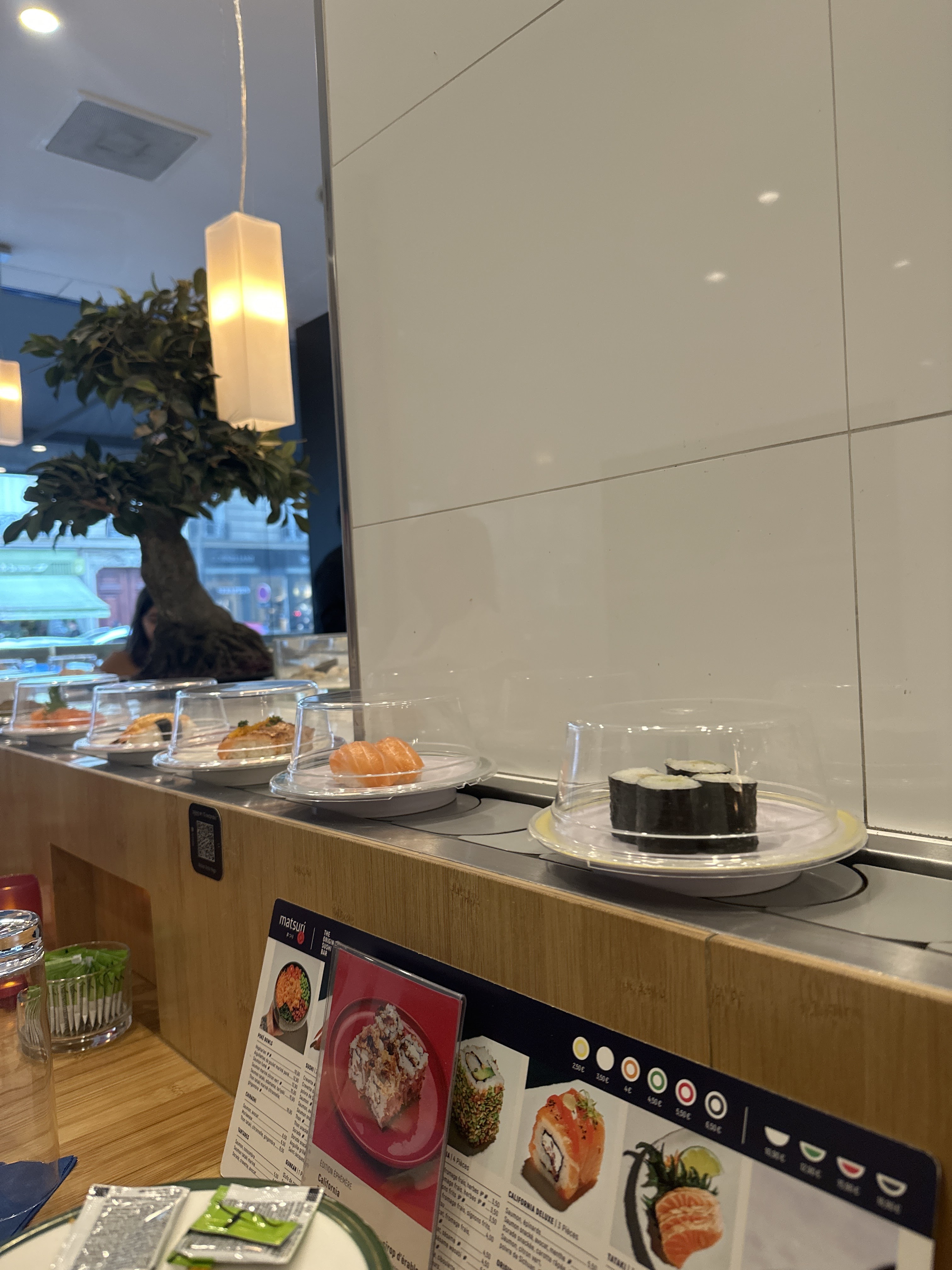 Un sushi bar avec un tapis roulant implanté dans plusieurs pays européen: - Unedécoration cocooning et simpliste - Equipe dynamique et au petit soin - La propreté est surprenante, les plats sont recouverts d’un petit couvercle en plastique, l’organisation et le service y joue un rôle aussi - Des plats chauds, froids et même des desserts sur le tapis, des options végétariens existent - La tarification se base sur la couleur de l’assiette, certains plats présents sur le menu sont à réclamés - Le rapport qualité n’est pas au rendez vous: des plats pas plus originaux que les autres japonais, pour un prix presque triplé - Les fruits servis étaient des fruits en conserve, tout comme les autres desserts à acheté dans leur emballage, très chers pour du non fait maison