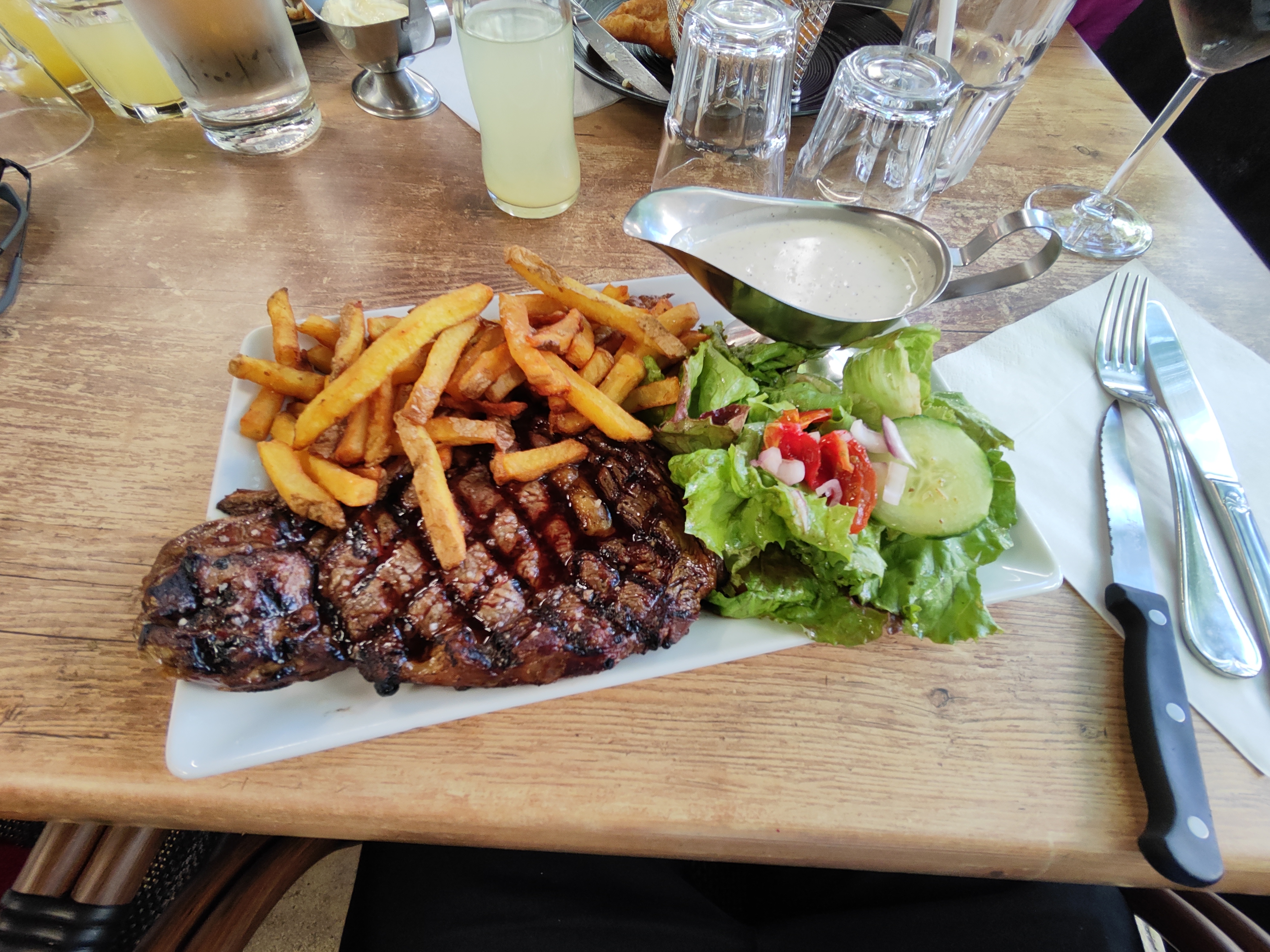 Mon steak était rare même si j'avais demandé un support. Ensuite, il a été frit un peu plus. Mais ensuite le goût était un peu brûlé… Mon mari était content de sa salade cependant…
