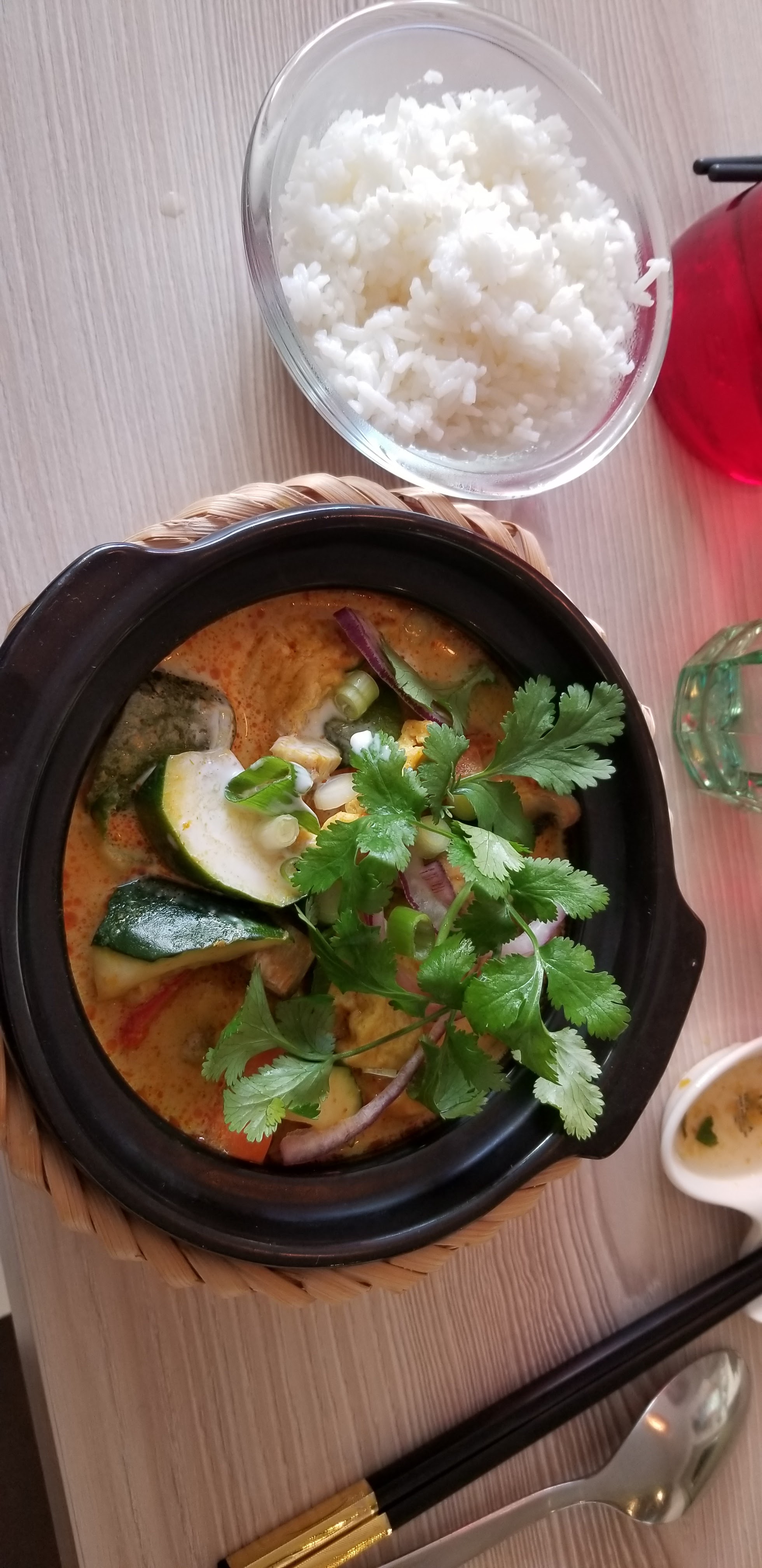 Tout d'abord, le service est très lent. Nous avons attendu environ 15 minutes pour que la serveuse prenne notre commande. Il n'est pas possible de commander simplement un plat principal si l'on souhaite manger au restaurant : il faut soit emporter des plats à emporter, soit commander une entrée, un dessert ou une boisson pour chaque personne qui mange ici. L'eau était chaude et lorsque nous avons demandé à la changer pour de l'eau fraîche et froide, ils ont expliqué qu'ils la gardaient à l'extérieur, pas dans le réfrigérateur, mais qu'ils apportaient de l'eau fraîche. La nourriture arriva : leur version du « pad Thai » était composée de nouilles de riz trop cuites collées ensemble en touffes et de tofu absolument insipide. Les escalopes étaient servies avec du riz nature et des légumes et n'avaient rien de spécial. Ils ont accepté de remplacer le pad thaï trop cuit par autre chose, mais nous voulions juste partir. Je ne comprends pas toutes les bonnes critiques, car la nourriture n’a au mieux rien de spécial.