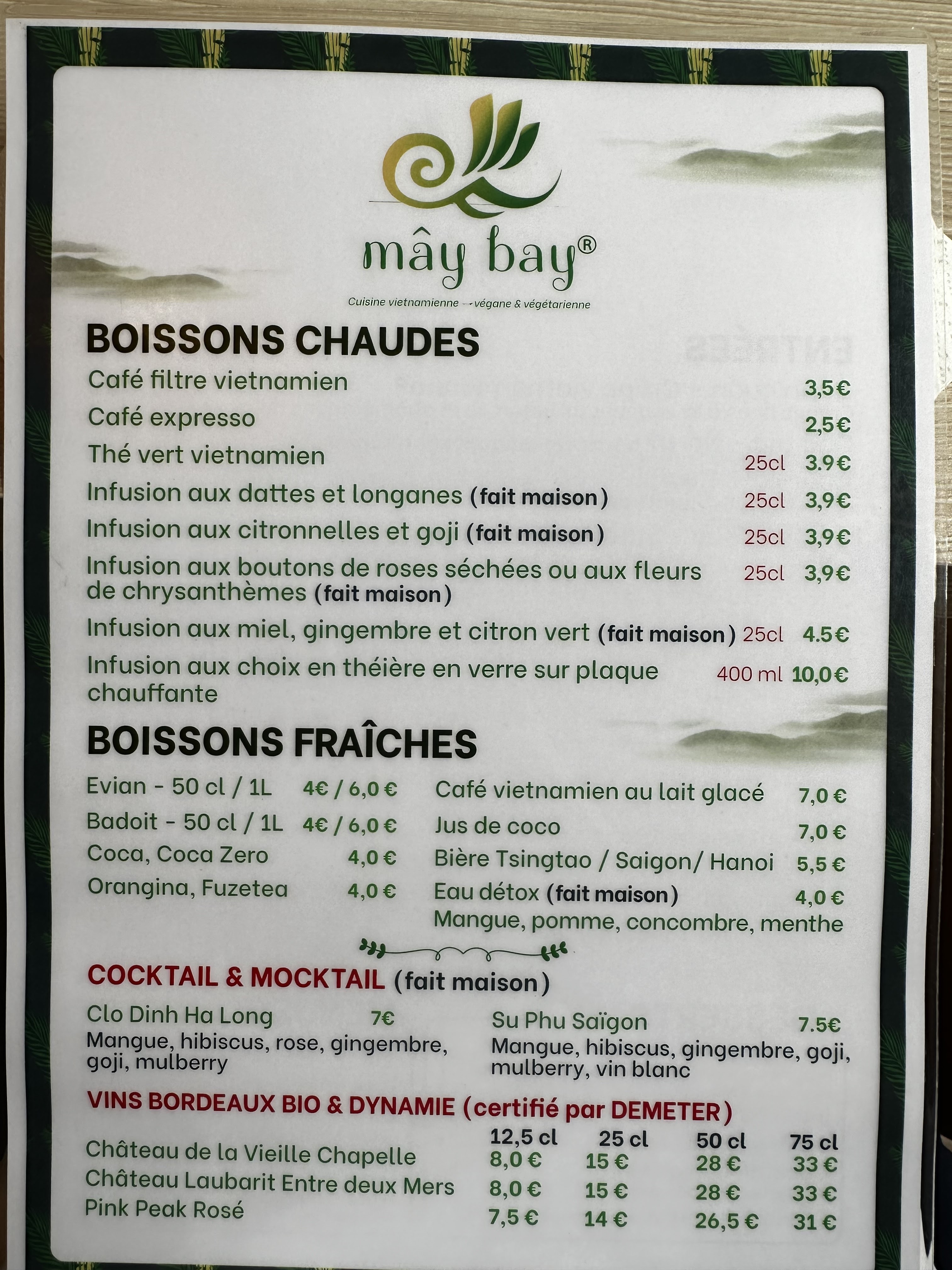Je recommande fortement ! Mây bay vous propose des repas vietnamien vegan et végétarien, leur carte est très diversifié avec différents mets originaux et agréable aussi bien qu'à l'œil que au goût. L'option vegan et végétarienne est très intéressante et si vous vous posez des question vis à vis de la quantité n'ayez crainte, leur repas sont généreux et complet. Je finirais enfin sur l'équipe qui est très accueillante et professionnelle. Manger à Mây bay fut une expérience agréable et rafraîchissante, que ce soit en famille, avec des amis, des collègues ou même seule je vous recommande ce restaurant !