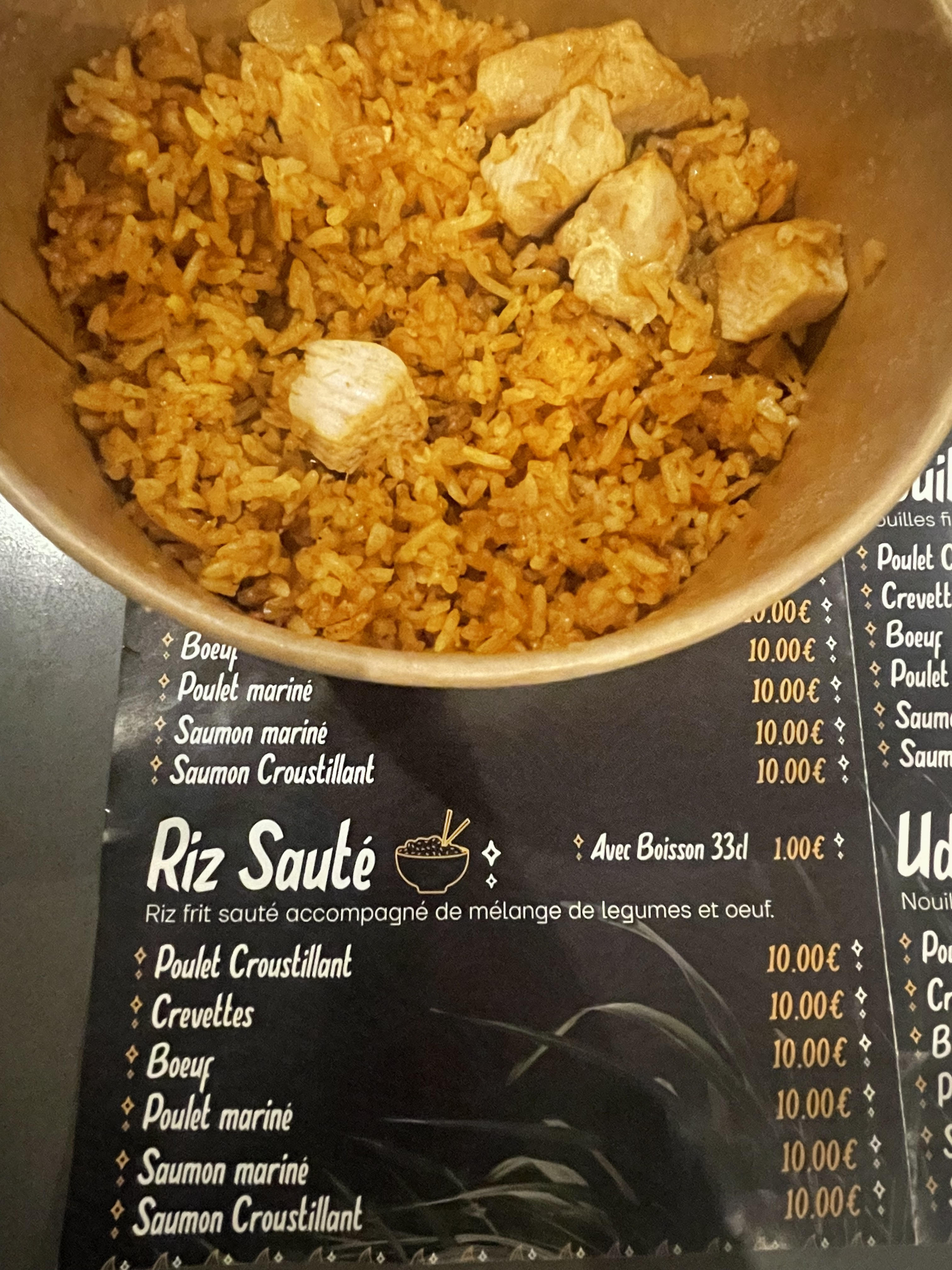 Sortez vos microscopes pour trouver la trace de légumes et d’œufs… quand tu appelle pour demander une explication sur le fait qu’il manque les œufs et les légumes on te répond que l’œuf est coupé et mélangé avec le riz… Ok, et pour les légumes ? Non mais y en a pas avec le riz sauté. Pourtant c’est écrit sur votre carte… ah ok, merci, au revoir. BREFFF après vous venez chialer quand vos commerces ils ferment et que les autres réussissent. Avoir le sens du commerce ce n’est pas donné à tout le monde. Restaurant à fuir