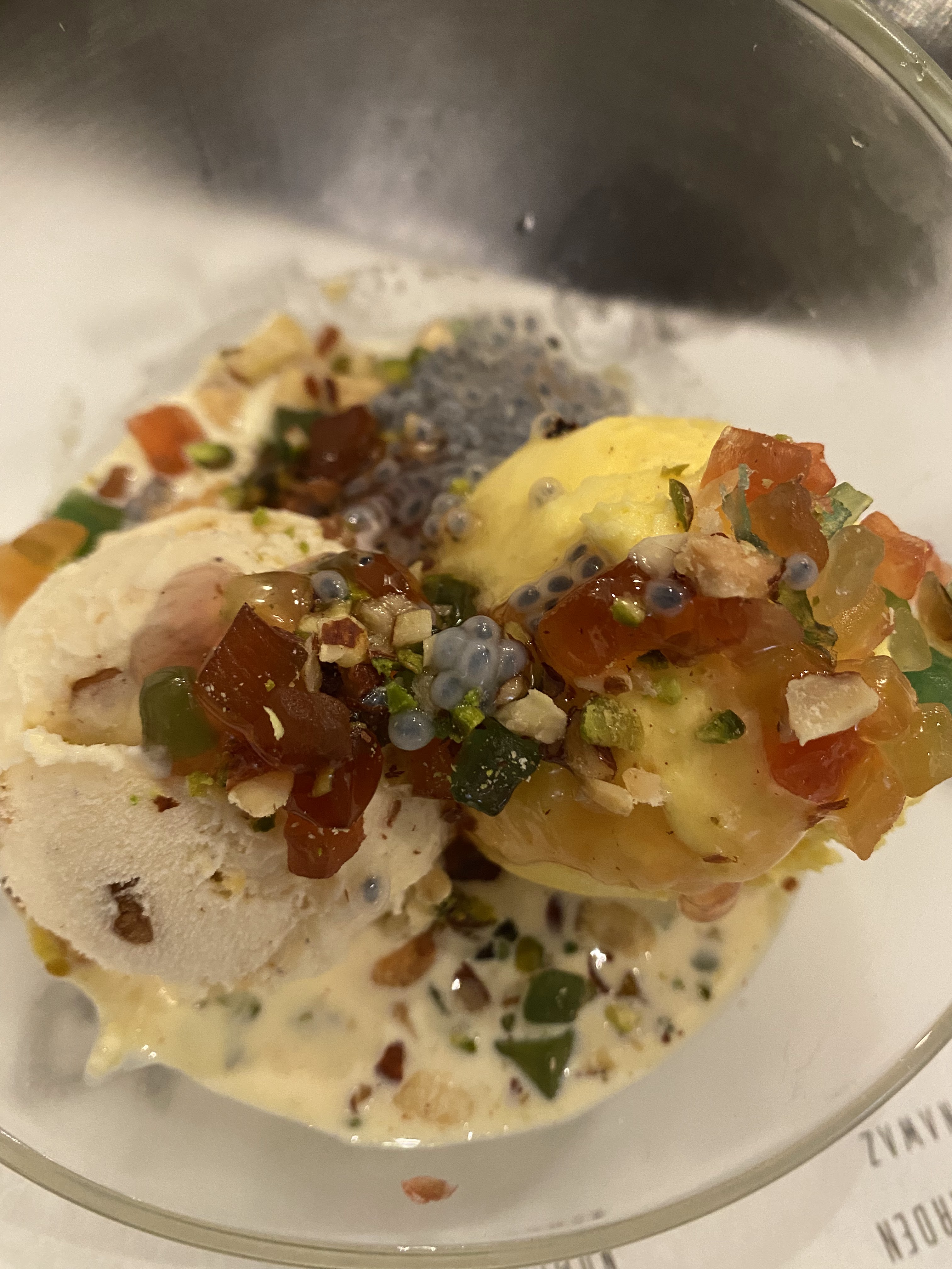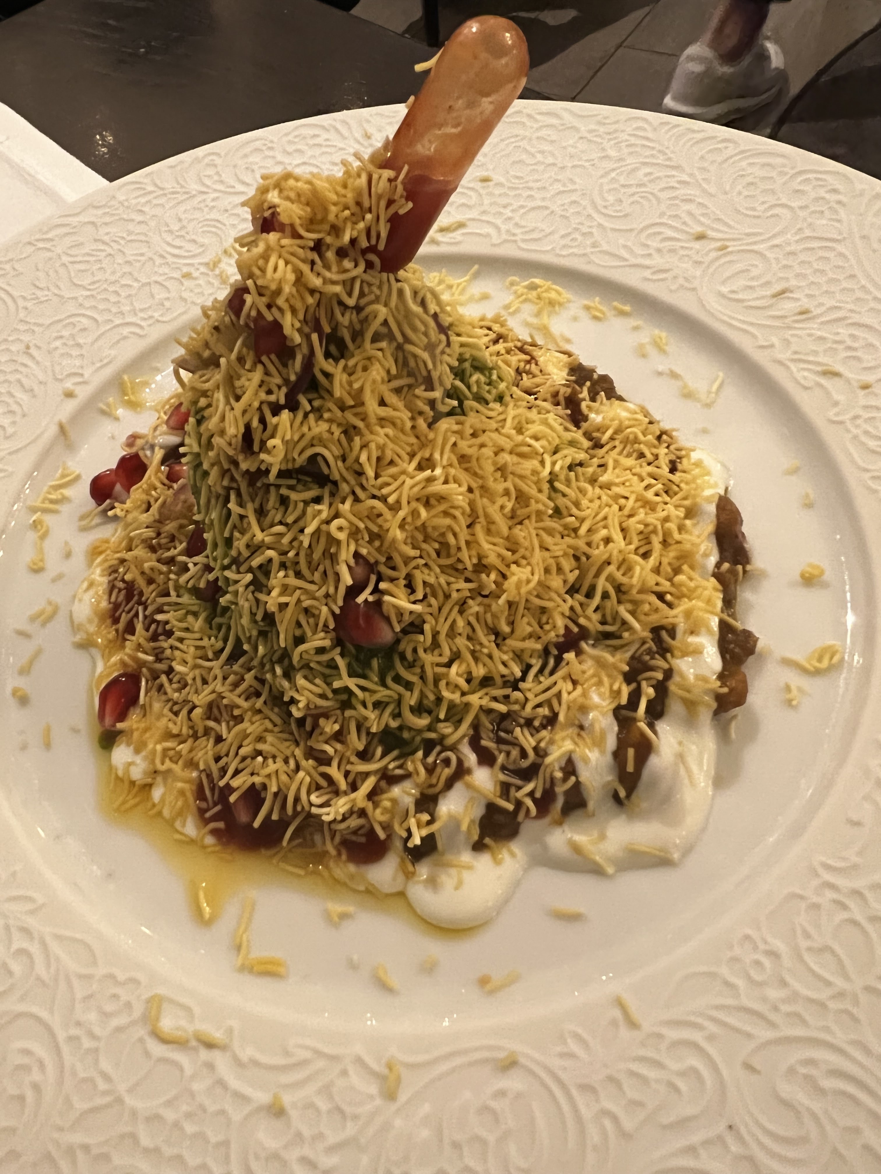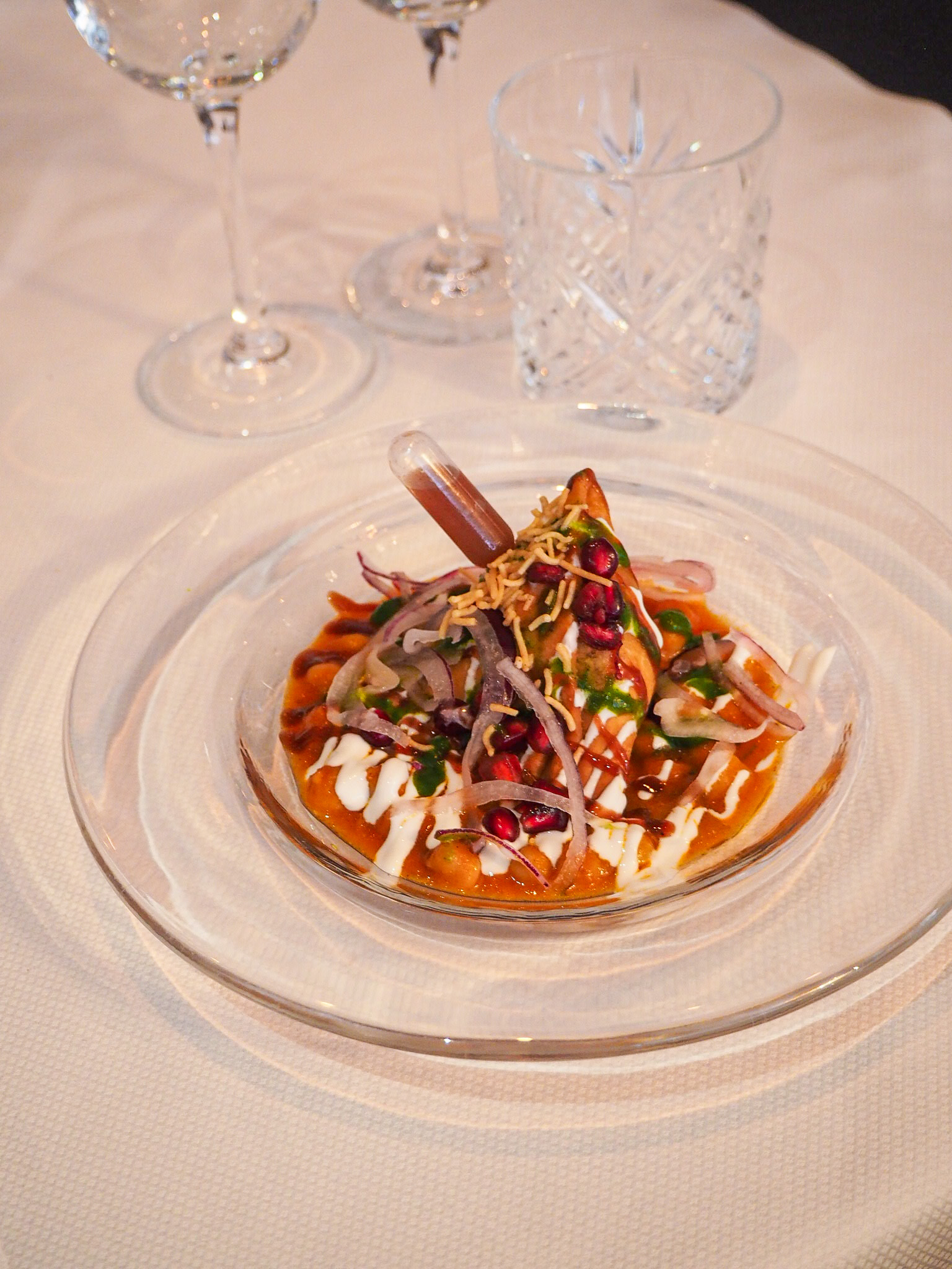 Cet endroit est magnifique. La nourriture était incroyable. C'est devenu pour nous un restaurant incontournable. Ils ont pris très soin de réfléchir à ce qu'ils pouvaient faire pour répondre à notre allergie au gluten. L'un de leurs plats célèbres est à la fois magnifique et une explosion de saveurs totale. Le Pink Kachori Chaat n'est normalement pas possible, mais ils l'ont mis sur le parpadum afin de le rendre sûr pour nous. Le serveur nous a également expliqué comment obtenir des sauces sûres avec les viandes que nous voulions. Cela a été fait avec tant de soin que nous étions sûrs que nous prendrions bien soin de nous. L'entrée qui a « gagné » était le Saint Jacques Coco. Les coquilles Saint-Jacques étaient PARFAITES et la sauce était incroyable. La finale était la glace au safran Falooda. Notre fils l'a noté 10/10.