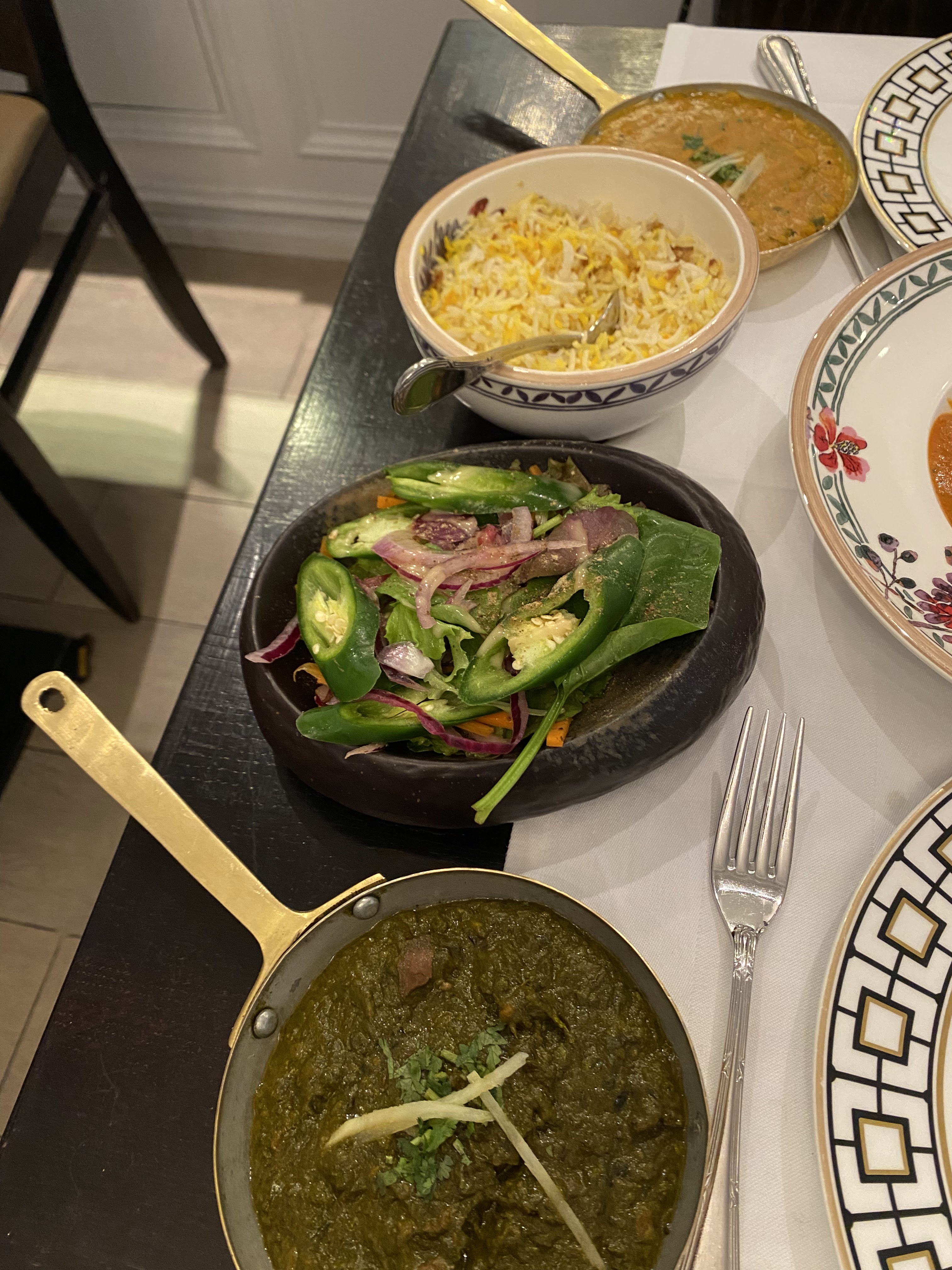 Service et nourriture exceptionnels! Mon mari et moi avons commandé la bière kachori, le samosa chaat, le tadka daal et leur version du saag paneer. Tous les plats étaient incroyables ! Tellement de saveur ! Une touche unique sur tous les plats, une présentation spectaculaire et, dans l’ensemble, une expérience merveilleuse !