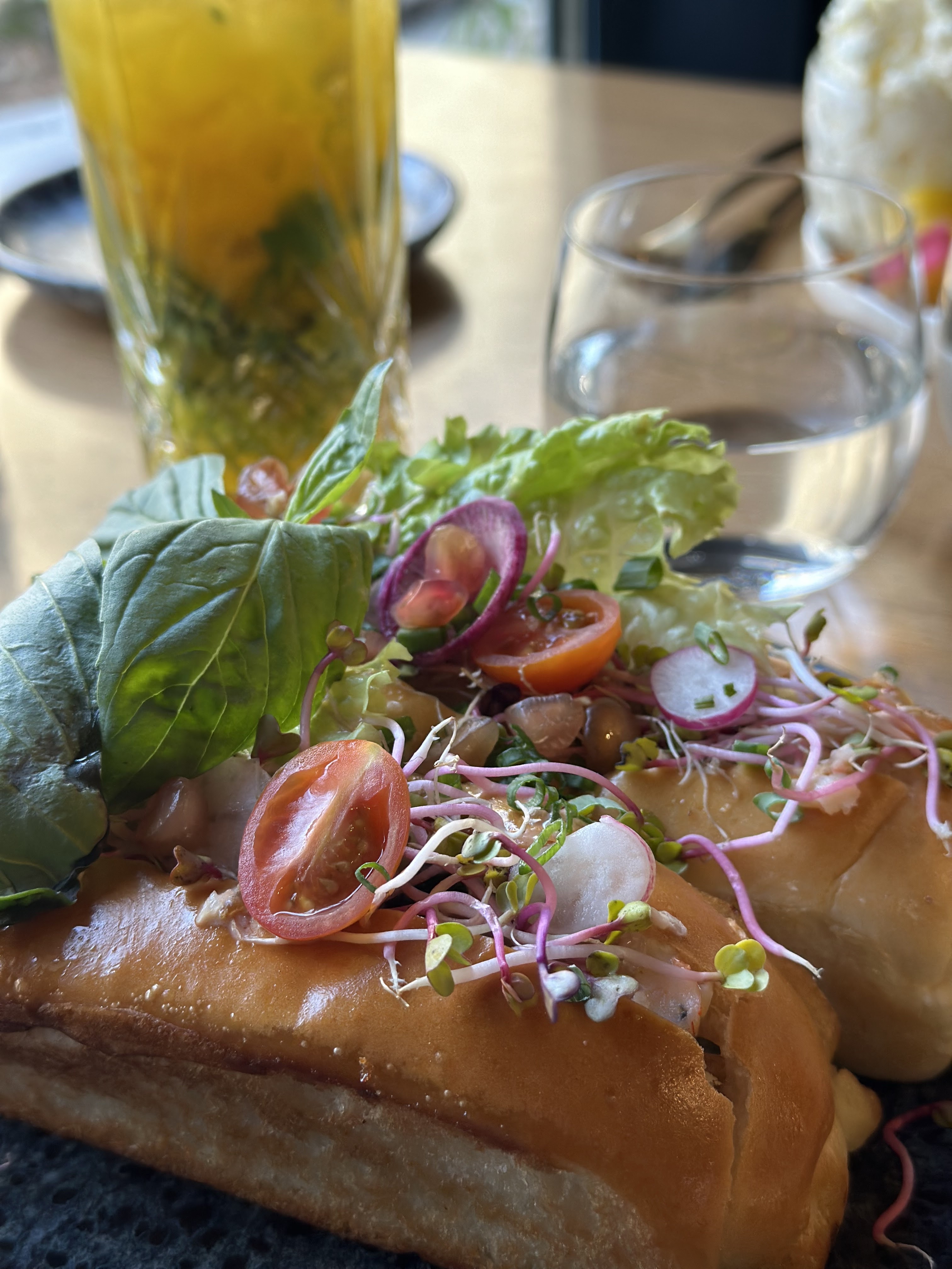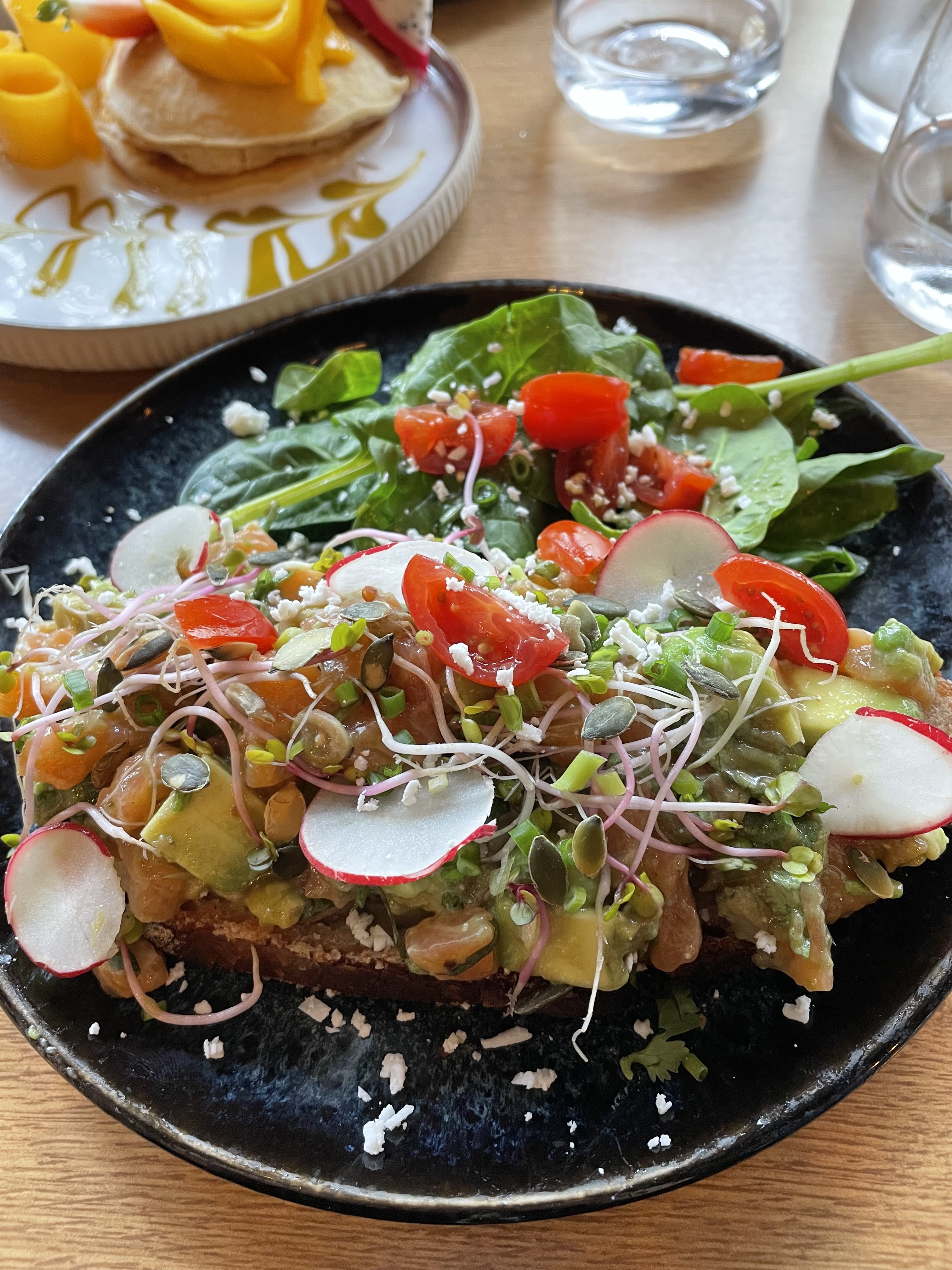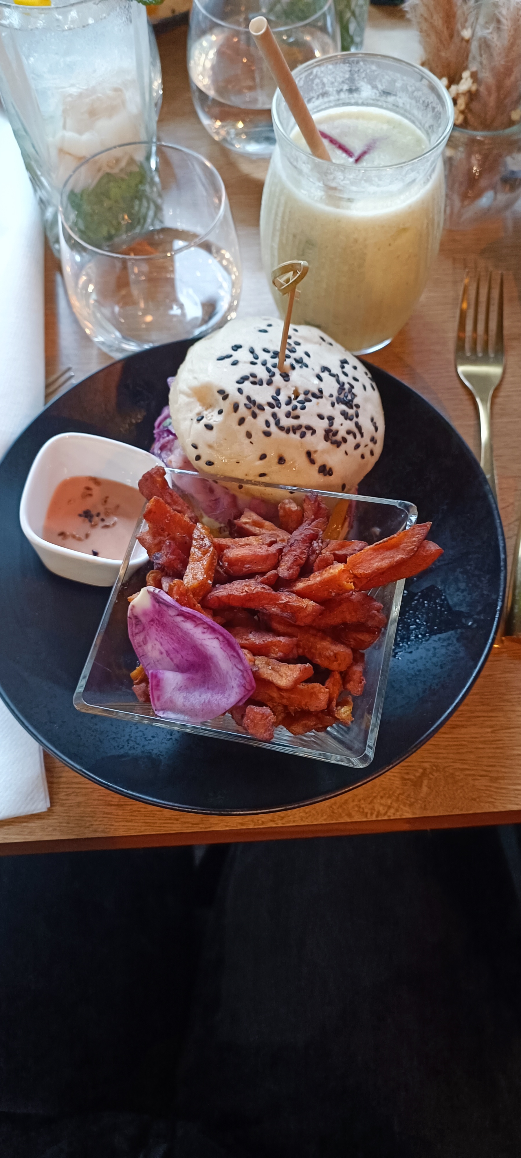 C’est un très bel endroit, j’ai partagé un bon moment avec mon amie. J’ai absolument voulu goûter le burgers veggie, il était très bon, le tofu est très prononcé. Et par la suite j’ai pris elle pancakes mangue coco, vraiment excellent ! Je recommande vivement les pancakes 🥞 ! Pour ces deux plats j’ai payé 30€, je trouve ça un peu chère, ces deux plats ne sont intégrés dans aucun menu et il n’y a pas de menu brunch, merci pour l’accueil @myriam_tm