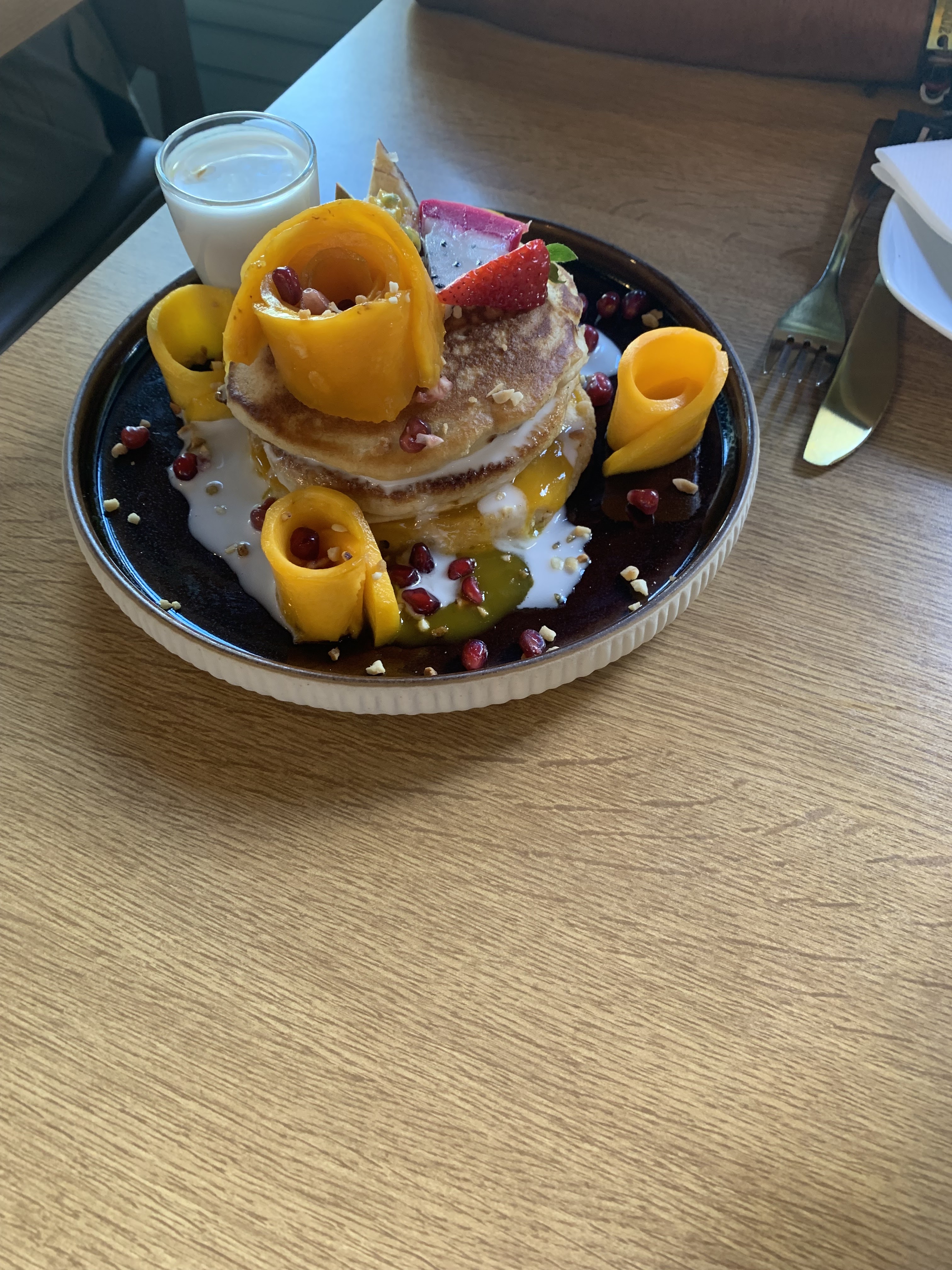 Lieu agréable, personnel accueillant... Ça a été dur de choisir, tout nous faisait envie sur le menu ! Gros coup de coeur pour Les pancakes mangue coco 😍 on reviendra !