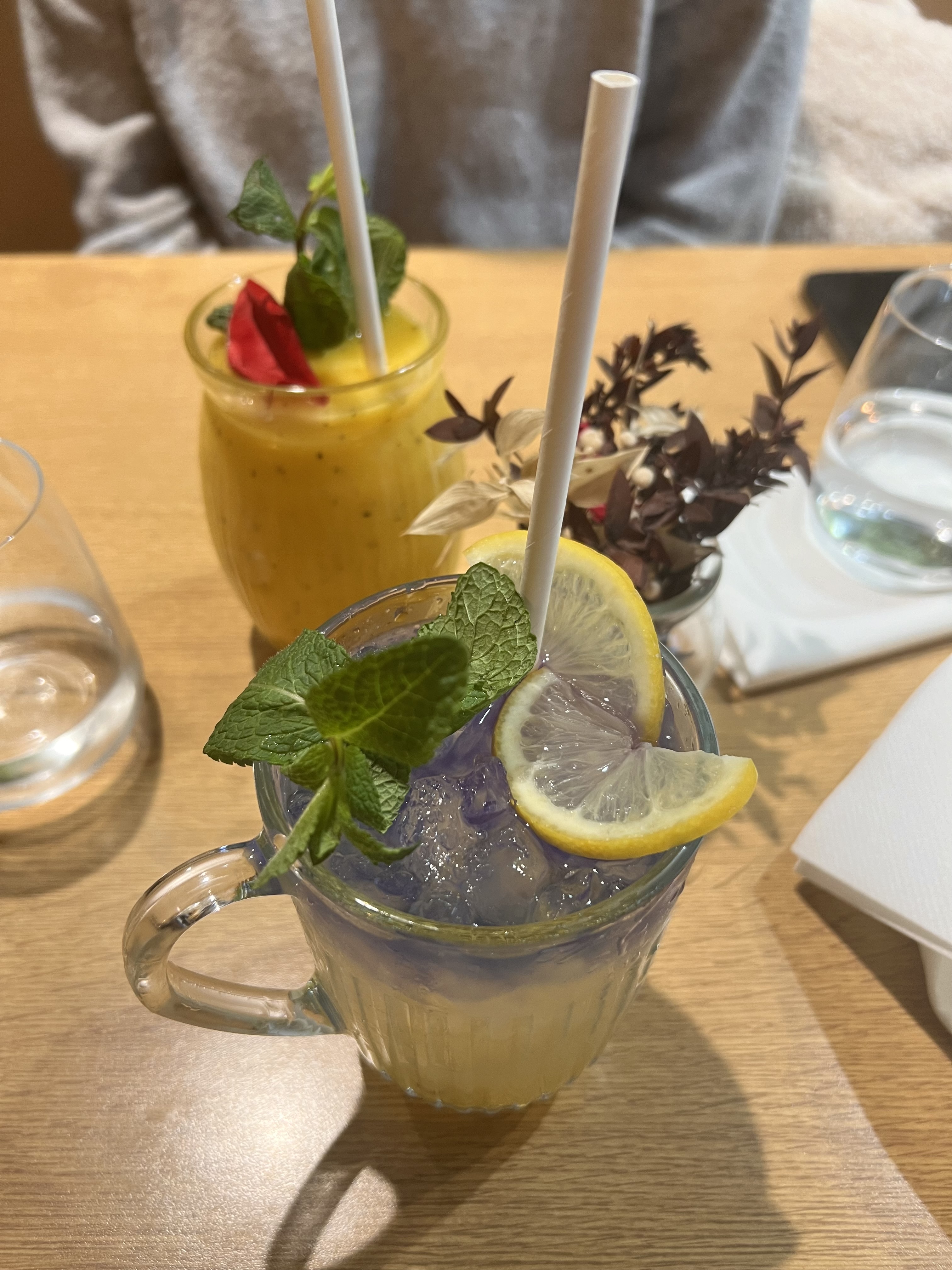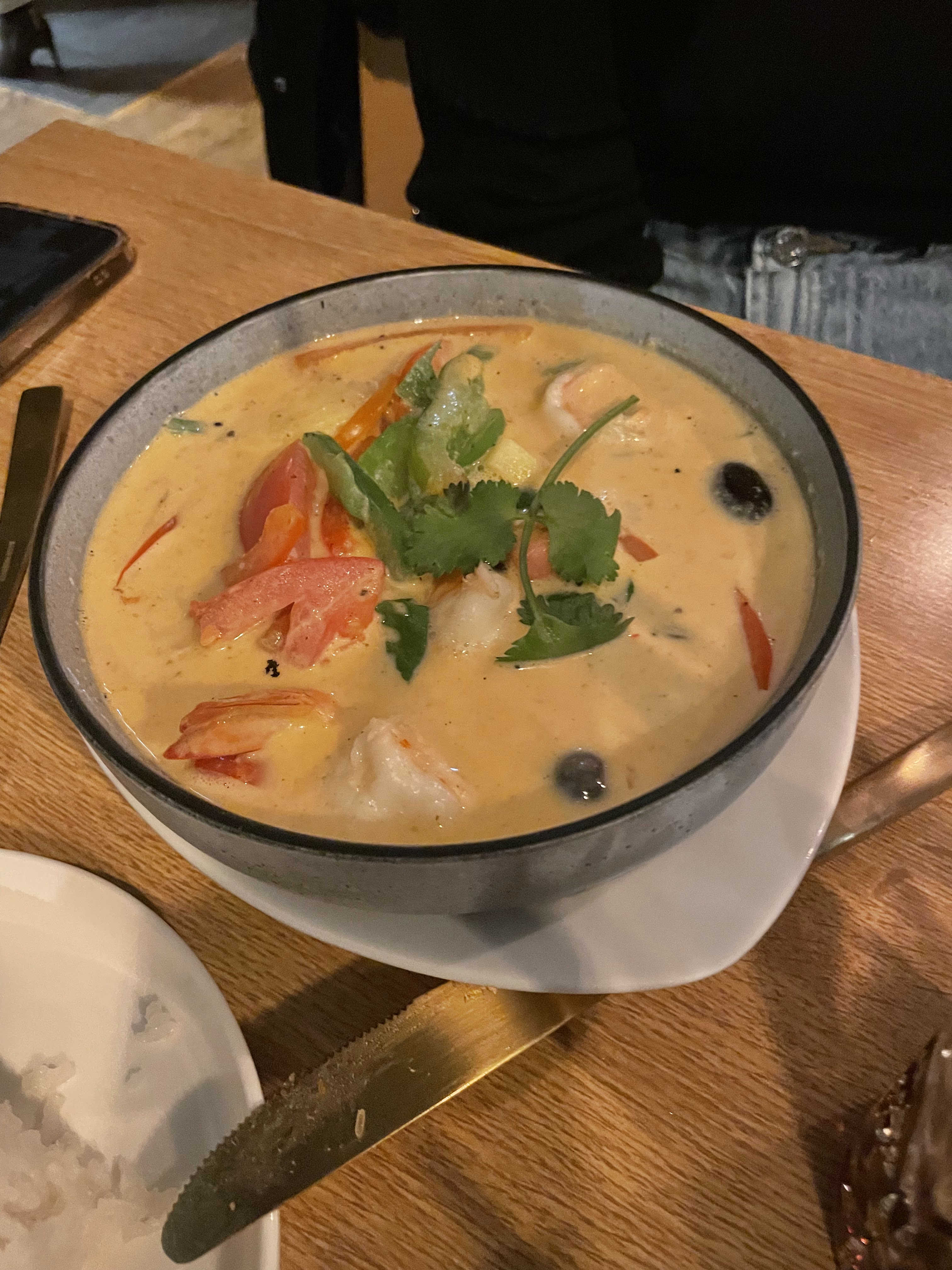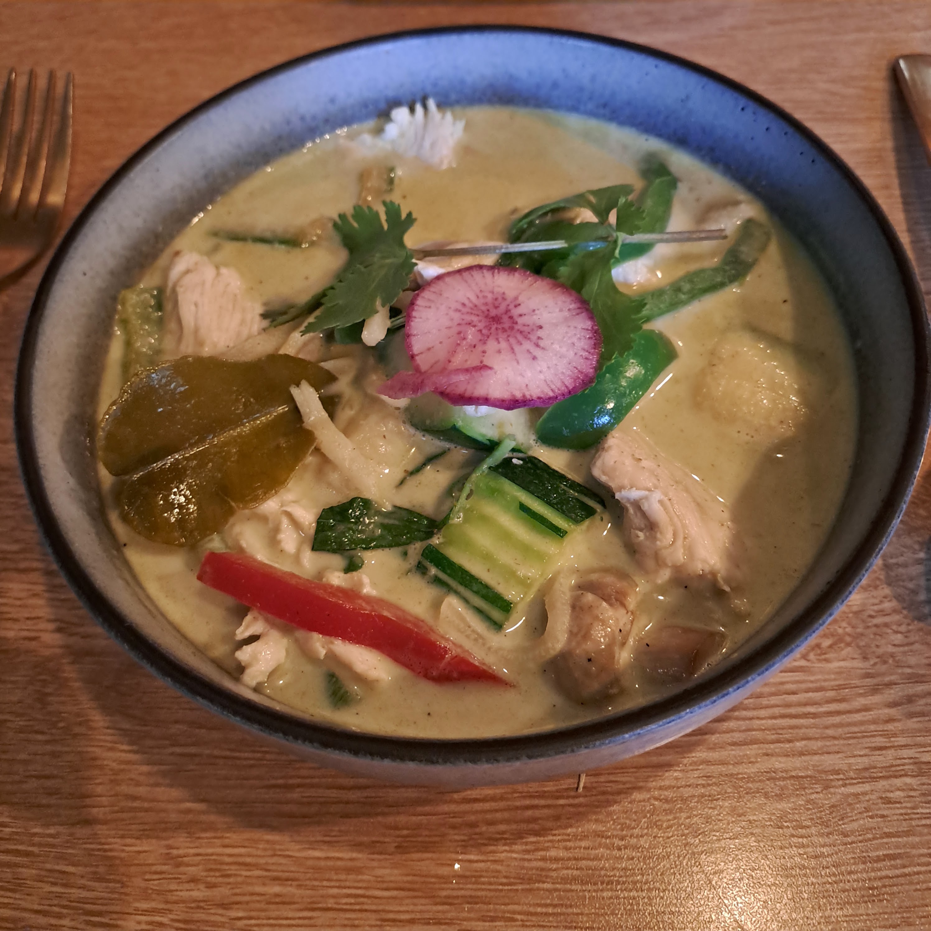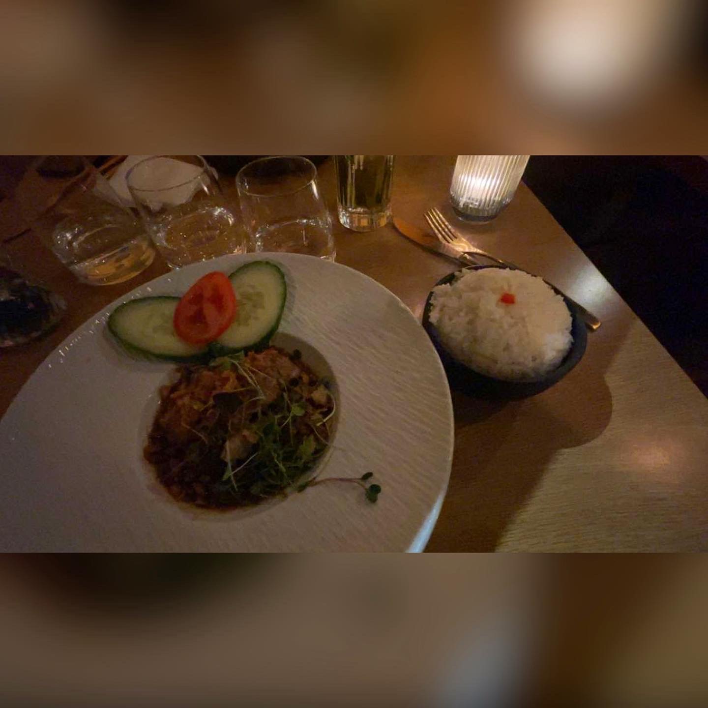 Un de mes endroits préférés pour une bonne cuisine thaïlandaise. La déco est agréable et se marie bien avec l'ambiance du restaurant. Nous avons eu l'entrée assortiment maythai avec deux cocktails qui était un vrai succès. Pour le plat principal, nous avons eu un curry de canard rouge et un curry de poulet vert. Les currys étaient corrects mais dans mon canard l'aubergine n'était pas bien cuite, d'où la dernière photo. Dans l'ensemble, la nourriture était bonne et les prix étaient également assez raisonnables.