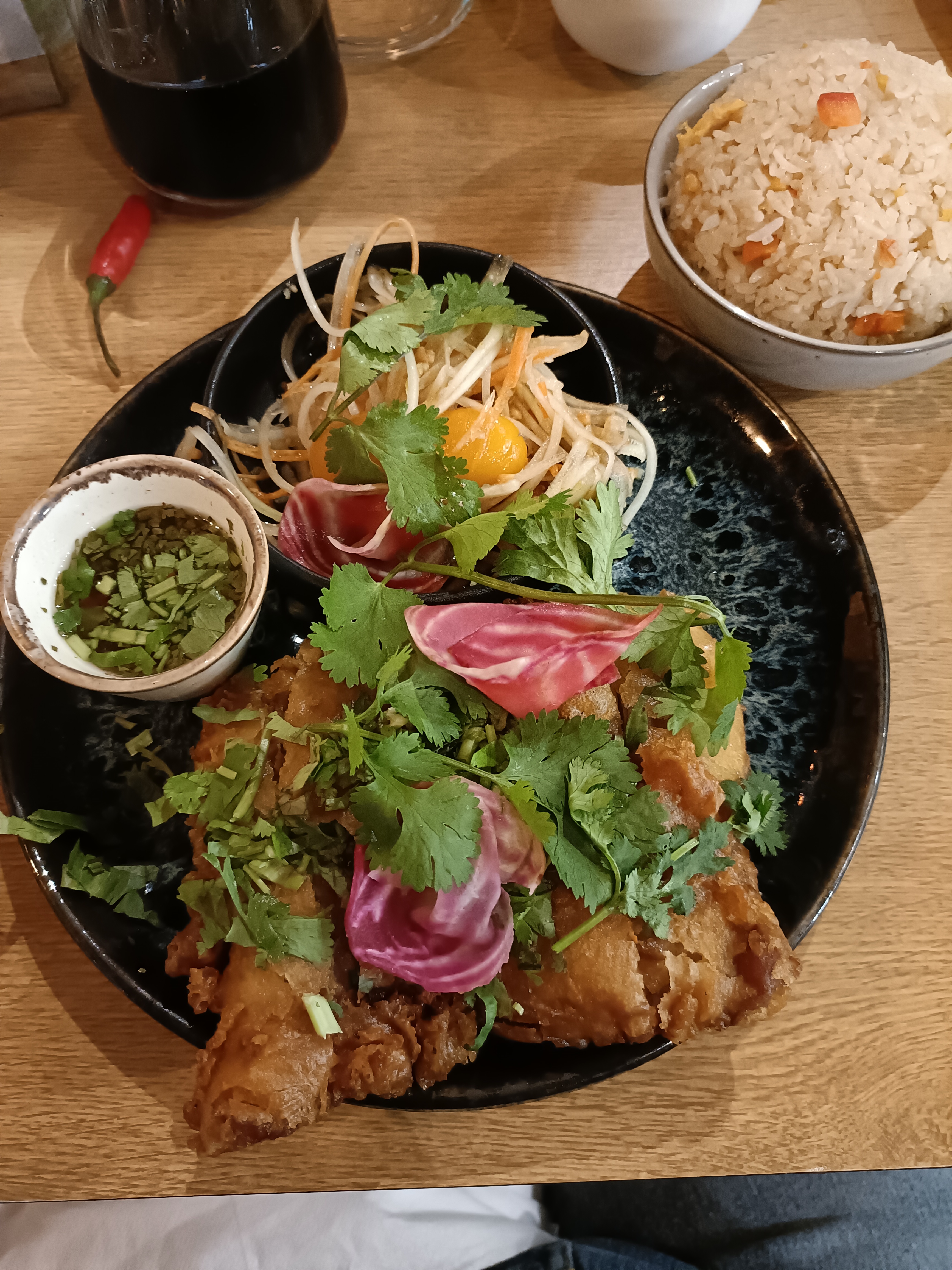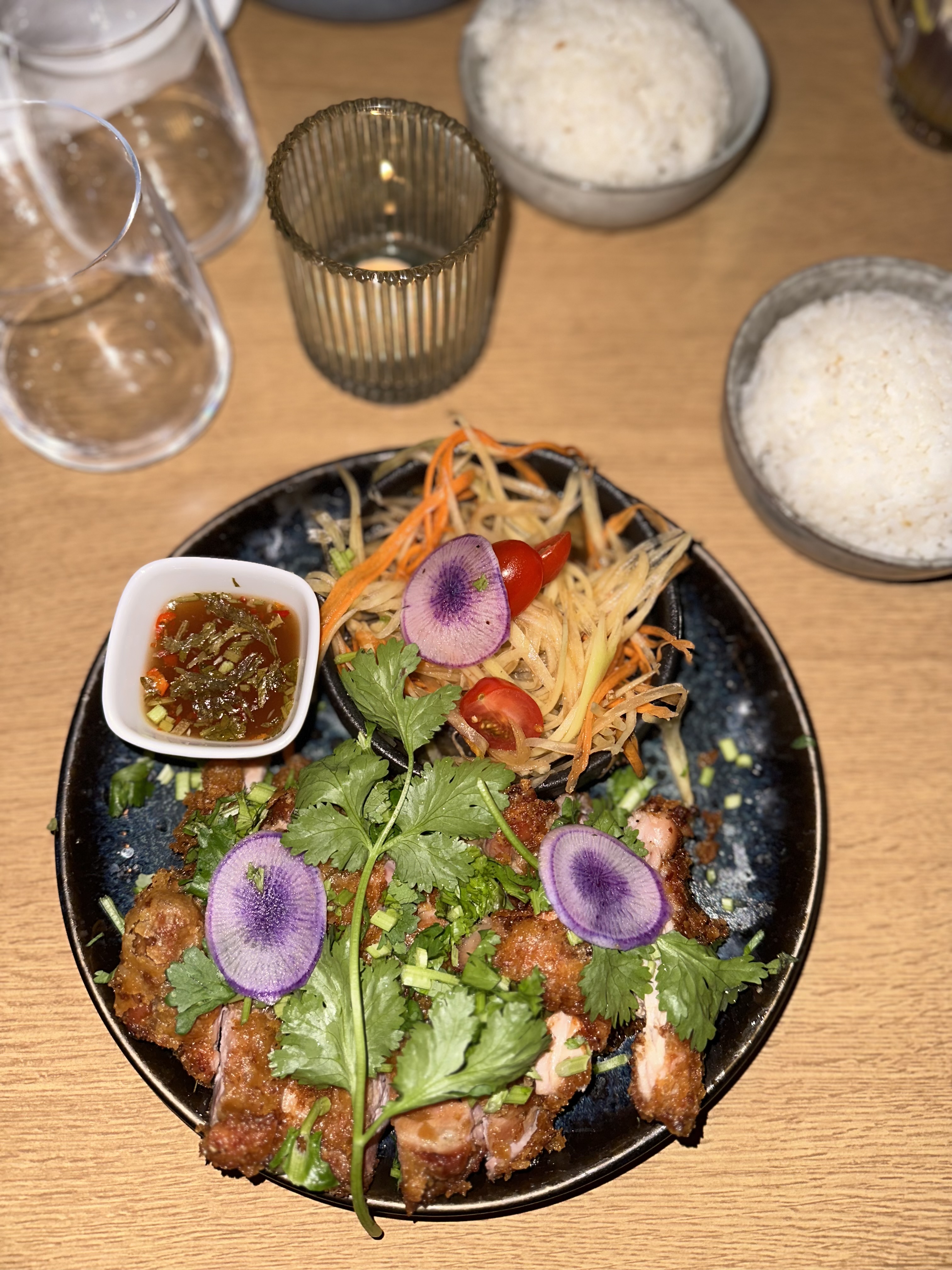 J'ai adoré l'endroit. L'intérieur était si bien décoré. La nourriture était bonne. Le service était génial. Nous avons pris le poulet frit avec de la citronnelle et une sauce au persil. C'était croustillant et juteux avec des saveurs thaïlandaises incroyables ! Le magret de canard sauce tamarin était également dingue, sauce sucrée et magrets roses tendres. Un régal. Ils font aussi un brunch qui avait l'air super. J'essaierai ça ensuite !