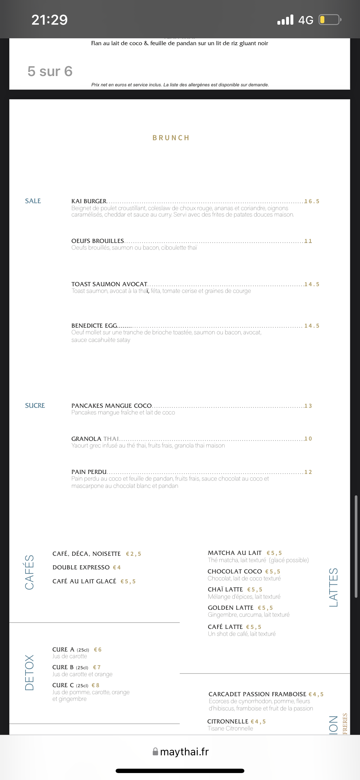 C'est la seconde fois que je viens pour le brunch chez Maythai. C'est très appréciable de pouvoir réserver. Le brunch est vraiment délicieux et copieux. Le khung rolls et les oeufs satay sont vraiment bon. Pour la brioche au pandan, on sent très bien le goût.