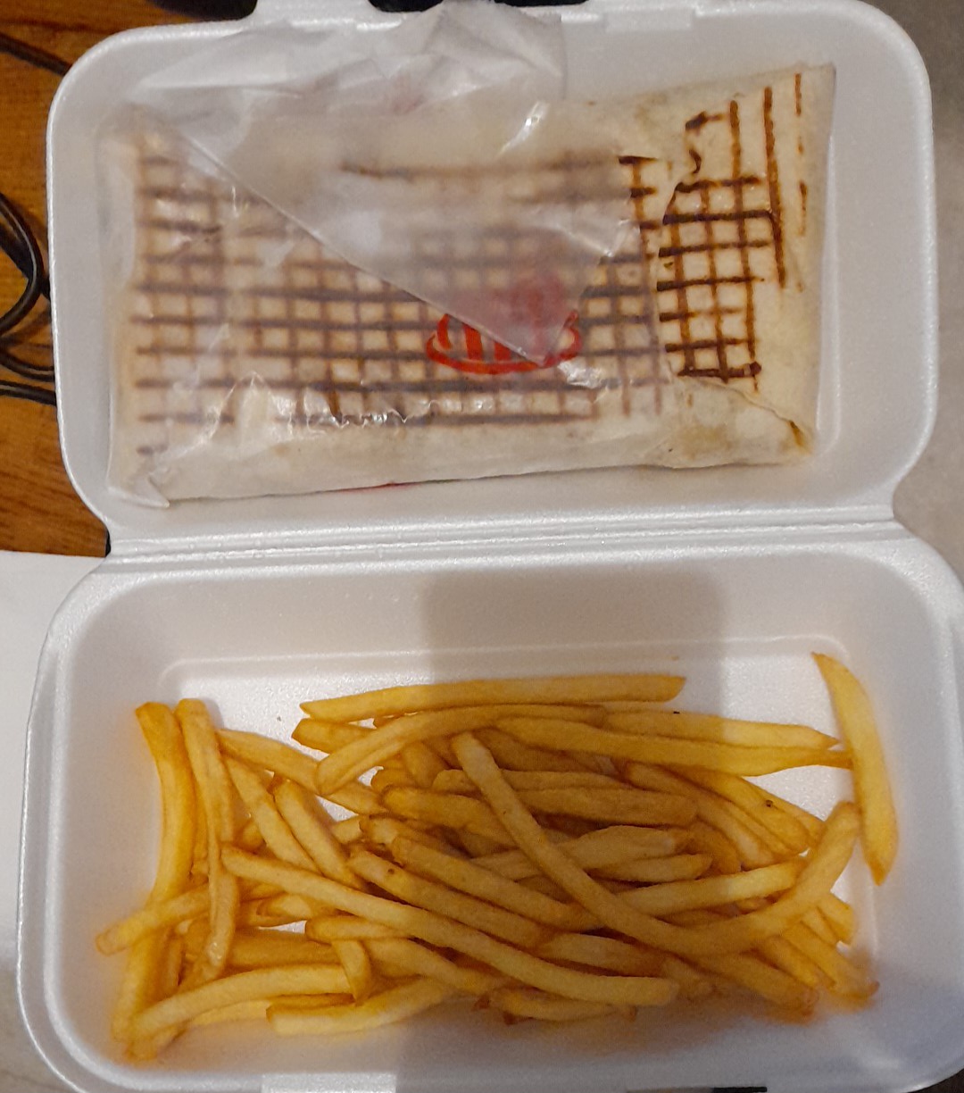 A première vue le tacos super gros donne envie mais le problème et qu'il y a presque que des frite dans le tacos malgré le supplément chèvre, lardon ils n'y a presque pas de viande de base j'ai pas commander un tacos pomme de terre une honte