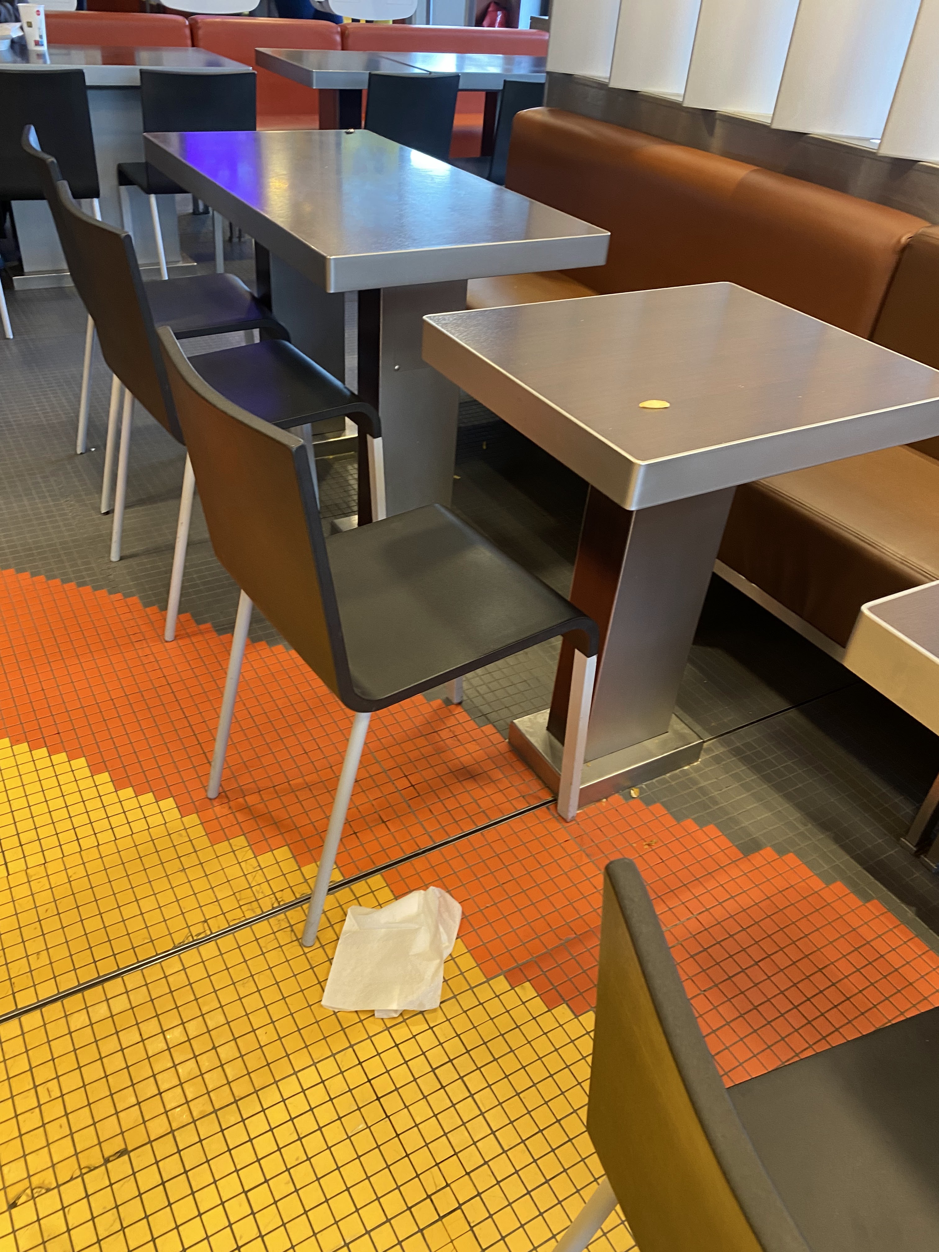 Il faudrait peut être revoir le personnelle... Merci l'amabilité franchement !!! Restaurant dégueulasse table pas nettoyer pourtant pleine après-midi un dimanche plutôt calme le sol on en parle même pas... Entre la bouffe et les papiers...!!! Sérieux en t'en que directeur j'aurai honte... Et en t'en quemplouer je baisserai la tête au lieu de faire la gueule.... Le pire mcdo que jais fait en général je prend au drive... Je viendrais plus ici !