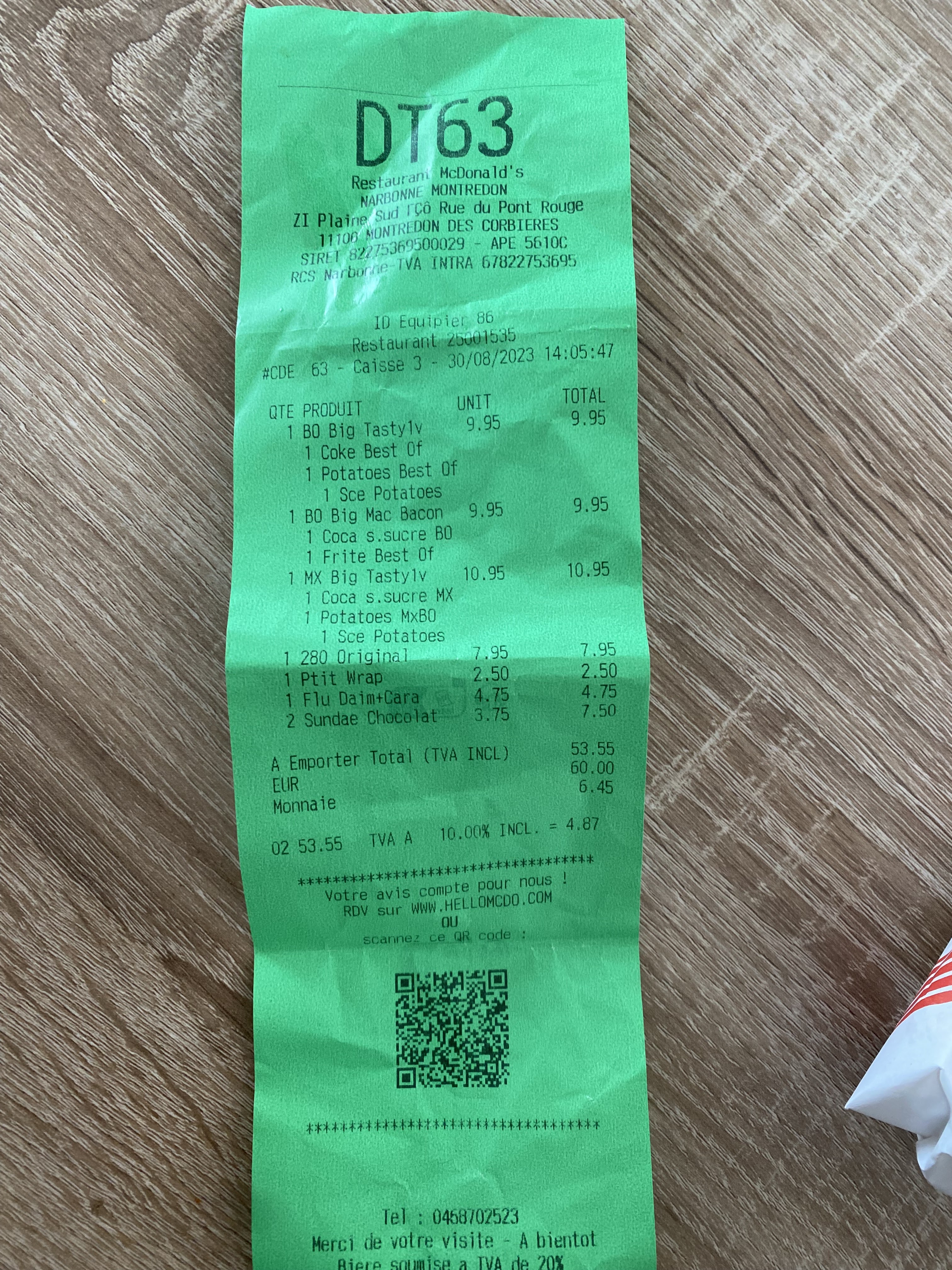Alors hier 14 mai à 17h je vais commander au drive 2 Big Mac au bacon j'en ai eu pour 11€30 et c'était pas pour moi. Je rapporte ça et mon homme se retrouve avec 2 doubles cheese bacon. DÉCEPTION. Déjà que ça fait très cher pour 2 pauvre Big Mac mais là !! C'est honteux. Moi ça fait longtemps que je ne vais plus au McDo car c'est devenu trop cher et moins bien servi et moins bon qu'avant. Dernièrement j'y allais rarement juste pour le big tasty mais il a changé aussi de format plus petit et hors de prix 9€.!!. Donc terminé pour nous le McDo sauf pour le menu à 5€ qui dépanne mais c'est tout.
