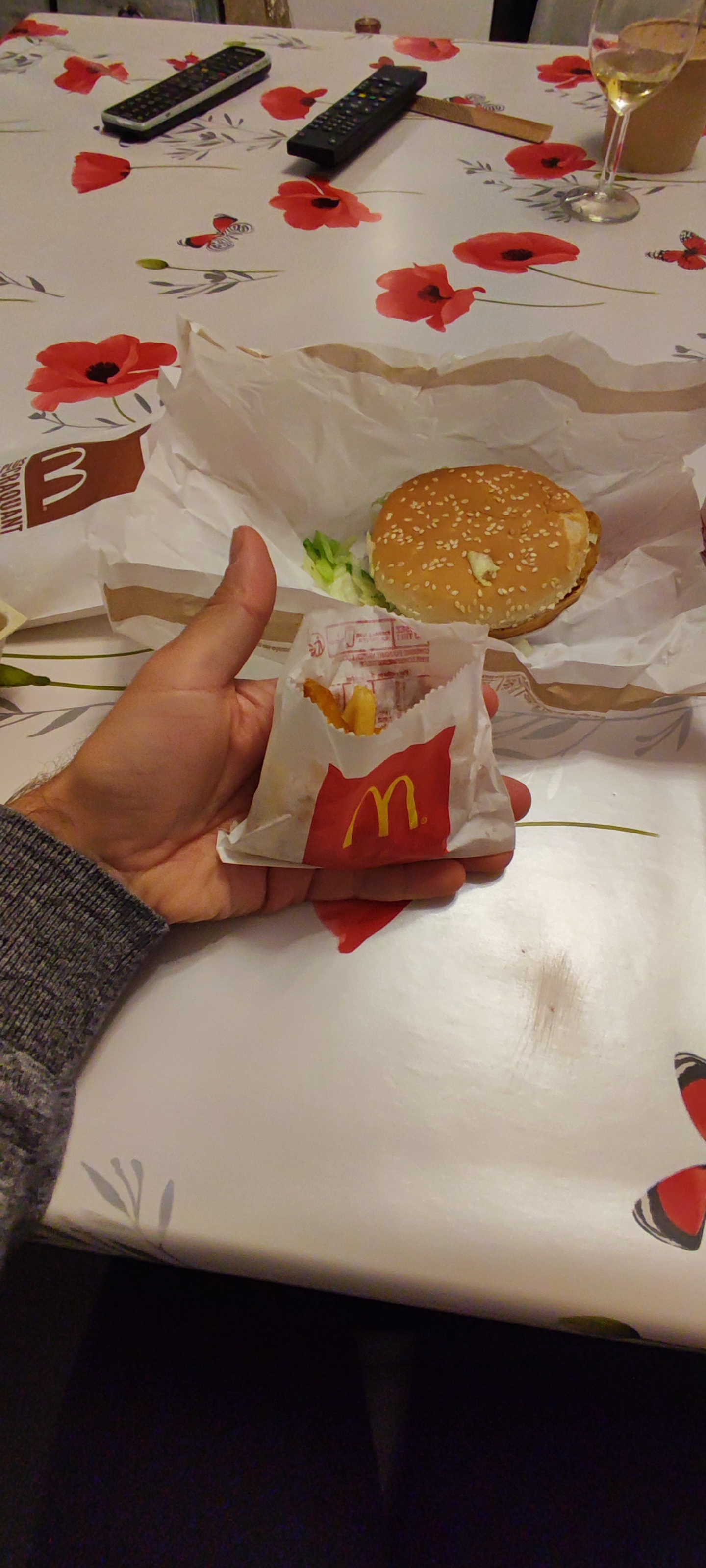 1ere fois : Manque hamburger 2eme fois : manque le steak dans le hamburger 3eme fois : La commande n'est pas la bonne ...25 euros pour 2 pauvres filets o'fish, un triple cheese et pas de dessert ... Il n'y aura pas de 4e fois... Que Mac Donald France réagisse : donnez leur une meilleure mutuelle pour que ces pauvres employés bénéficient d'un remboursement de consultations ophtalmologiques !