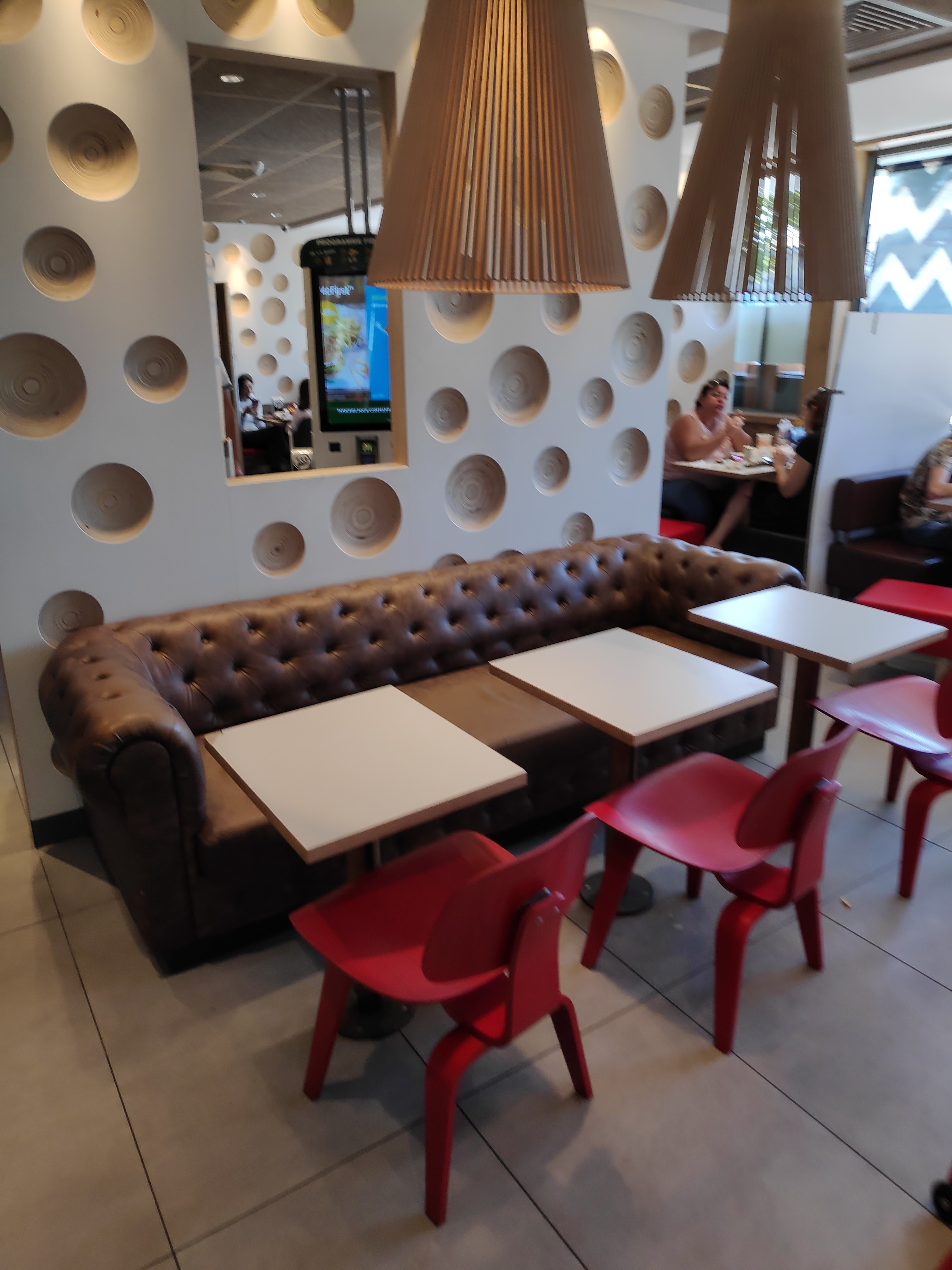 Tres Joliet Mc Do. Organisation de la salle's avec plusieurs ambiances differentes : canapes, tables differentes tailles aux couleurs nature... service à table tres agreable. Mais attention du coup les sandwich sont froids.... heureusement personnel tres reactif pour vous remplacer les mets refroidis.