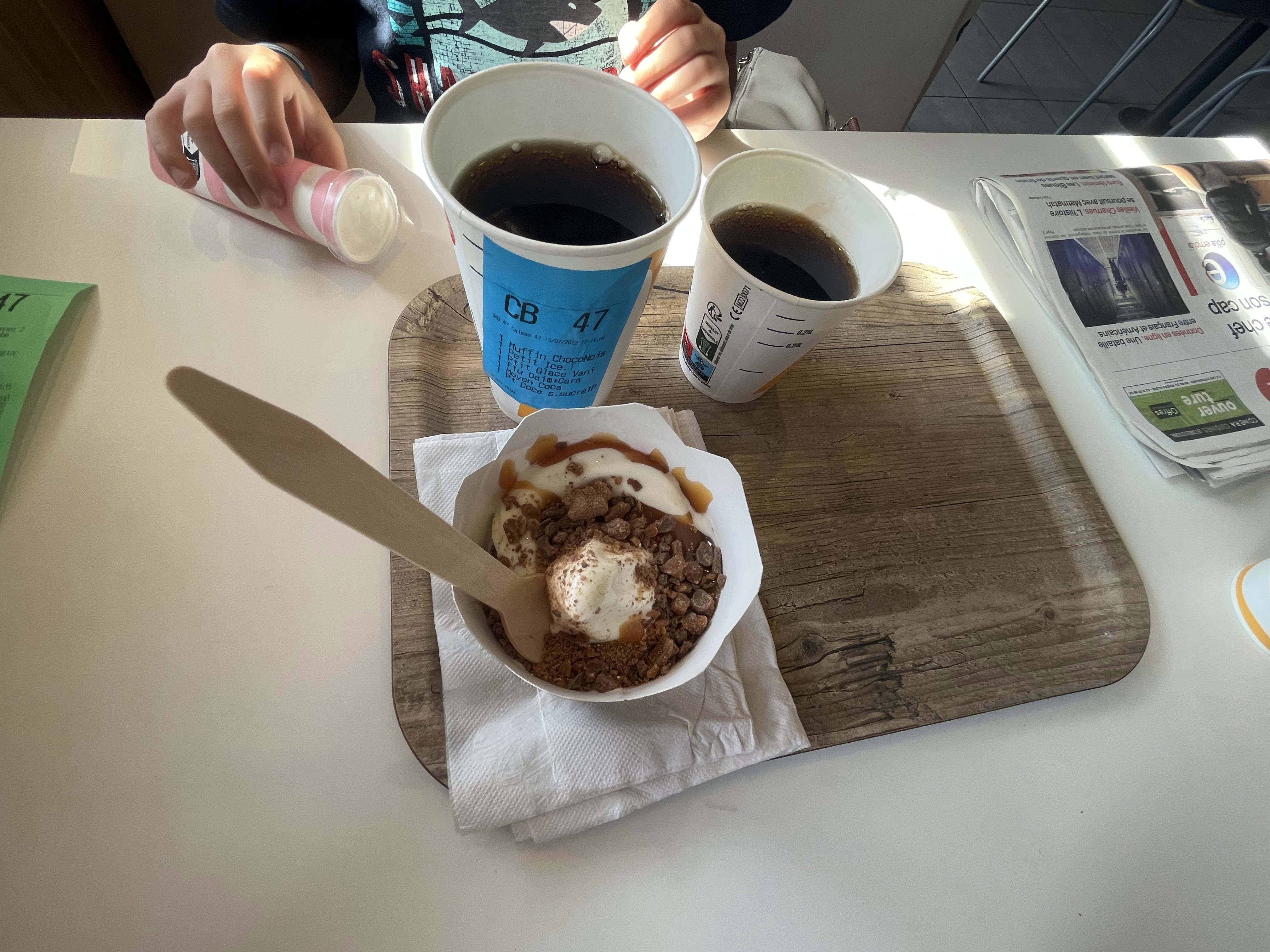 De mieux en mieux 20 minutes d attente pour 3 glace et 2 petit vrap c était la fête en cuisine ça rigolait, ça dansait et pendant ce temps là les glaces fondaient puisque elles étaient sur le comptoir depuis déjà 15 minutes, lors de la remise de notre commande nous avons fait remarqué à la charmante hôtesse notre mécontentement mais celle-ci a dénié nous écouté et d un sourire narquois nous a fermé la vitre au nez en nous laissant un vulgaire bon appétit. Il fut un temps où l éducation et la correction étaient de rigueur dans le commerce....... Quel dommage.......... .