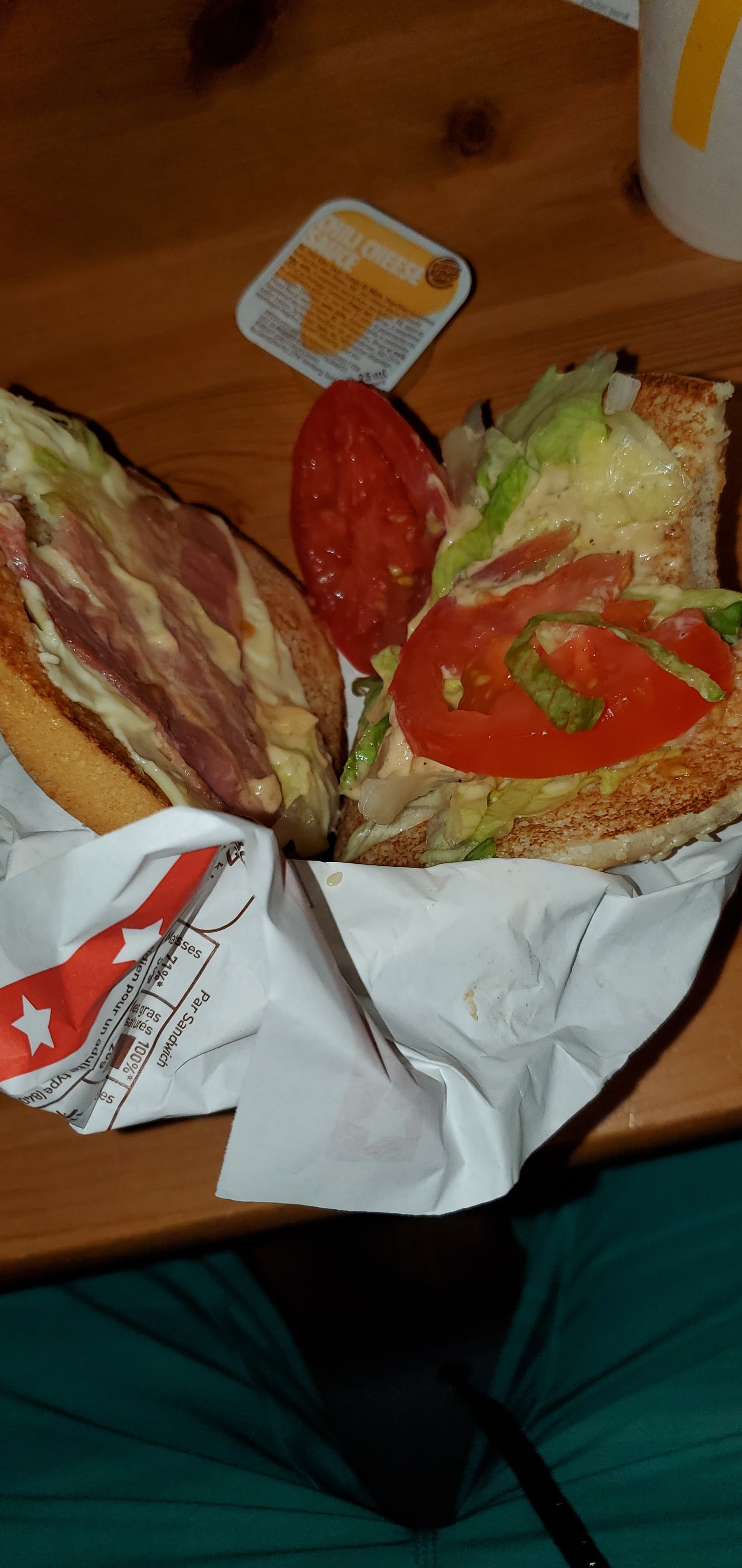 Régulièrement mon conjoint rentre et il manque des éléments à nos commandes. J'y suis allée moi même cette fois. Ravie que la commande soit complète, je rentre chez moi. Et finalement, mon ice-tea était percé et en parti vidé dans le sac... , et mes deux double cheese bacon étaient sans bacon ! J'ai reverifié sur mon ticket, j'avais bien commandé avec bacon. J'ai donc payé plus cher que je n'aurai dû. J'ai voulu appelé pour un geste, mais bien sûr, une messagerie m'indique qu'ils ne sont pas joignables...