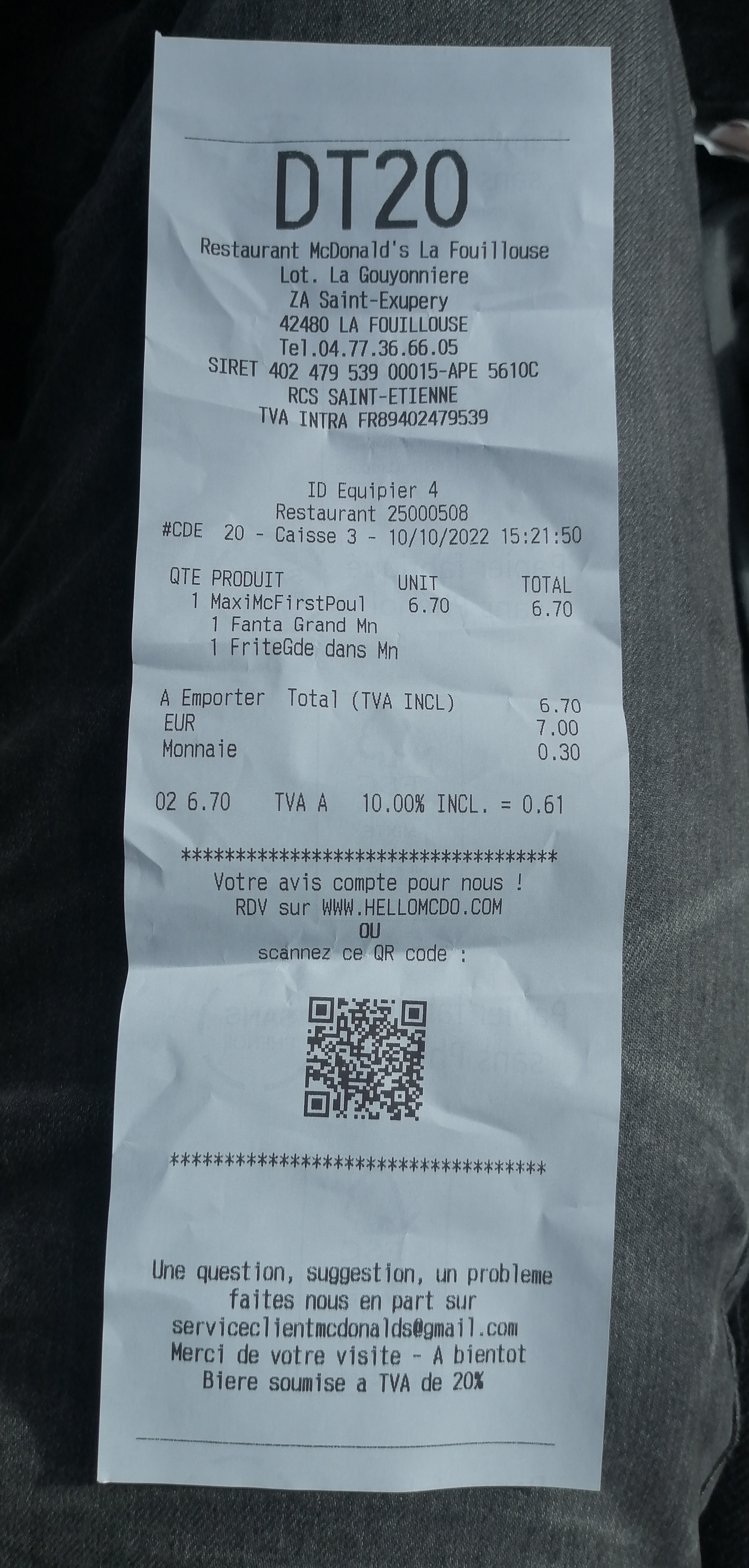 Merci aux équipes du Mac Donalds la fouillouse pour cette belle salade à 10€ sans couvert et aux croûtons mou ! En revanche jamais d’erreur pour encaisser... Éviter ce mc do !
