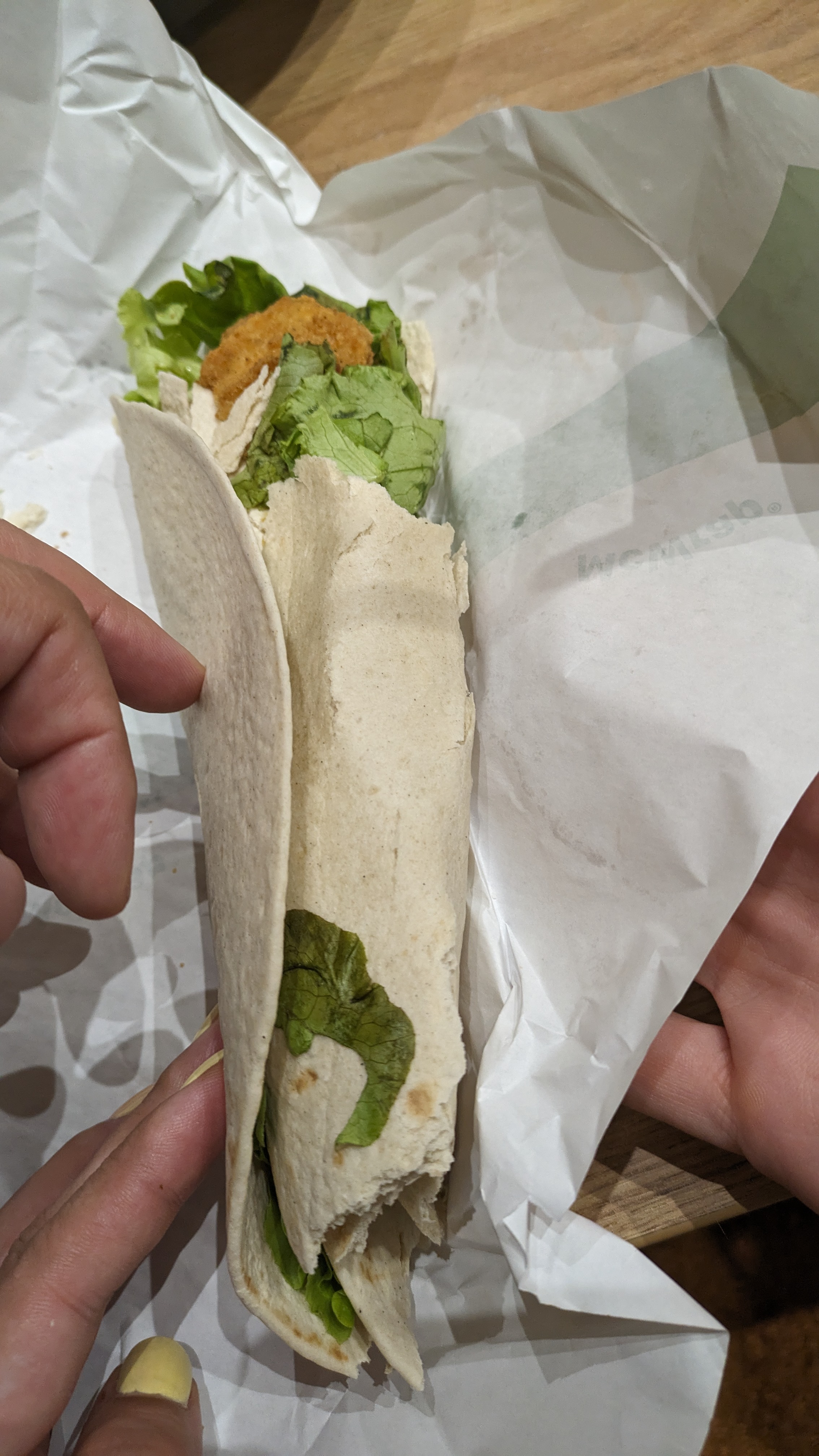 Encore une fois déçu par un autre McDonald vu la tête de mon p’tit wrap au chèvre qui sort comme ça de l’emballage (voir photo) et on me répond : « qu’est ce que vous voulez » !?!? Ba tout simplement un vrai wrap. Malgré qu’on soit dans un fast food, c’est un service de restauration. Choisissez bien votre métier ou même votre boulot étudiant mais en tout cas on le fait bien ou on le fait pas.