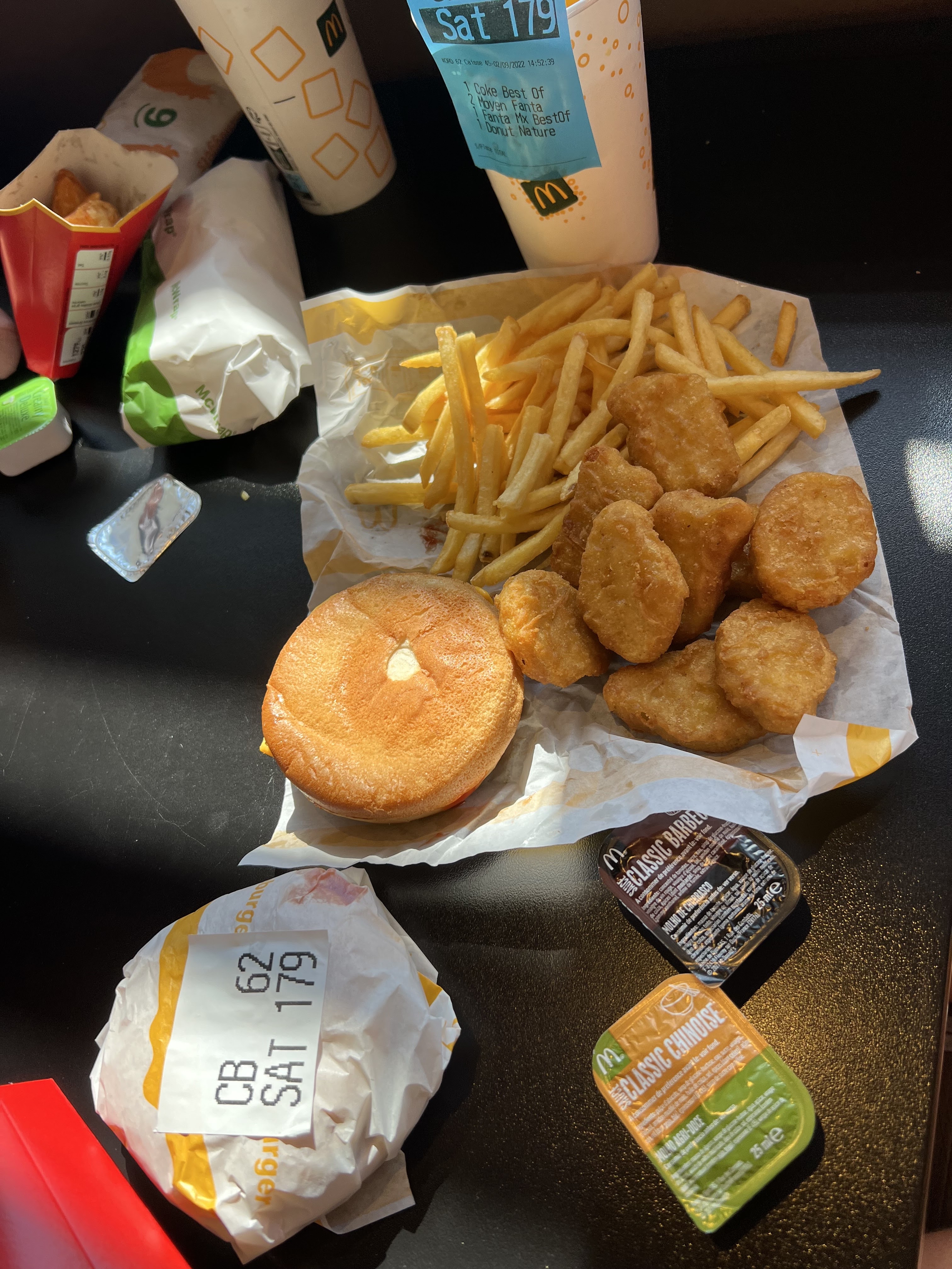 MDR la nourriture était froide et pas bonne. Après l'avoir rendu, nous l'avons récupéré à peu près pareil. Les assiettes étaient sales. peu importe, c'est Mc Donald's mais en fait le pire que j'ai vu jusqu'à présent 😂