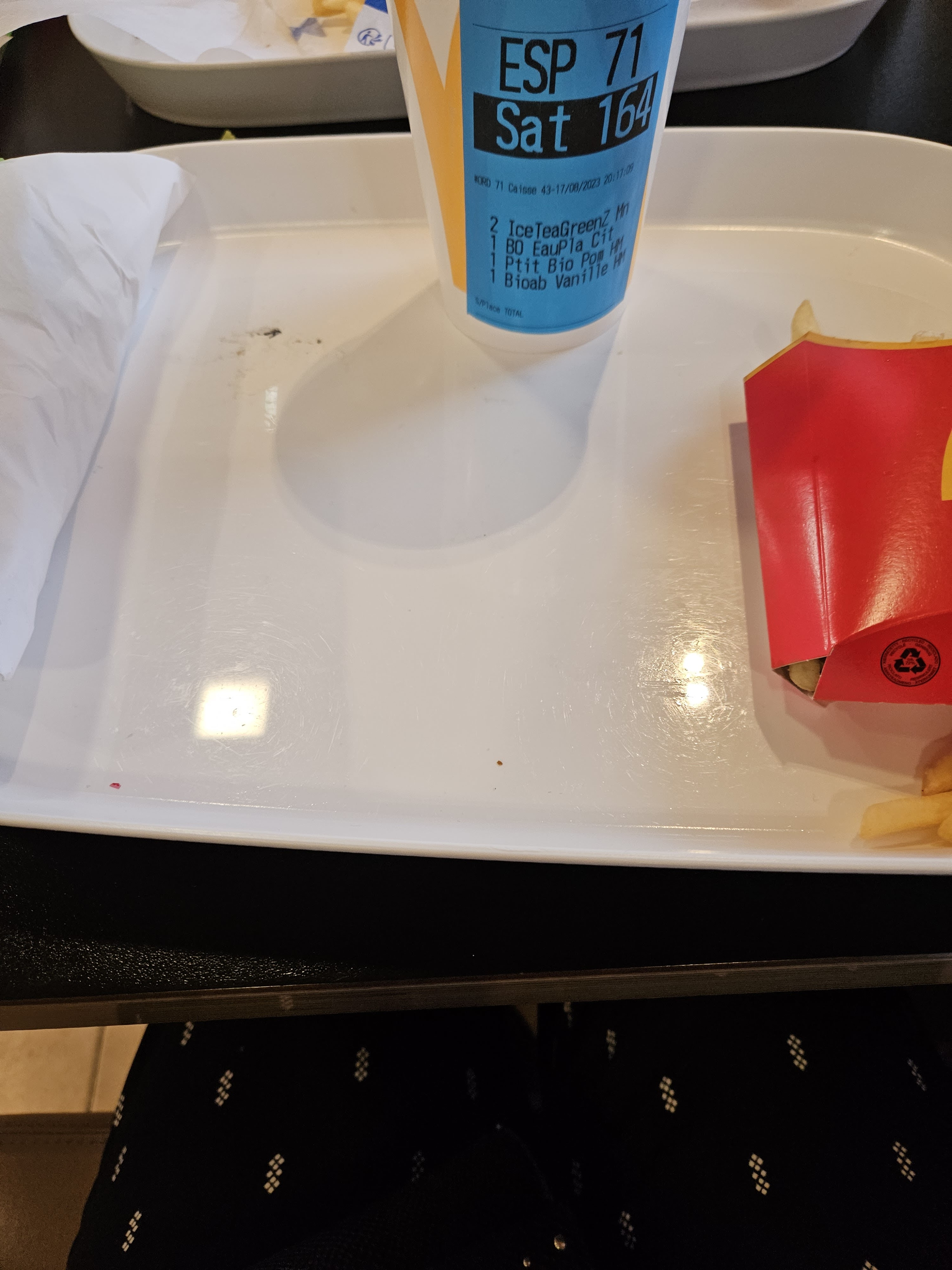 Que dire au sujet de cette pause bien méritée au McDonald de l’aire sur la D809, bien que possédant un Renault capture spacieuse, nous optons pour le repas sur place. Commande prise à l’aide d’un automate et chevalet en place..: En mode service à table ! Dans un premier temps déçu et surpris par l’absence de potatoes, je me laisse tenter, non sans quelques réserves par les nouvelles wavy fries, et je dois vous le dire, quel régal ! Menu mcfirst poulet, triple cheese sur la table et première déconvenue, le fromage n’est pas fondu (un grand classique chez les restaurants de la chaîne) et les frites pas assez chaudes bien que croustillantes, l’Isère a beau être une région où les températures descendent rapidement, la nourriture elle, se doit d’être à température raisonnable pour une dégustation optimale. Mention spéciale pour le fanta glaçons qui me fait vite oublier cette sombre histoire de fromage, repas agréable dans l’ensemble bien que quelque peu entaché par la fin de parcours aux toilettes ou trainaient ça et la des morceaux de PQ.