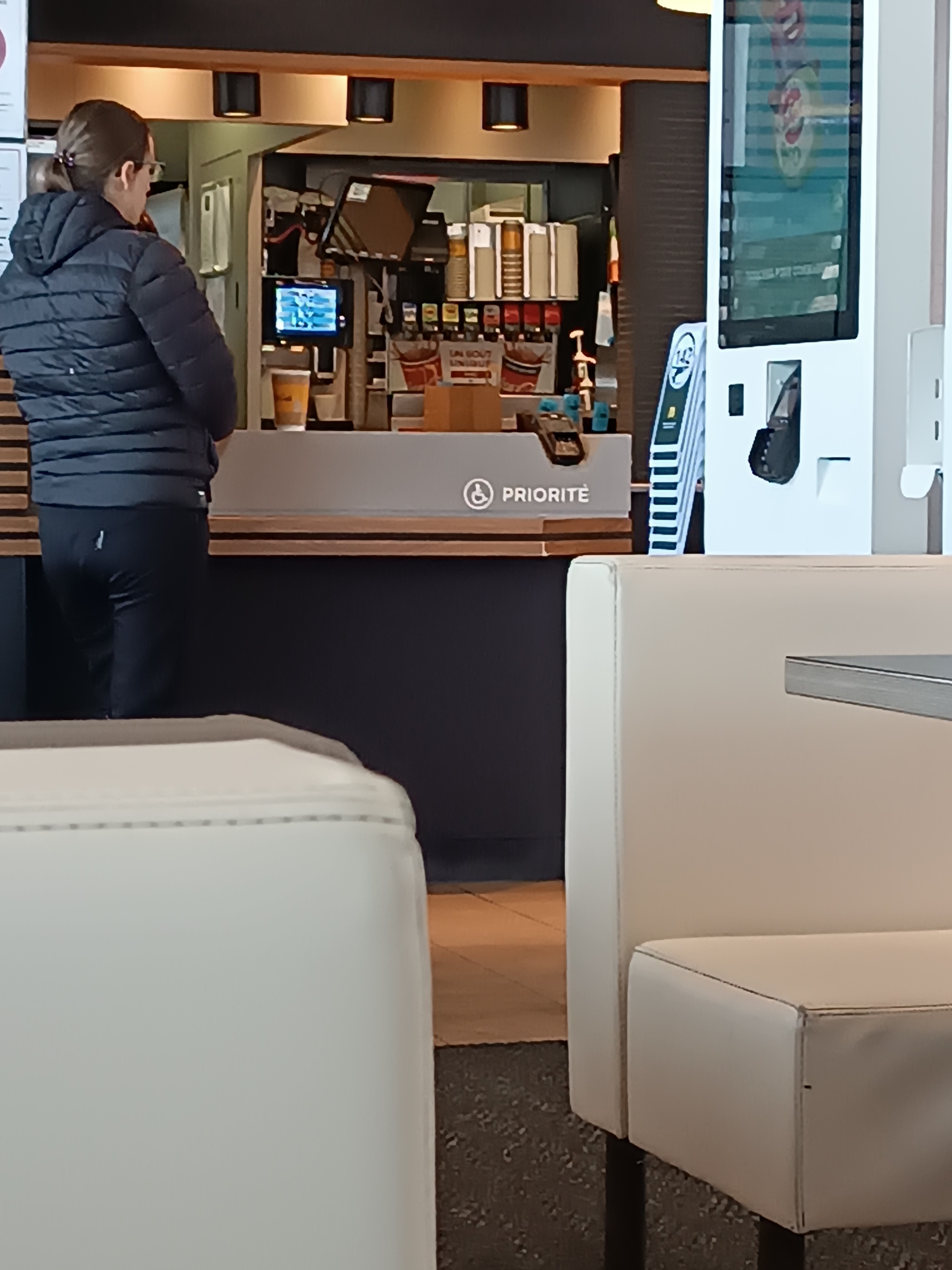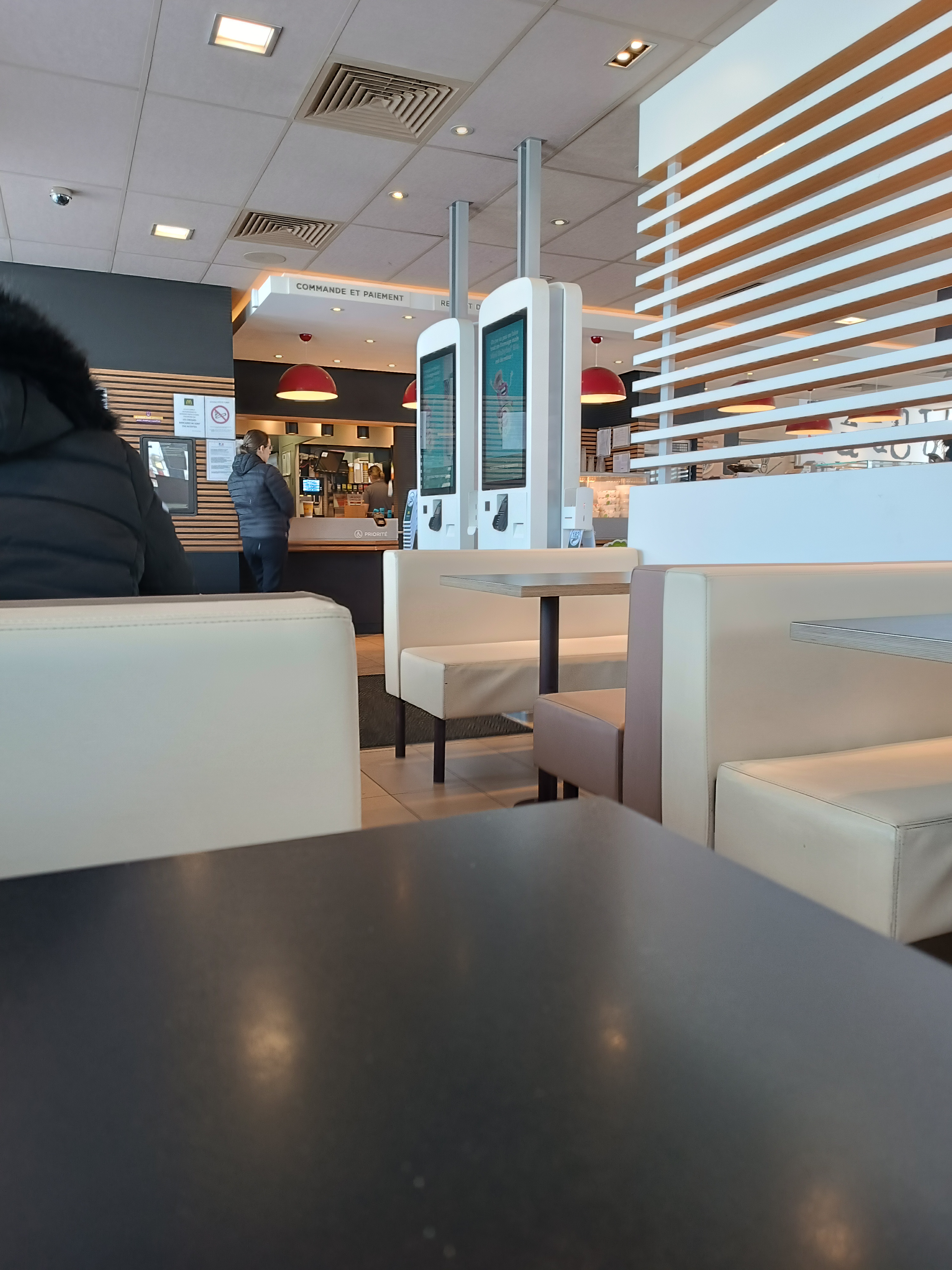 Lieu de passage consommation de café. Les bornes de commande sont pratiques pas d attente au comptoir. Le restaurant devrait faire quelques travaux les banquettes sont déchirées . Concernant la propreté très limite les tables ne sont pas nettoyées entre chaque passage, les banquettes non plus, frites tombées dessus... mieux vaut s arrêter dans une station service pour consommer un café.