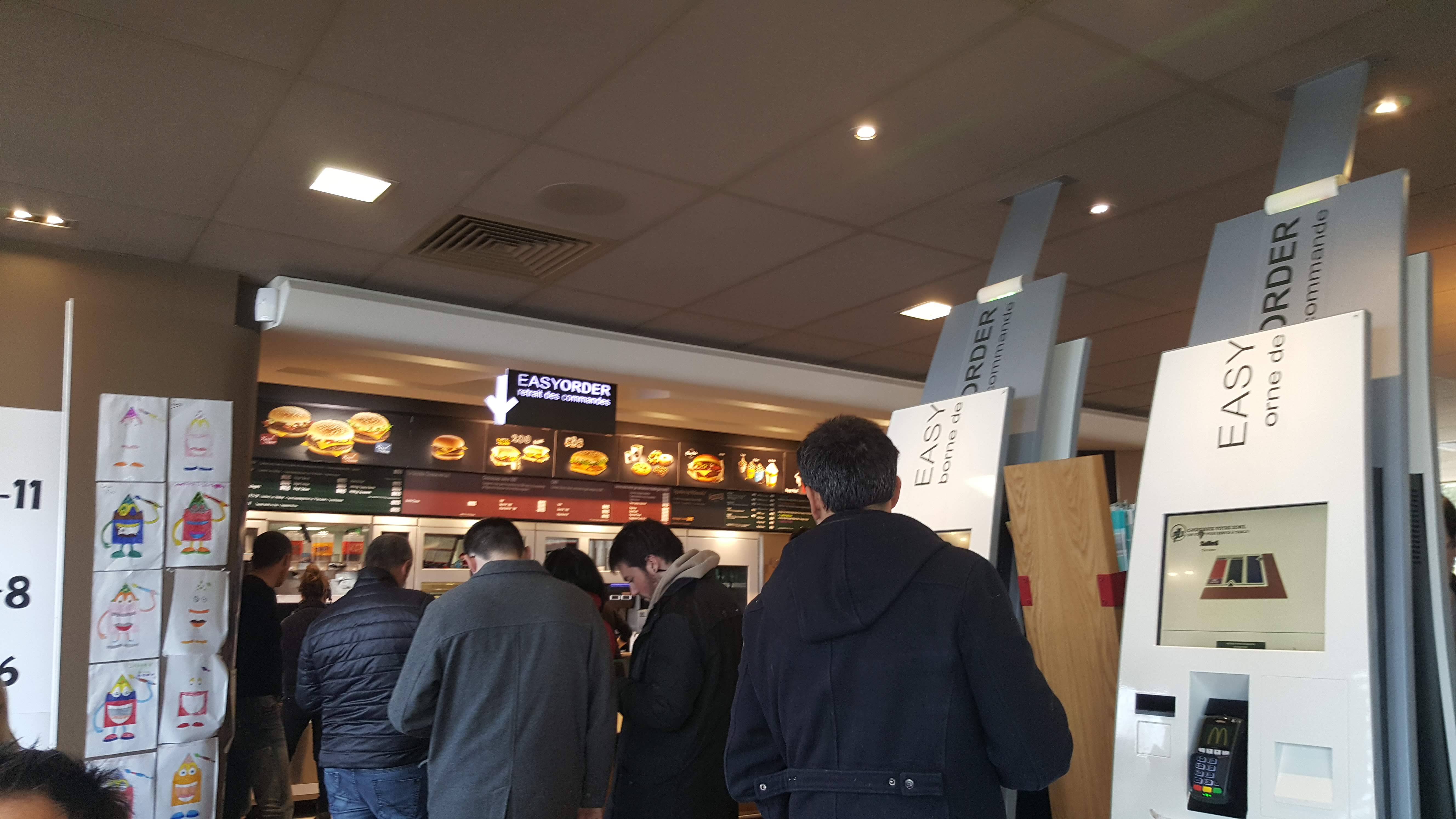 Il faut faire la commande soit même, tout le monde tripotte cet écran ou on comprend rien un monde fou. Repartie manger ailleur sans regret. Vu le monde et le temps d'attente et les odeurs....toujours pas réconcilié avec MC do et pas prêt de l'être. Faut vraiment mourir de faim pour aller là.