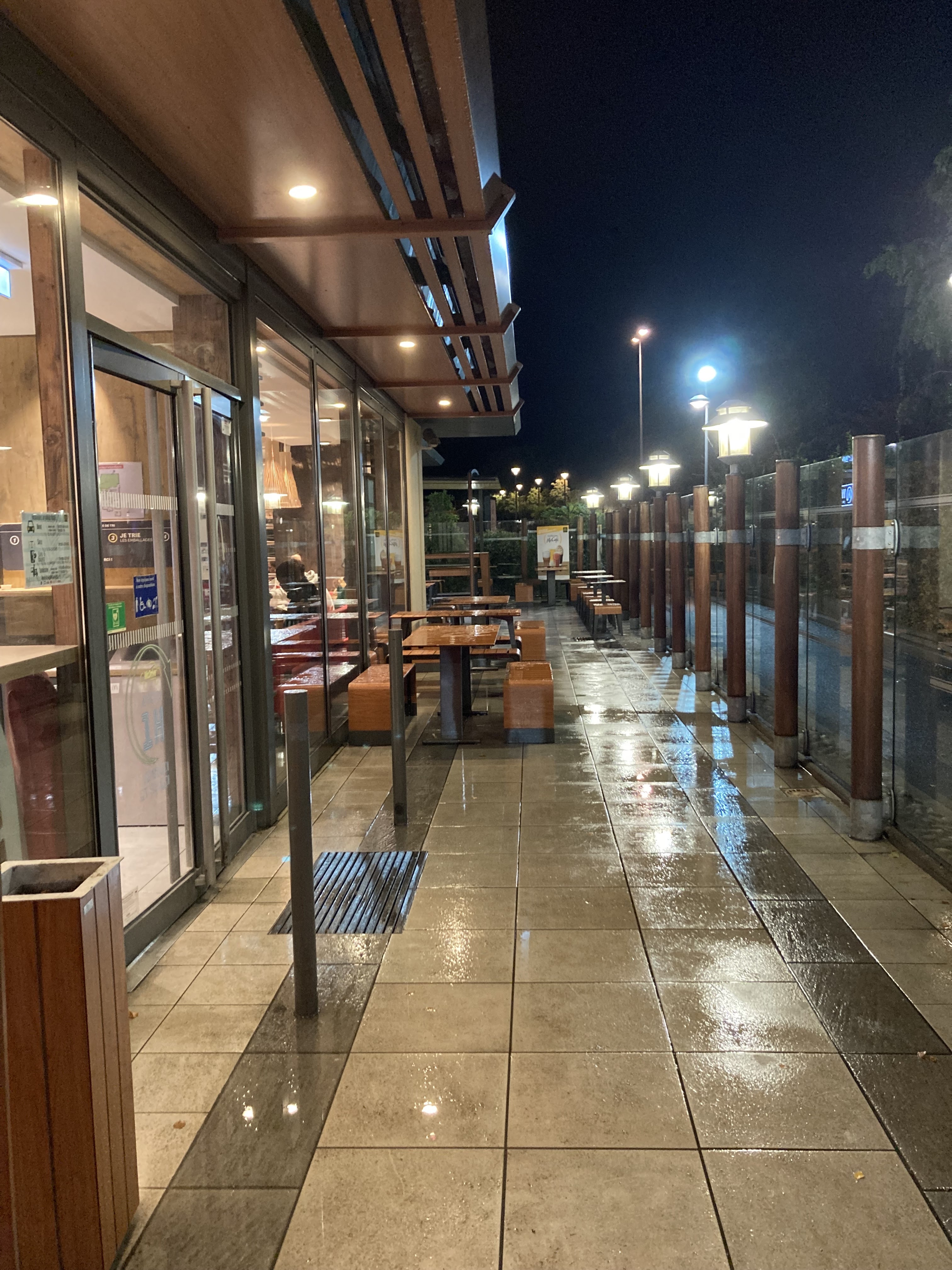 Très déçue de cet établissement. Étant sur la route de retour de vacances j'y fait halte. Il pleut, je rentre avec ma famille dont mon chien calme et tenu en laisse. Nous commandons à la borne et un employé me signale que mon chien doit rester dehors. Il pleut des cordes. Je suis donc contrainte de manger dehors, à peine abritée, un menu apporté froid sur une table trempée et sale. Il n'est pas mentionné à l'entrée du restaurant que les chiens ne sont pas admis et d'autres restaurants mac donald ont admis mon chien...je ne risque pas de revenir de sitôt