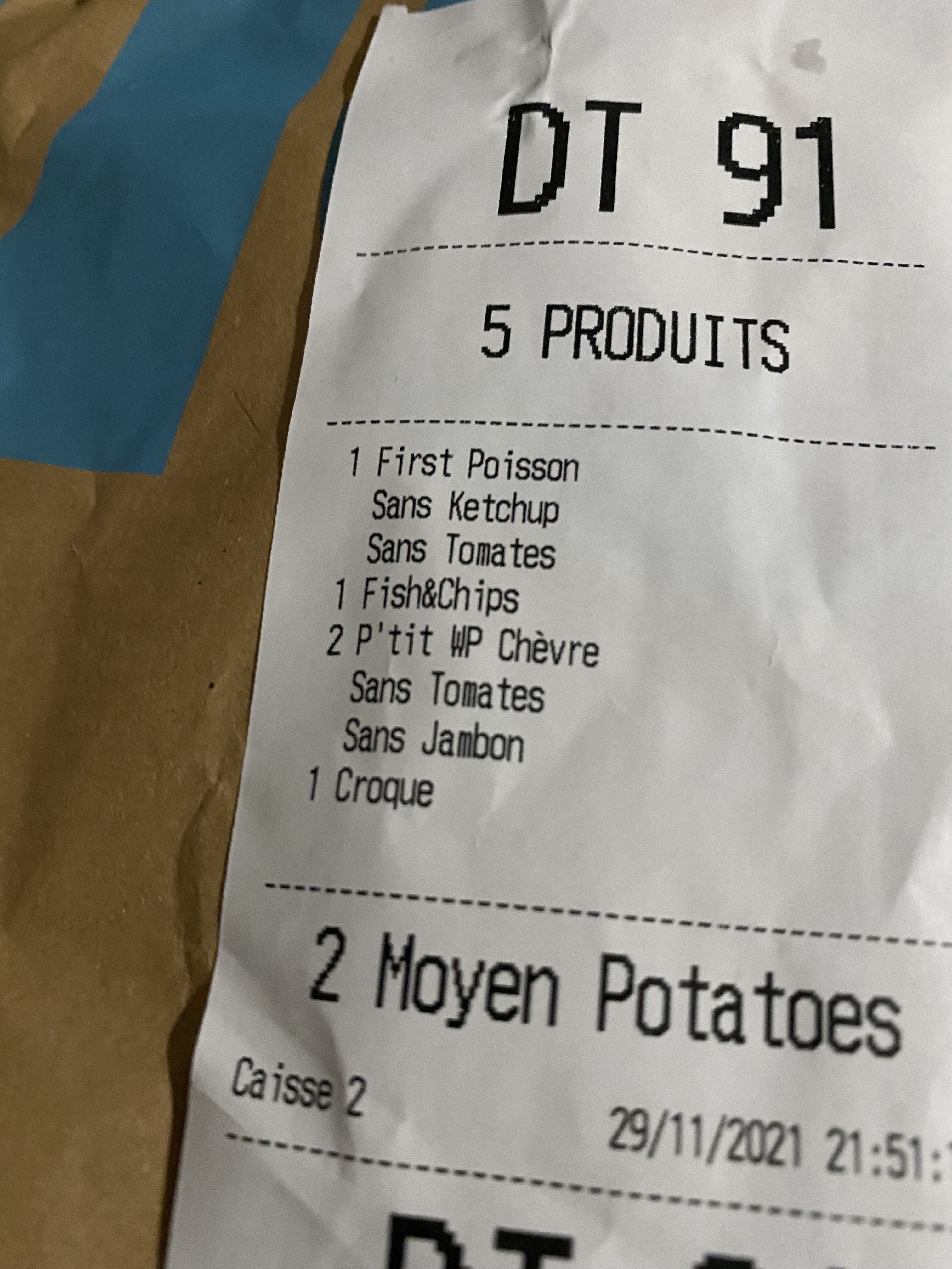 La commande ne correspond pas ce qui a était commandé (coca commander reçu ice tea, potatoes commander frite reçu). Le meilleur étant le pain de dessous étant a l'envers 👍