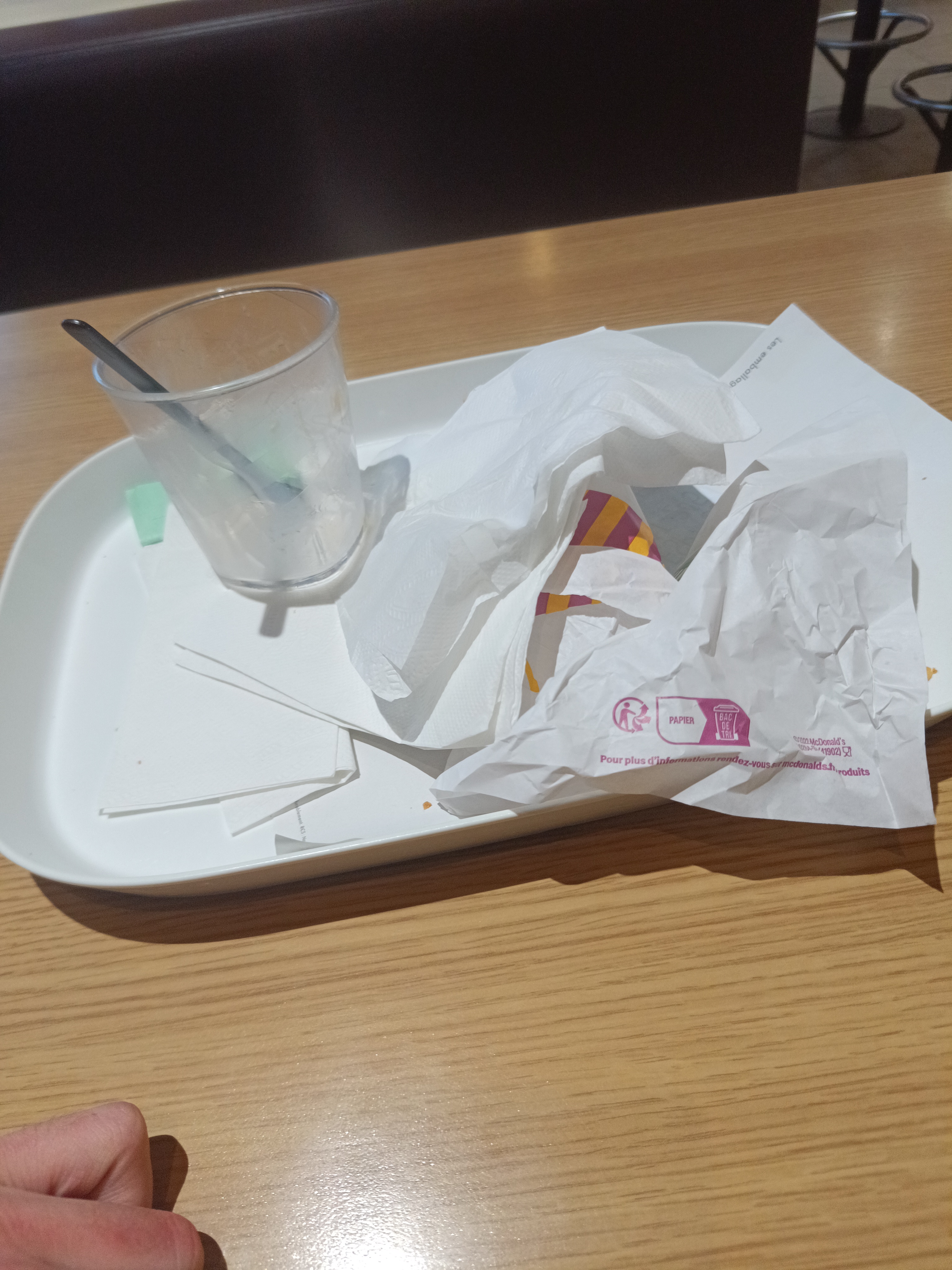 Bon rapide service à table possibilité d'emporter chez nous et un drive rapide à part les tables non et en temps et en heure on a juste dû demander à les nettoyer sinon propre bien et plusieurs poubelles