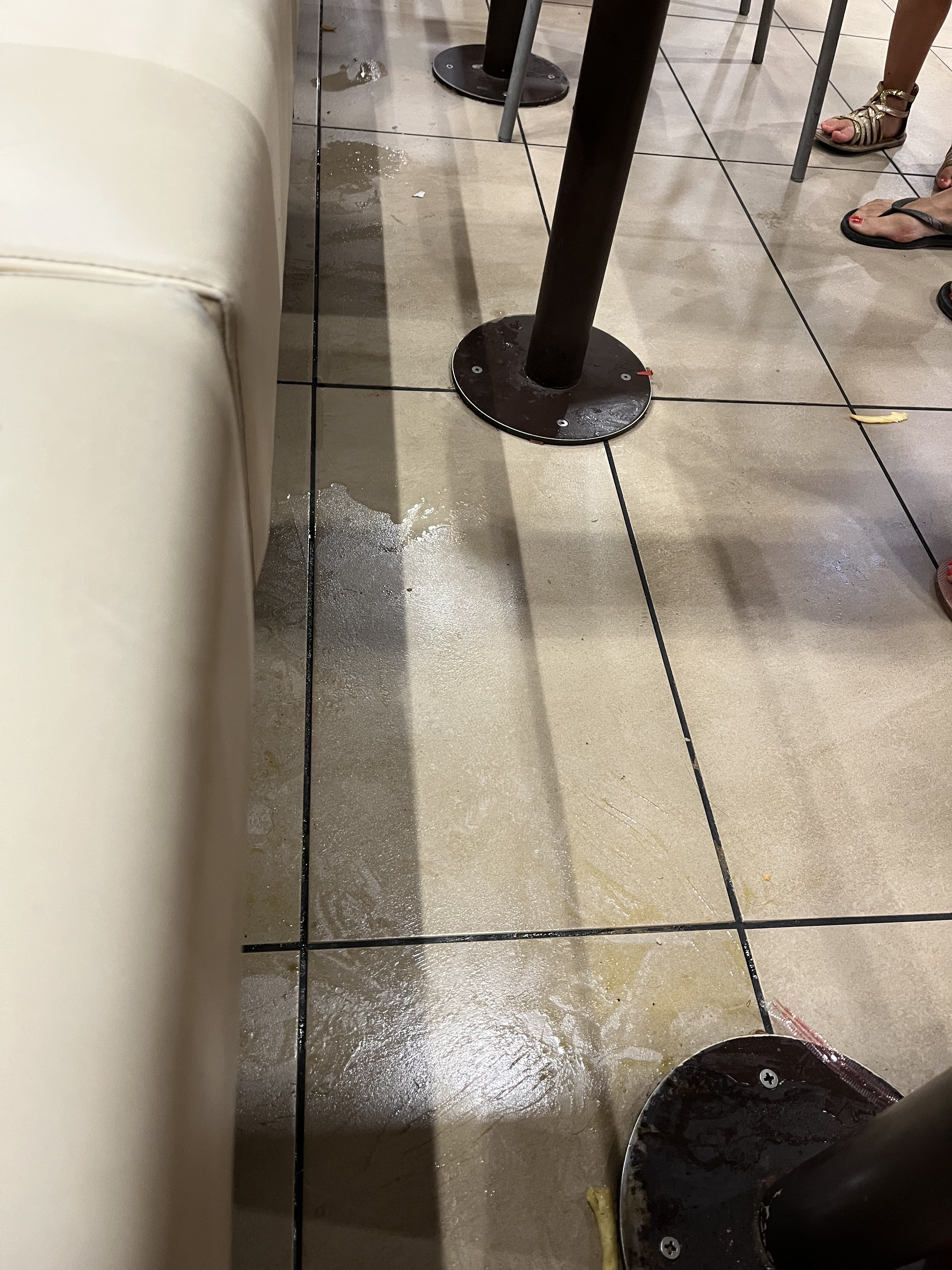 Restaurant à la limite de l'insalubrité. Sol collant, mouillé avec pleins de résidus et déchets. 95 % des tables non nettoyé avec des résidus de nourriture et détritus, collantes et pour les chaises et canapés il en est de même. C'est inadmissible pour un restaurant, la propreté devrait être là priorité. J'en ai parlé à la personne qui nous a servi mais durant les 40 minutes au restaurant, je n'ai vu personne nettoyer. INADMISSIBLE !!!!!
