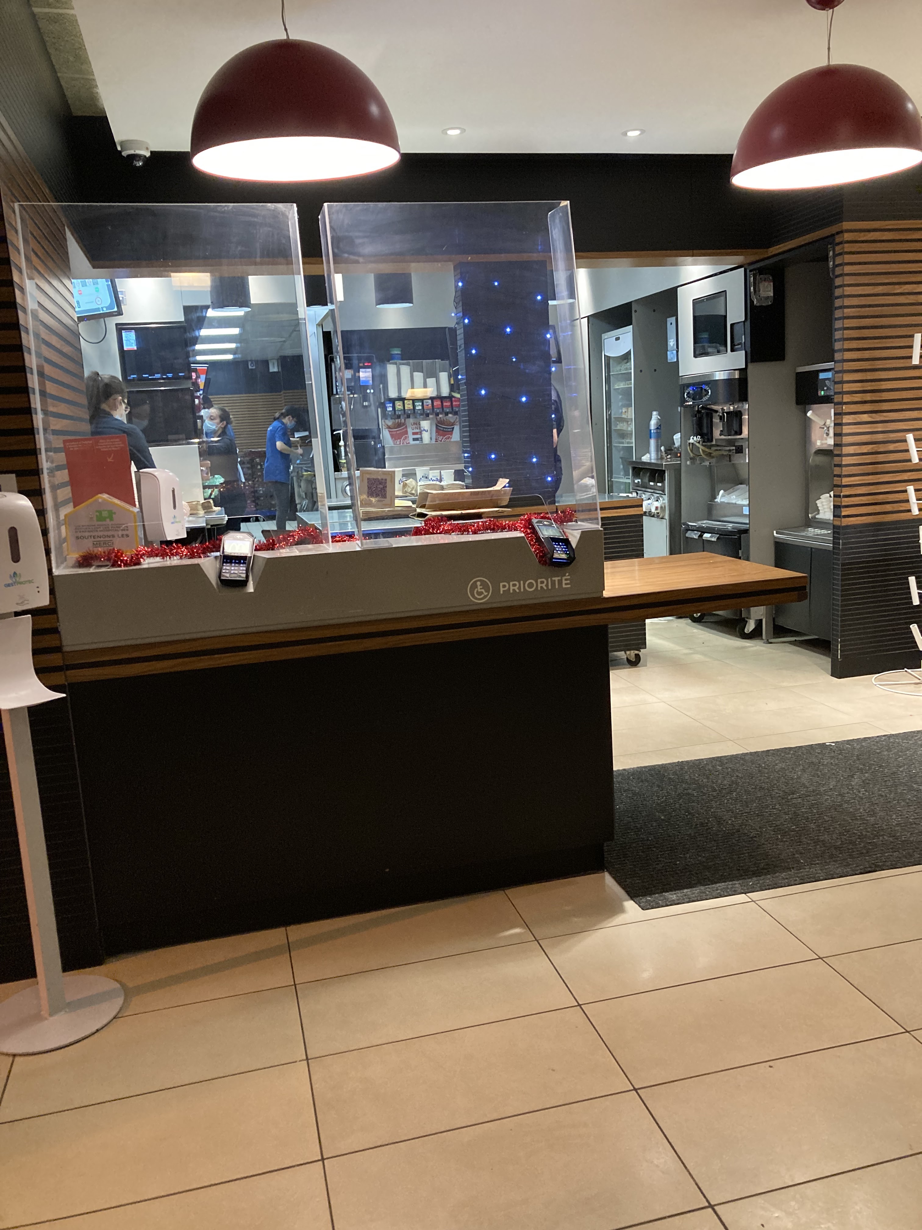 Plus de 12 minutes avant d'être servies. On remarque qu'une personne commence notre plateau et l'abandonne à ensuite: Frites arrivées froides idem un des sandwichs. On a donc redemandé des produits chauds. Saleté déplorables. Peu de monde sans le restaurant et pourtant les tables et chaises sont sales. Les toilettes sont très sales et pas de papiers dans les toiles handicapées.... Les murs et les coins des toilettes doivent être nettoyés