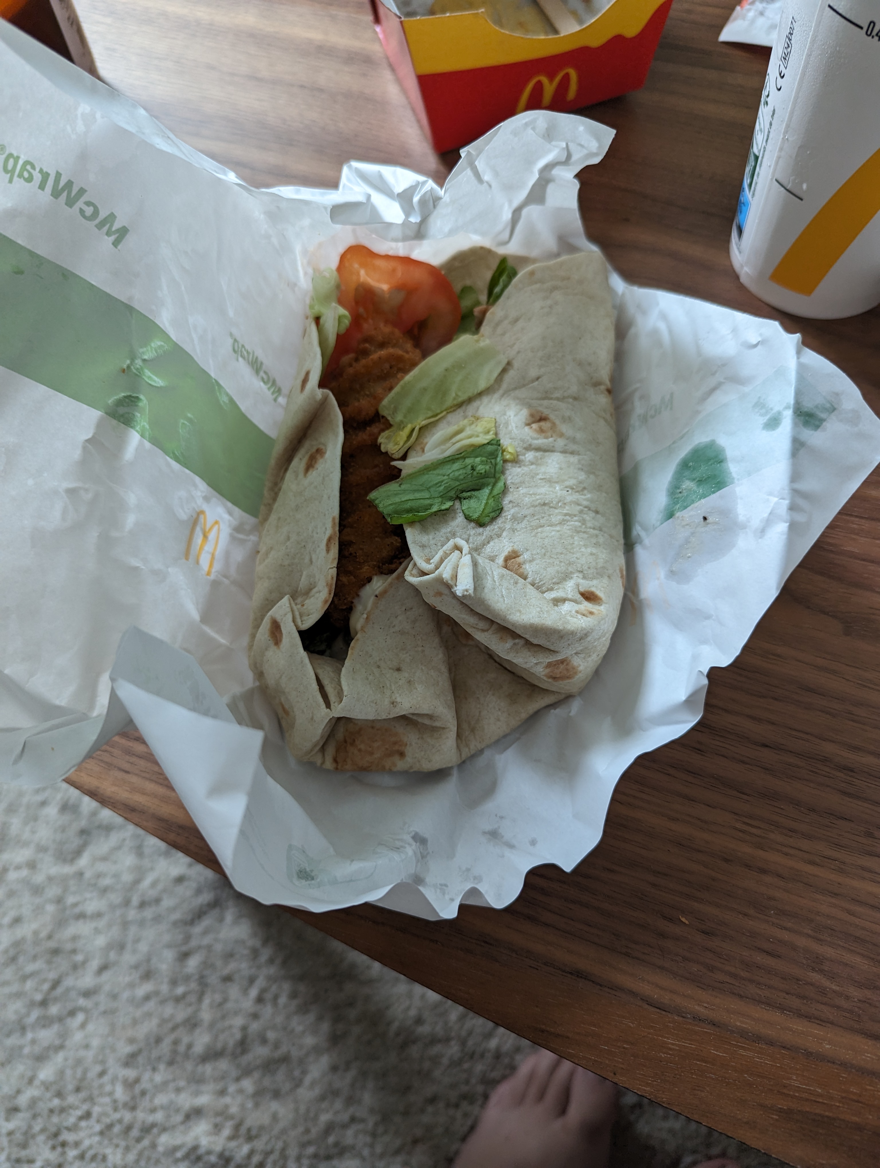 Étant résident à proximité de ce McDonald's, nous avons l'habitude de nous y rendre, principalement via le drive. Malheureusement, l'expérience varie considérablement à chaque visite. Parfois, nous avons la chance de tomber sur une équipe accueillante, avec une nourriture de qualité et des commandes complètes. D'autres fois, cependant, l'accueil est glacial, les employés sont désagréables et les plats sont médiocres. Lors de ma dernière visite, l'attente a été interminable et l'attitude du personnel plus que déplorable. Voici une photo du wrap que j'ai reçu, qui ne correspondait en rien à ce qui est attendu. En résumé, si vous décidez de visiter ce McDonald's, armez-vous de patience et de chance.