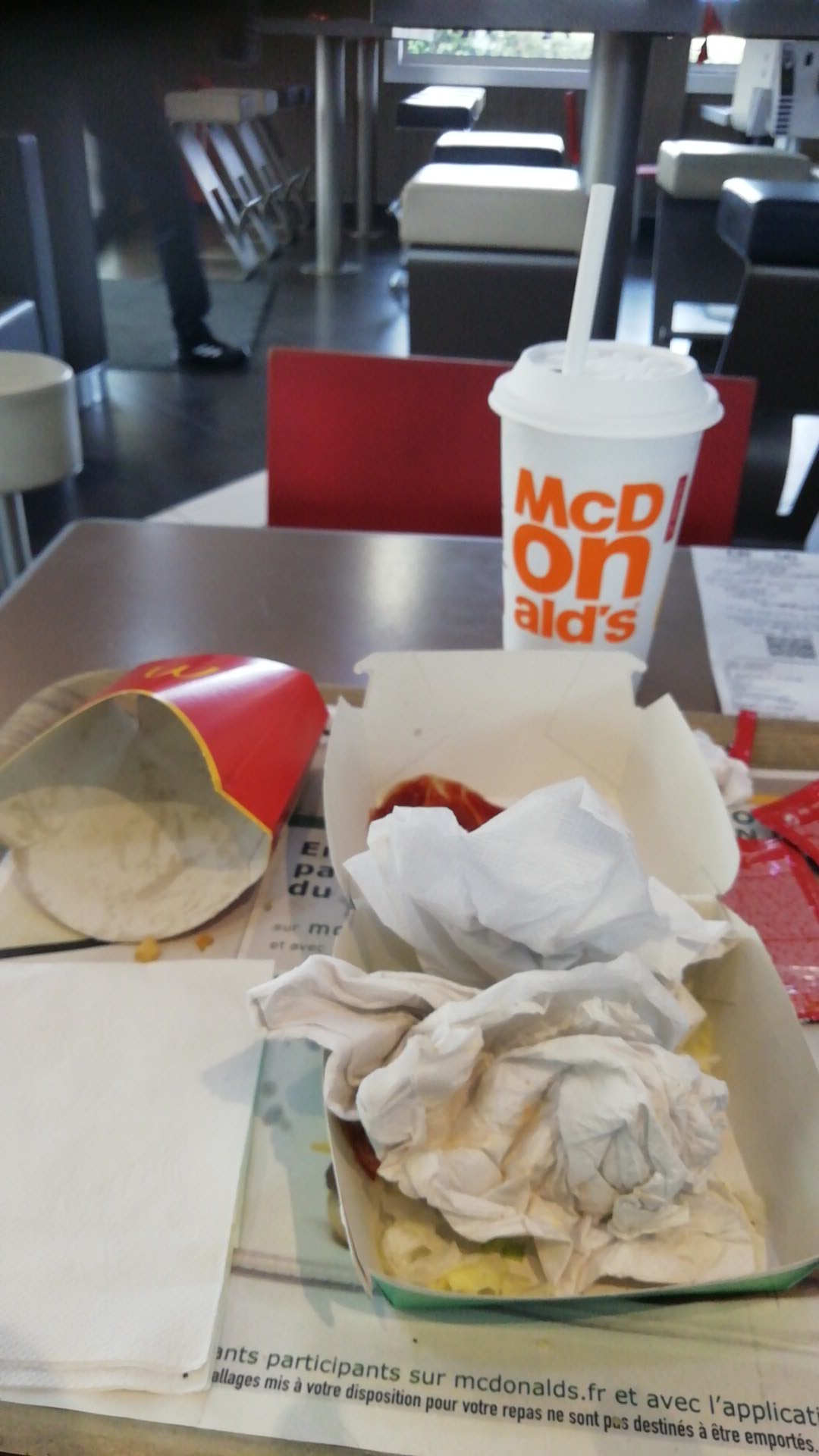 L odeur mélangée de je ne sais quoi (Burger, frites, graisse, poubelle) n est pas agréable. Toujours l impression que le mobilier est sale (collant). Ce n est pas agréable, je ne suis pas à l aise quand je mange au mc do à cause de ça. Par contre, tres bonne idée le tri dechet puis recuperation de la vaisselle. J ai trouvé ça top. Le sunday au caramel est toujours aussi délicieux 😋
