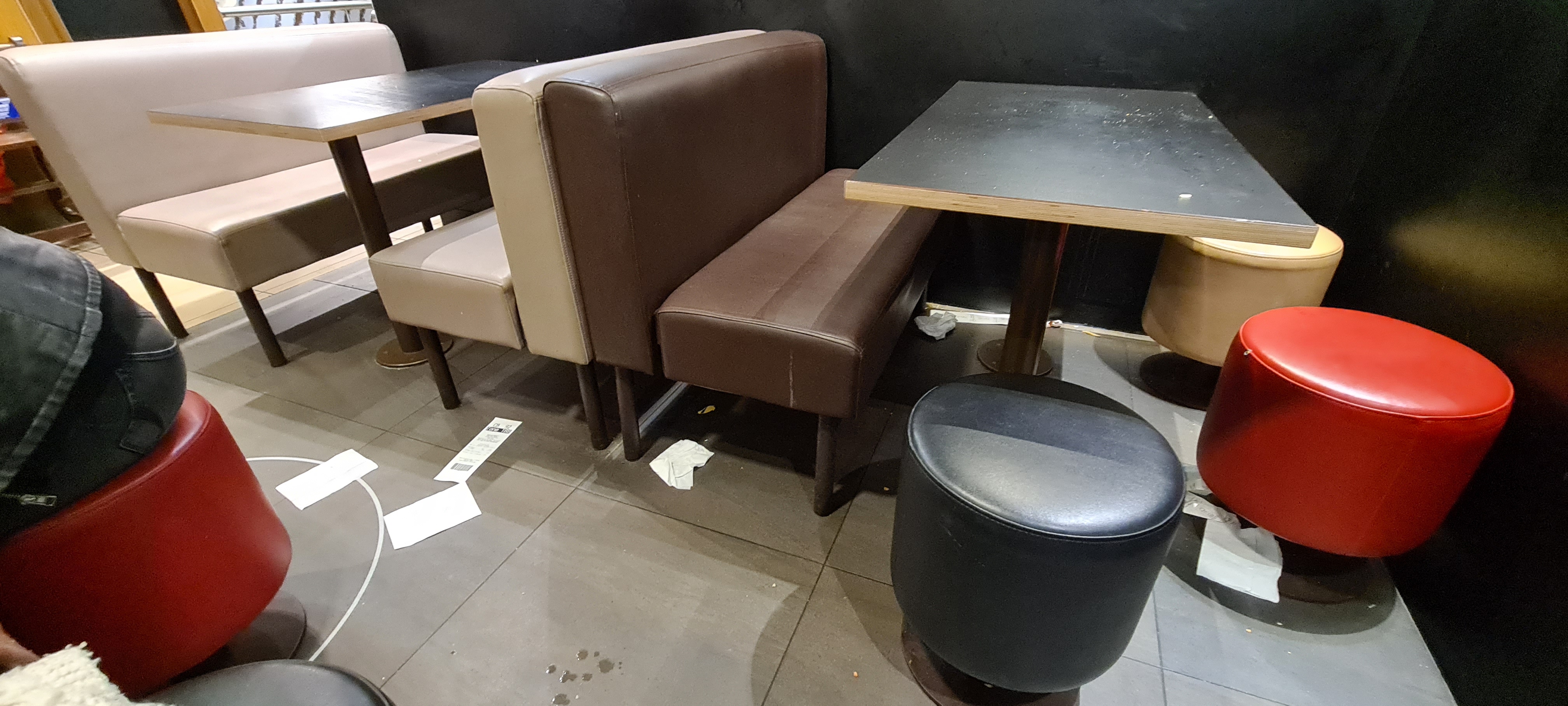 Vraiment sale, et pourtant en dehors d'une heure de rush. Ça s'explique facilement : Nous avons aperçu un employé effectuer le nettoyage des tables environnantes, il n'a passé qu'un coup rapide et a laissé des saletés sur toutes les tables, et les banquettes n'ont même pas été considérées, ça ne donne pas envie de s'y asseoir ...