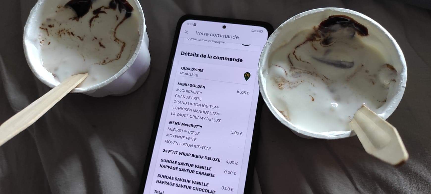 Mon conjoint vous a déjà laissé un avis et je vais faire la même chose, quand on commande un sundae chocolat et un autre au caramel, il est où votre problème avec le caramel ? On a eu 2 au chocolat.... donc lui il disait trois petites erreurs trois commandes en ligne bah on va en rajouter une... Je vous envoie même la photo, je ne vais pas parler des cacahuètes oubliées ça ferait une erreur de plus à rajouter...