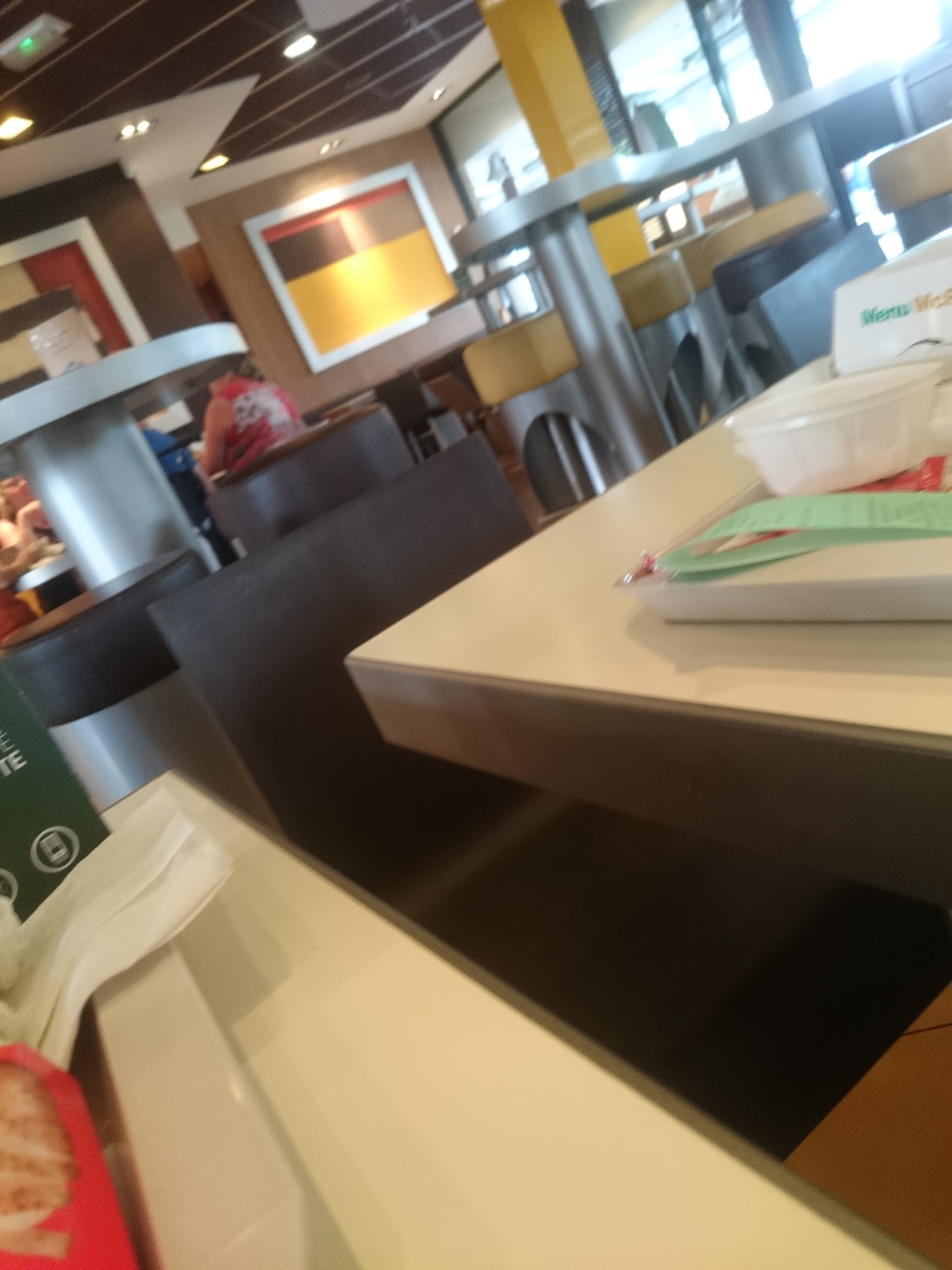 Un peu écoeurée. Comme il y a des panneaux interdit partout sur les tables, les gens ne trouvent pas de place. Résultat une nana que je ne connaissais ni d'Ève ni d'Adam est venue se poser de façon très grossière, sans un mot, juste en face de moi sur la petite table où j'étais tranquillement en train de manger, à 30 cm de moi !!! Ça m'a coupé l'appétit et j'ai abandonné ma place sans finir mon repas. Alors qu'il y avait plein de tables libres plus loin. Sans parler du personnel qui vous pose (ou plutôt balance) le plateau et commence à dire Bonjour. Bon... Et qui finit, trois mètres plus loin et sans vous avoir jeté un oeil, déjà reparti, appétit et bonne journée. Pas la peine de se donner la peine de dire merci, la personne est déjà retournée en arrière-salle. 🙄 Ah et bien sûr l'une des rares tables libres quand je suis arrivée pour m'installer n'était pas propre. Mais bon ça c'est courant dans les Mac Do... Expérience fort peu agréable pour moi ce midi, donc.