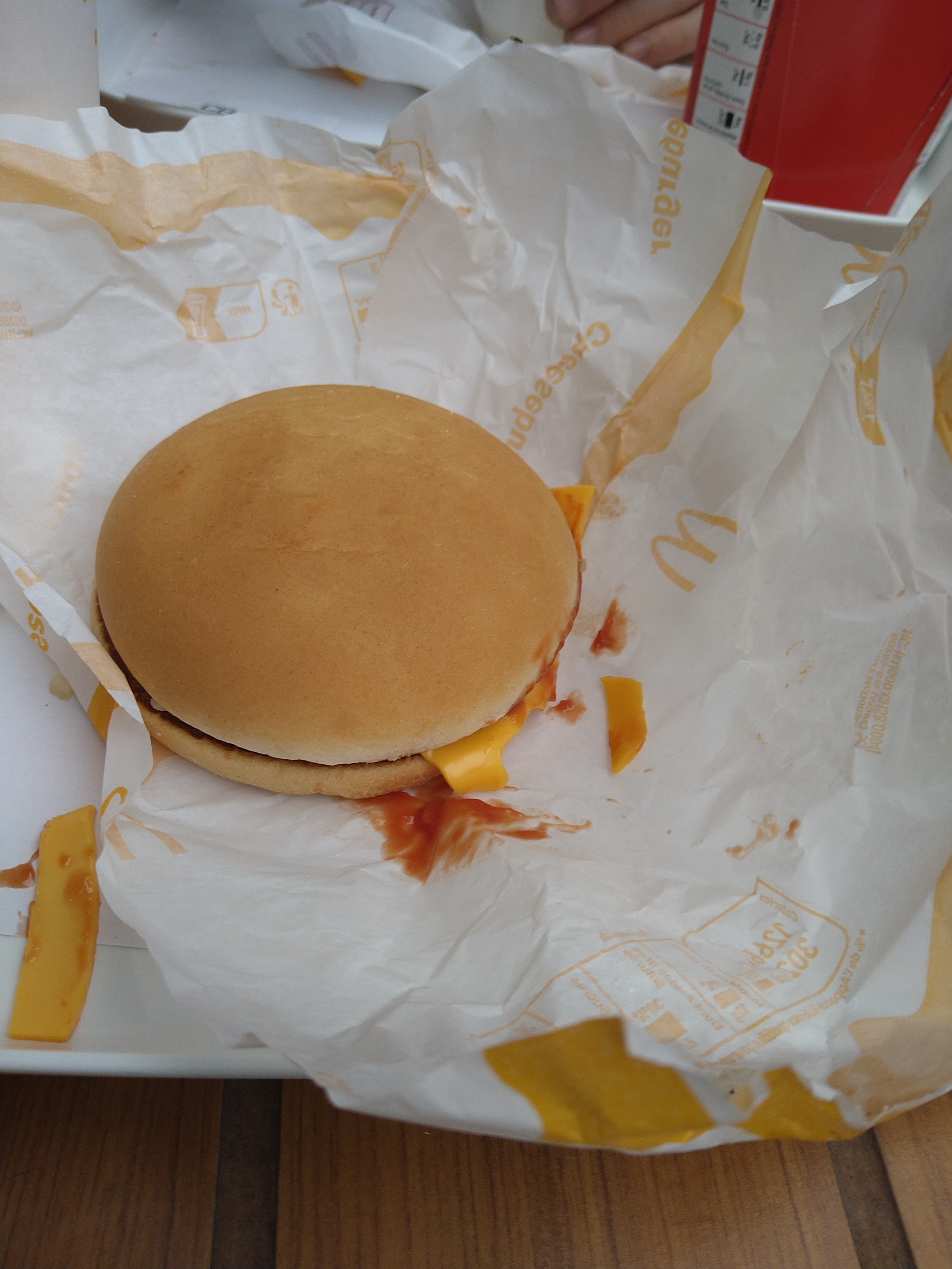 Nous avions commandé un ice tea mais on a eu un coca à la place. De plus mon pain de cheeseburger est cramé , à la place du uno dans le happy meal on a eu un vieu blokus nul, et mon cheese a vomis dans son emballage parceque il y avait du fromage partout