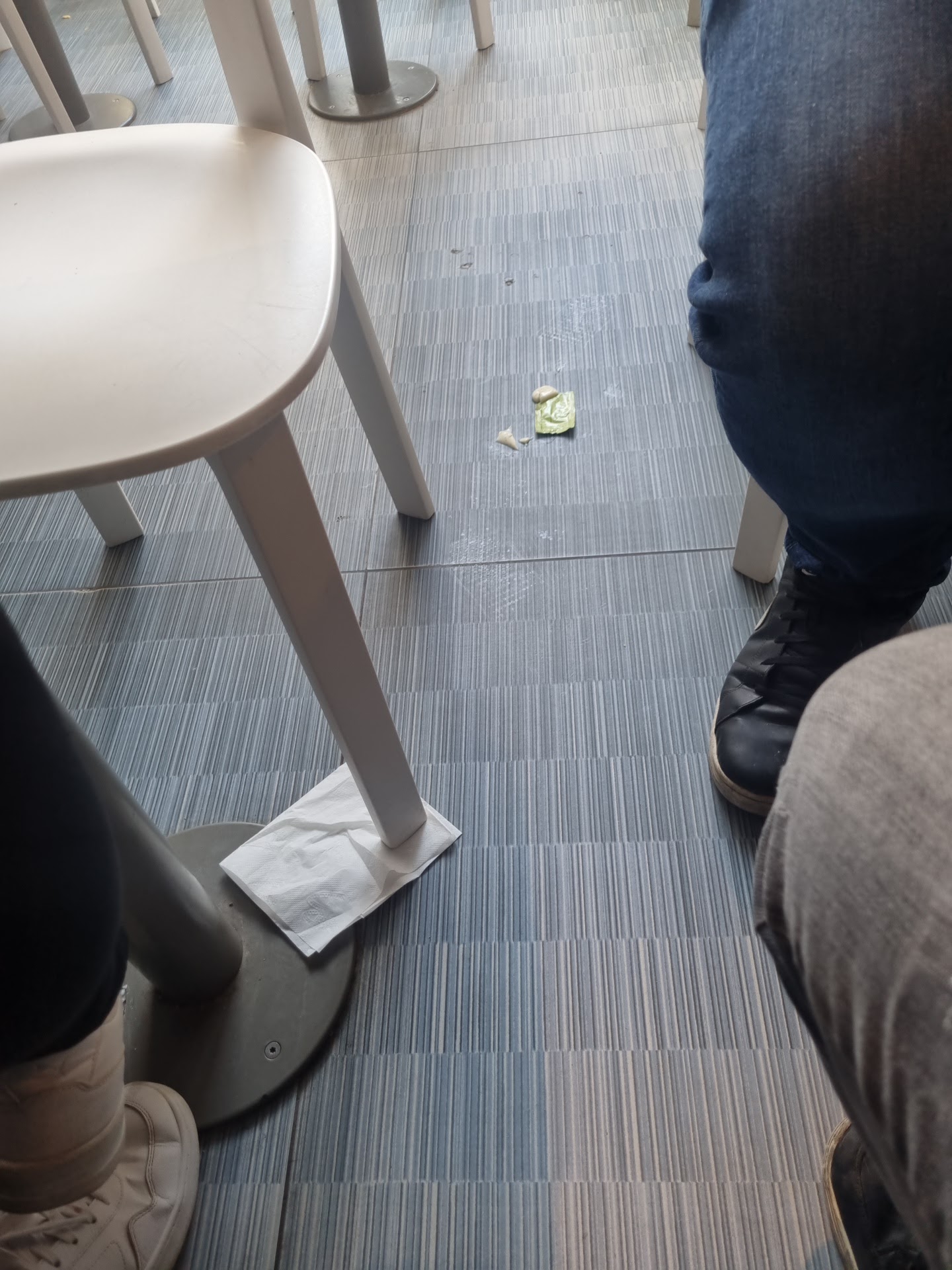 Aucune hygiène. Table non débarrassée, flaque de coca cola au sol. Manque sûrement de personnel.