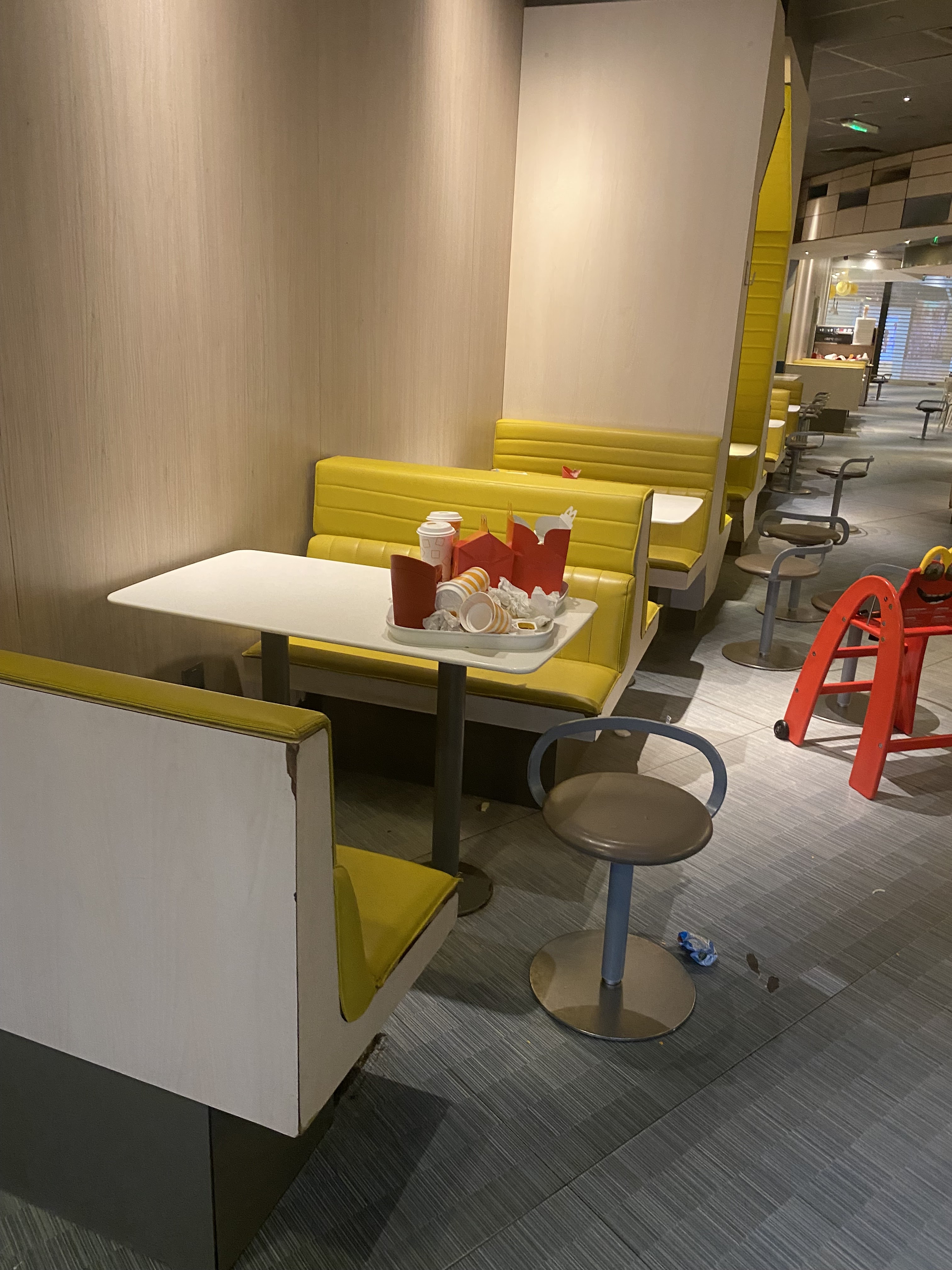 Déceptions totale plateaux à l’abandon sur les tables … sol non balayé ok c la clientèle qui salie ou laisse tomber serviette et autre mais la franchement y’a de la négligence… ensuite je souhaite aller au toilette pour me laver les mains 🙌 la porte ouverte sur restaurant avec poubelle de ville qui laisse porte ouverte et la pas moyen de se laver les mains distributeur HS … et une odeur d’urine Ct intenable j’ai dit à mes enfants assis buvait la boisson et on part avec le reste moi je peux pas rester là …