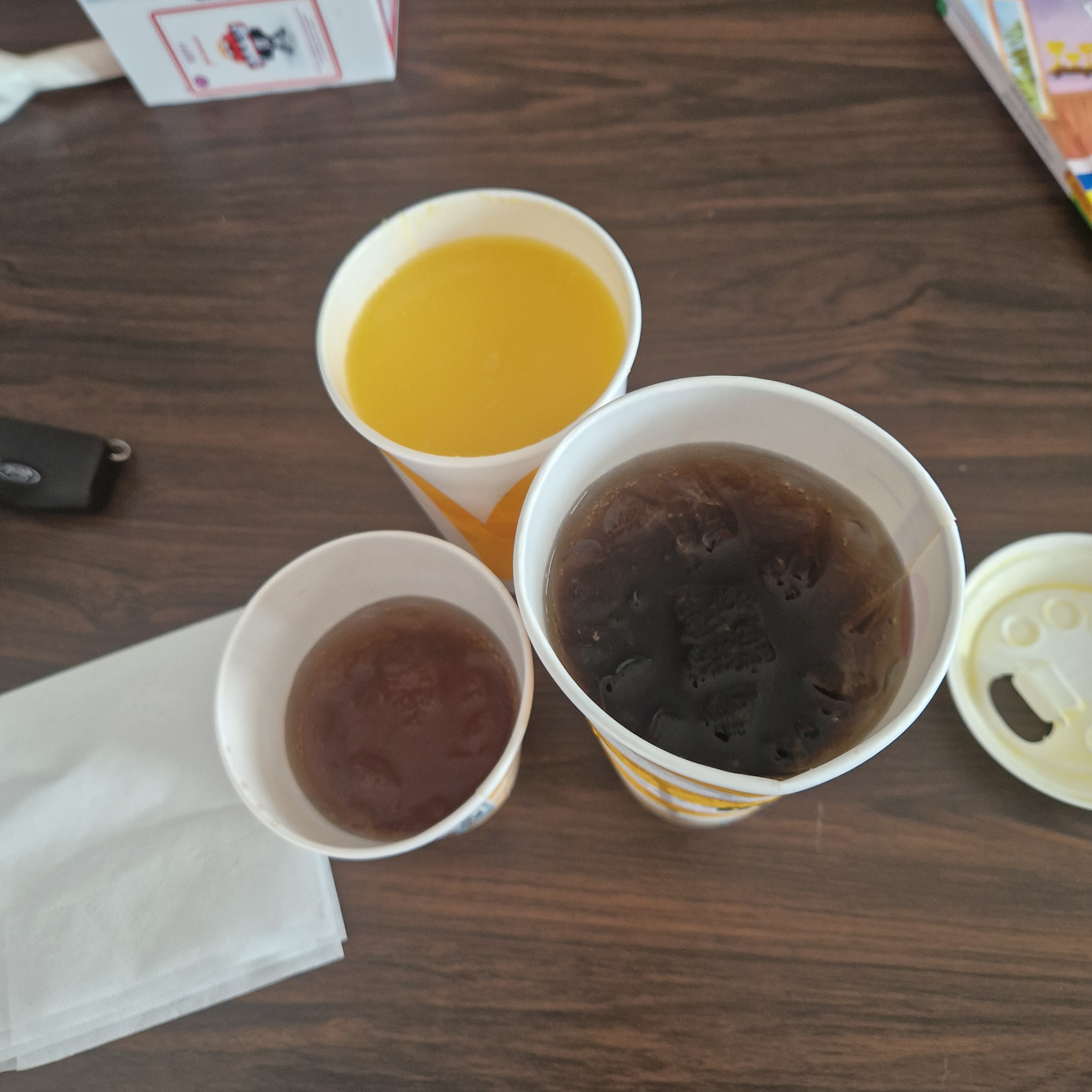 Je fait ma commande et demande des cocas pour 6 menus je vous joints en photo mes cocas ( ace tea mélanger avec du coca, et un jus d'orange) j'ai également commander des frites cheddar bacon j'en ai eu aucune je me déplace pour leur notifier vue qu'ils ne répondais pas au téléphone... et j'ai récupérer mes frite et pour le dédommagement on m'a offert un burger mais ils ne voulaient pas me refaire mes boisson qui venais d'ailleurs tout ça parceque je ne leur ai pas ramener alors qu'ils les auraient de toute façon toutes jeter .... j'y retourne pour récupérer donc mes frites et le Burger mais meme en ayant le tiquet devant elle la RESPONSABLE arrive à me mettre des potatoes au lieux de frites et pourtant cetais pas le première avril et dans tout ça elle paraissait agacer que je lui demande de me donner des frites au lieux des potatoes .. le principale c'est de participer ! En plus de vérifier la commande il faut maintenant vérifier les boisson on est au top du top