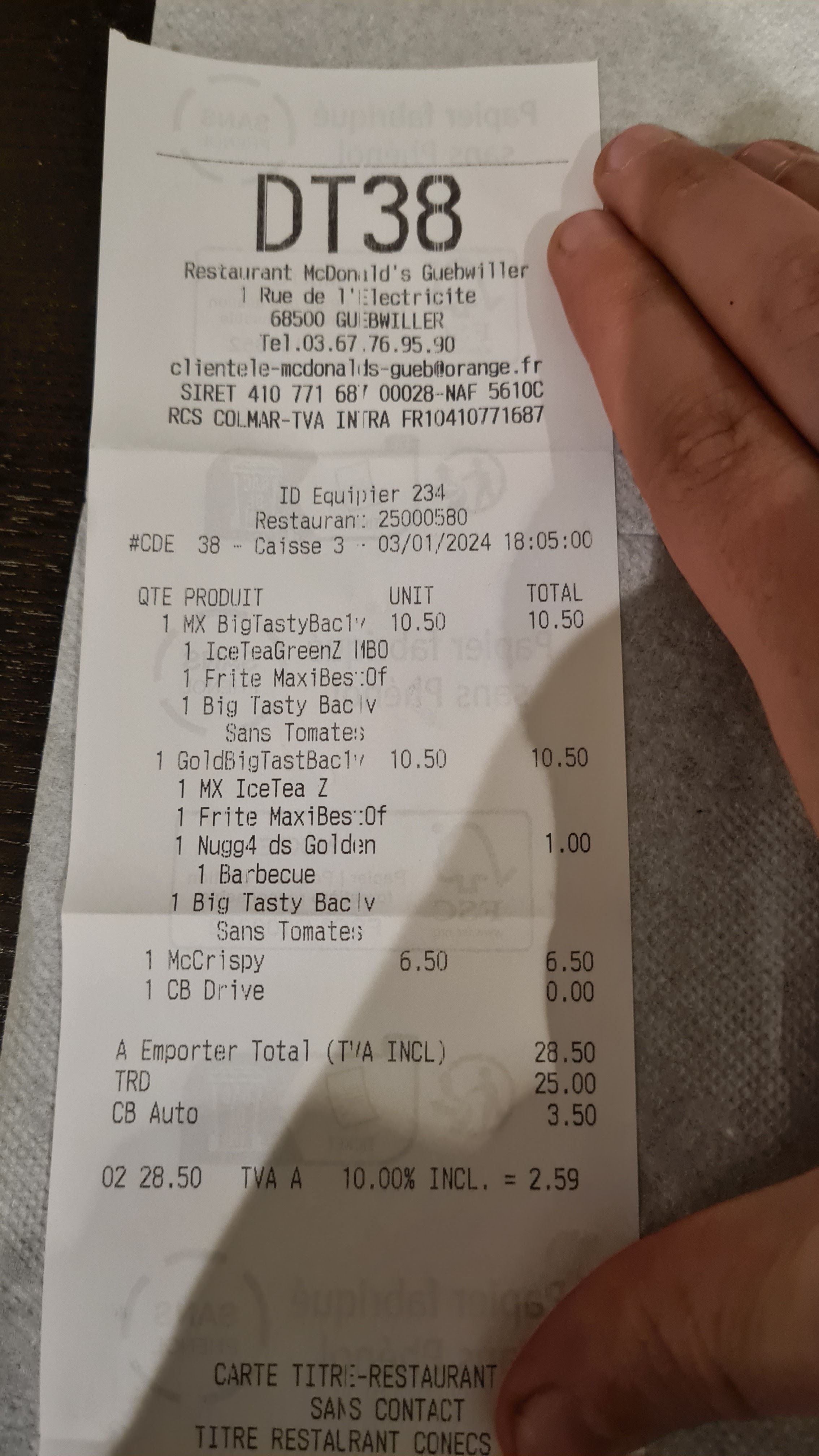 Vous me devez 2 BigTasty BACON ! Commande n° DT38 dater du 03/01/24 à 18:05:00. À chaque fois un autre oubli...