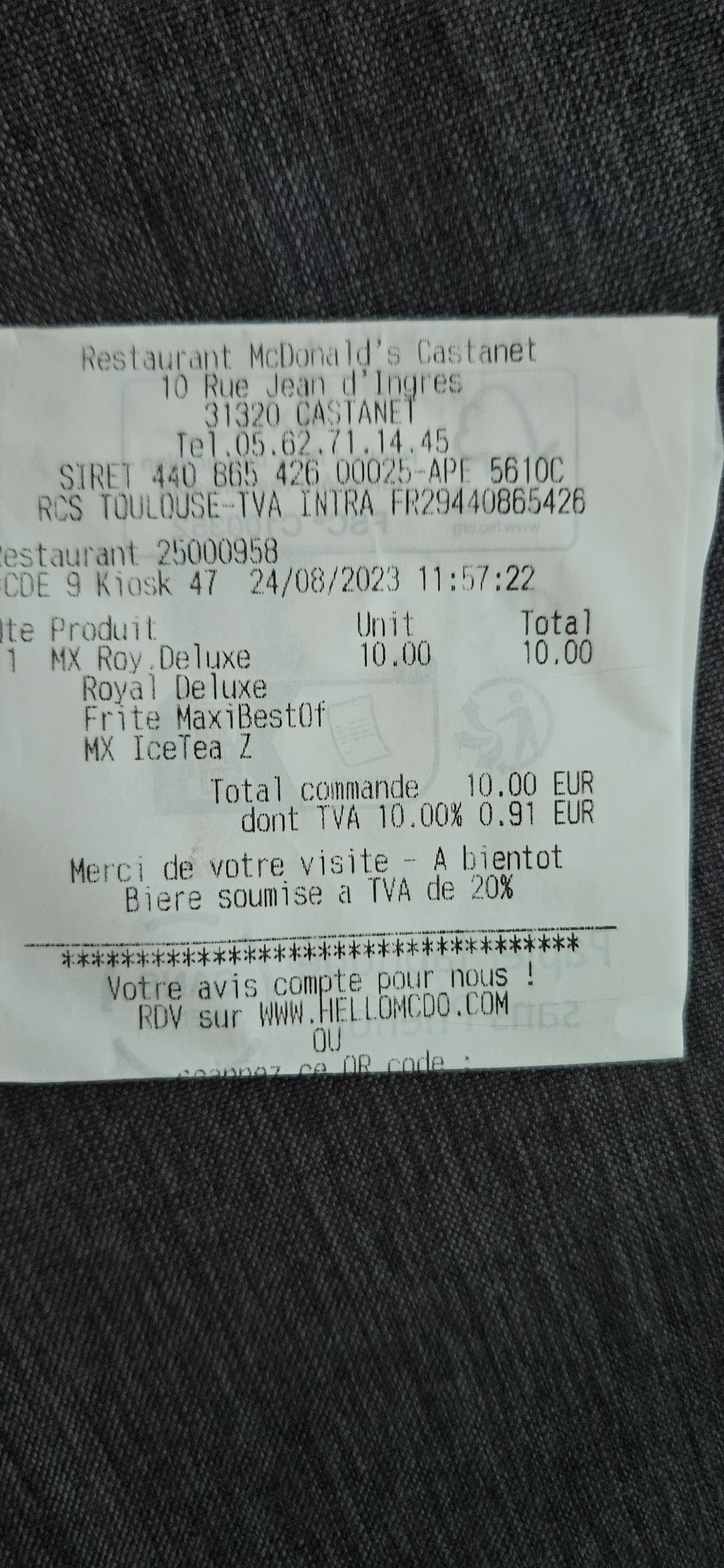 Cet avis apparaît juste en dessous. Vous verrez la réponse qu’ils font. C’est risible!! Ce sont toujours les mêmes réponses. Soit disant ils feront mieux mais rien ne change depuis des années. Par curiosité regardez les avis et je suis sure que vous n’irez plus!!! A castanet il y a plein de petits restos très sympas et pas bcp plus chers que Mac do. Il ne faut plus y aller!! Faites un uber eat avec Burger King. Ce sera moins cher et plus rapide et surtout meilleur!! Plus de 50 min pour obtenir une commande à emporter. J’ai interpelé 3 fois l’équipe pour savoir s’il y avait un problème!! Mais au lieu de m’écouter et de prendre en compte ce que je disais, je les ai agacé et en plus je les faisait rire!!! Leur réponse était qu’il y avait du monde. Mais le top est que pour s’excuser ils m’offraient soit disant bières et glaces!! Alors en fait ils ont oublié d’abord mon donuts!! J’avais 3 bières commandées et pas une de plus comme annoncé!! Et un sundae offert! Qu’on a pas mangé puisque dans notre commande on avait déjà chacun des glaces . On va pas mangé plus juste comme ça! On note la super compensation!! Avec a mangé à 21:15!! C’est inamissible et maintenant c’est certain on ne mettra plus les pieds à Mac do!!