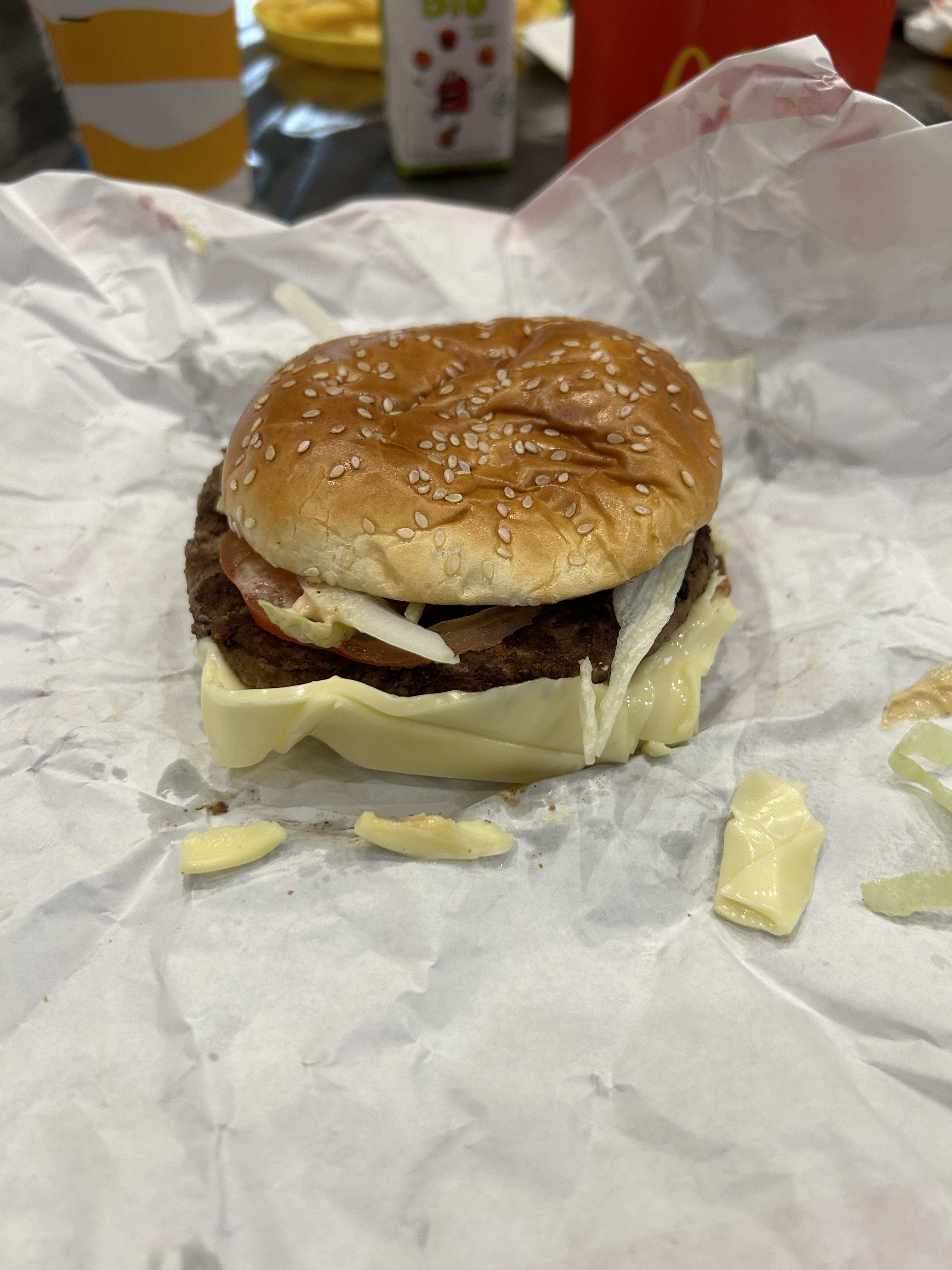 Déçu alors qu'avant nous aimions bien. Le steak et le fromage à coter de mon pain burger, l'oublie du dessert dans l'happy meal mais le pire c'est que le bigmac était super gras
