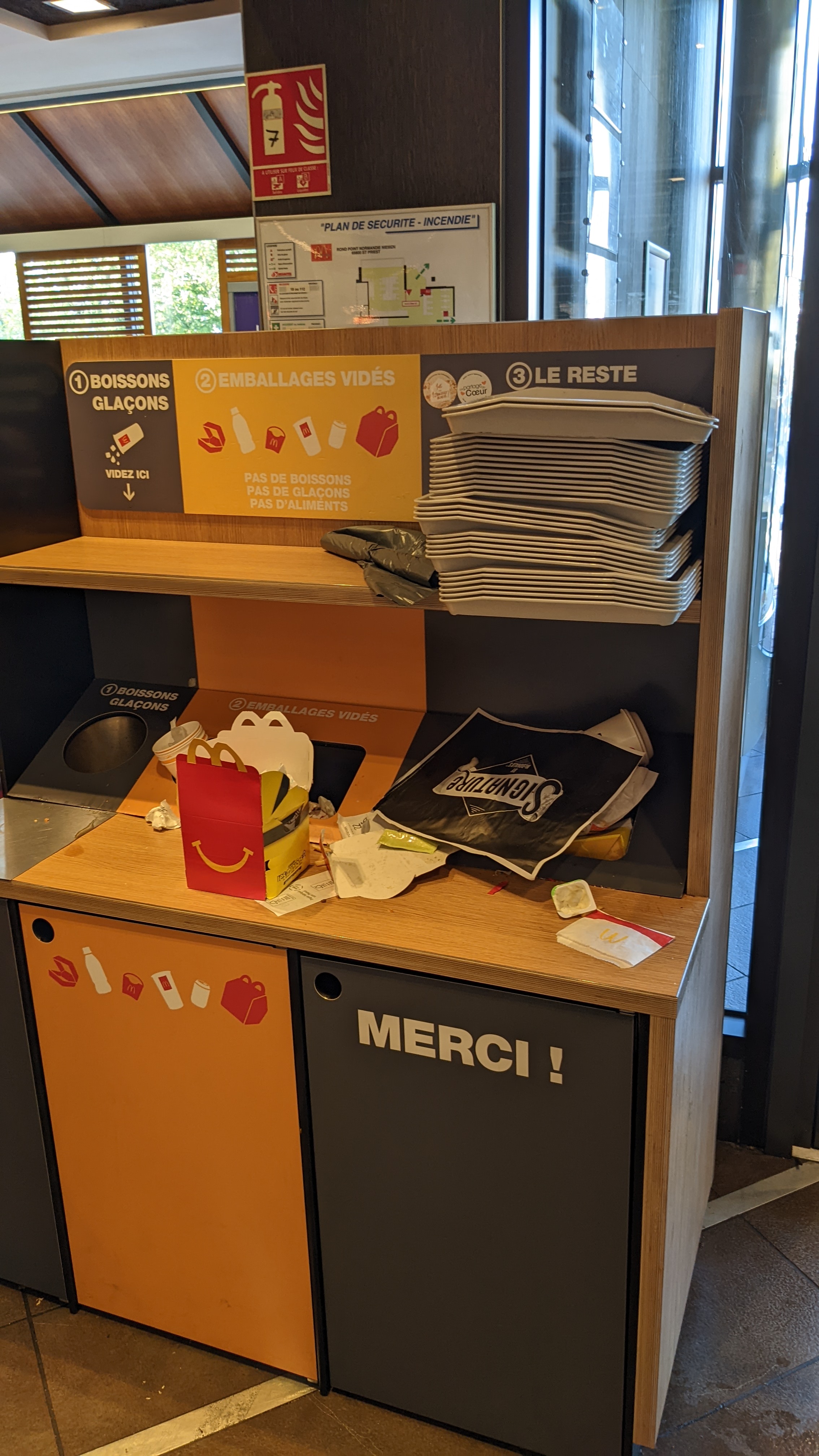 Jamais vu un Mc Do comme ça. Les poubelles pleines a craquer. Du coup les gens qui laissent les plateaux sur les tables et dehors tout s'envole... Sous effectif je pense.