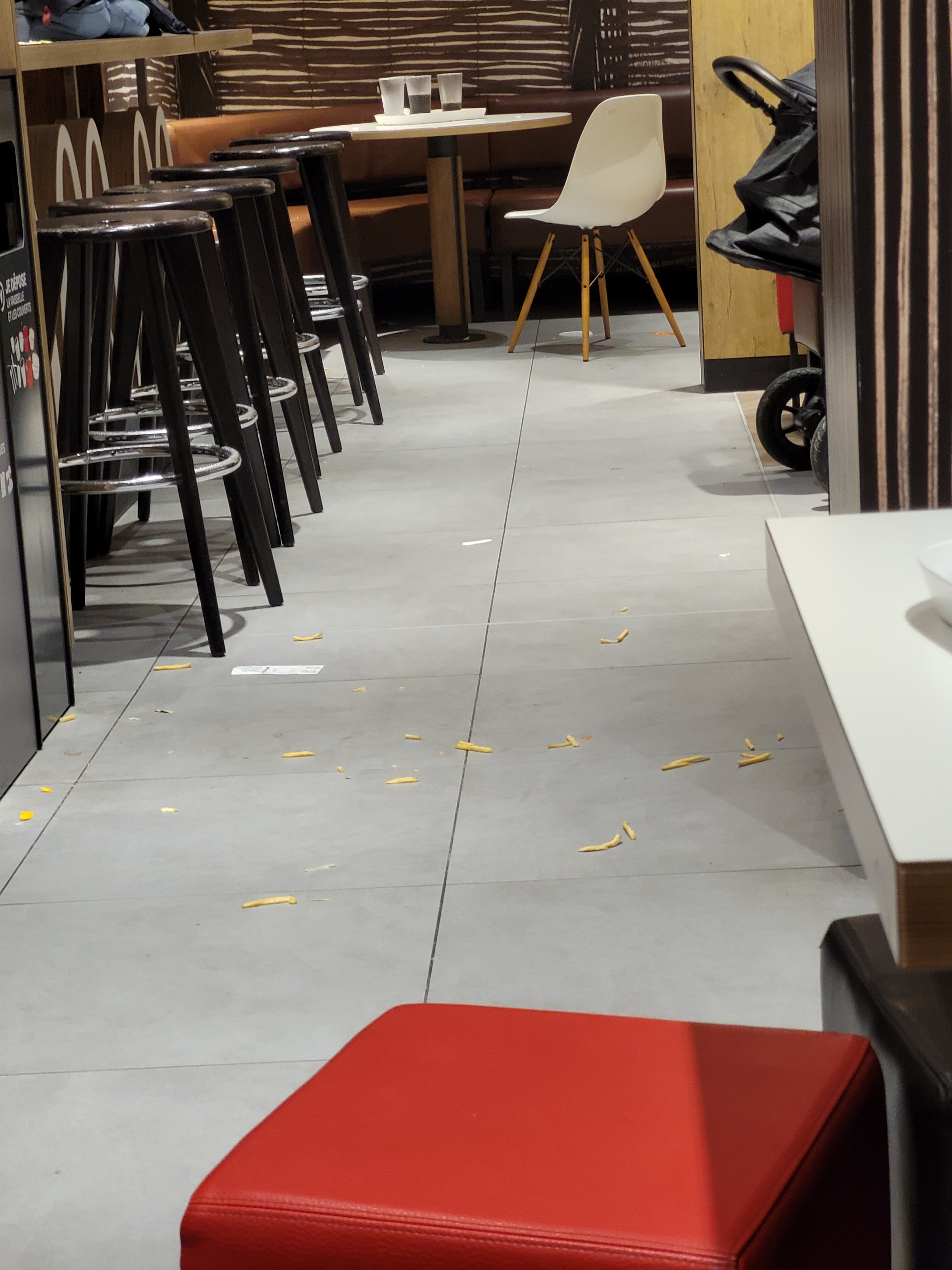 Une de mes pires expériences chez Macdonald's! Pourtant bon client de l'enseigne, quelle ne fut pas ma surprise de m'assoir à côté d'un tapis de frites. Également, plus de la moitié des tables étaient pleines de détritus, il faut dire que la clientèle présente ce soir là était très peu civilisée. Enfin, après une longue attente de plus de 20 minutes, ma commande est arrivée dans un plateau non lavé et avec des frites molles et froides. Les serveuses étaient souriantes.