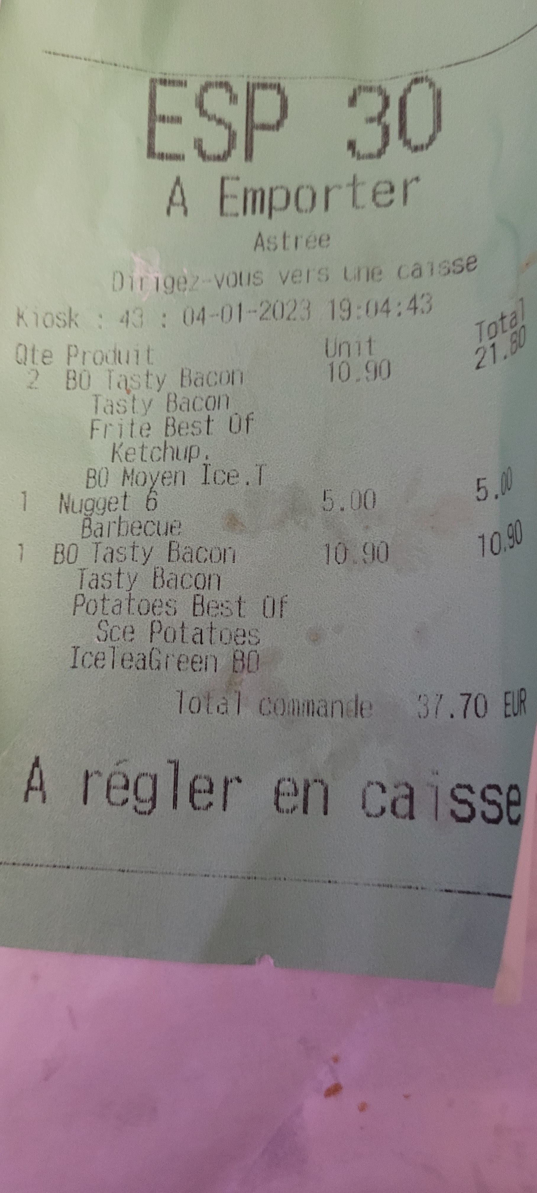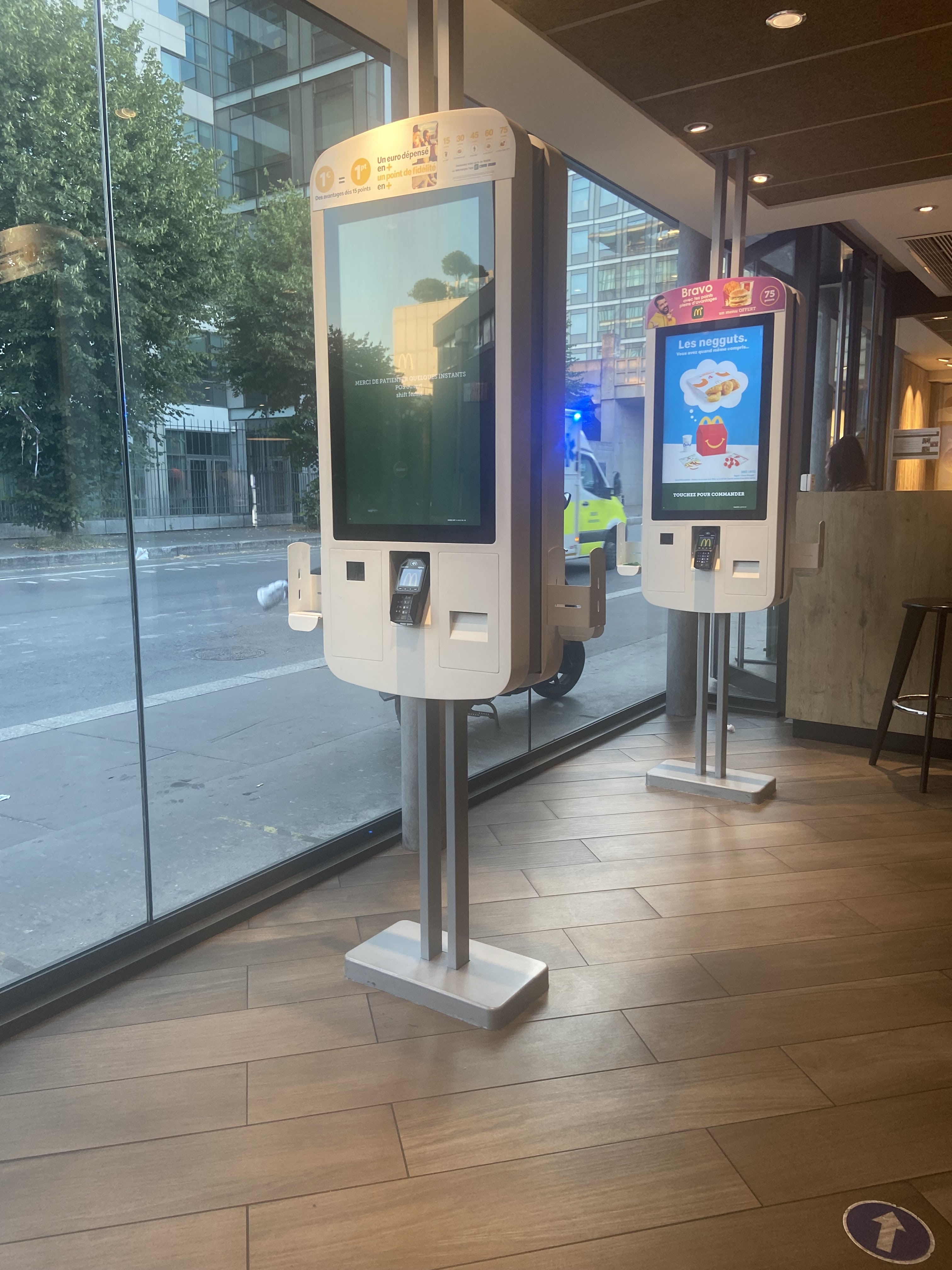 Borne sans chevalet et pas de ticket du numéro de commande, par la suite nous avons du attendre plus de 20min notre commande au final la moitié était froid ...il n'y a que le nom de restauration rapide, je me demande comment ils vont gérer les JO