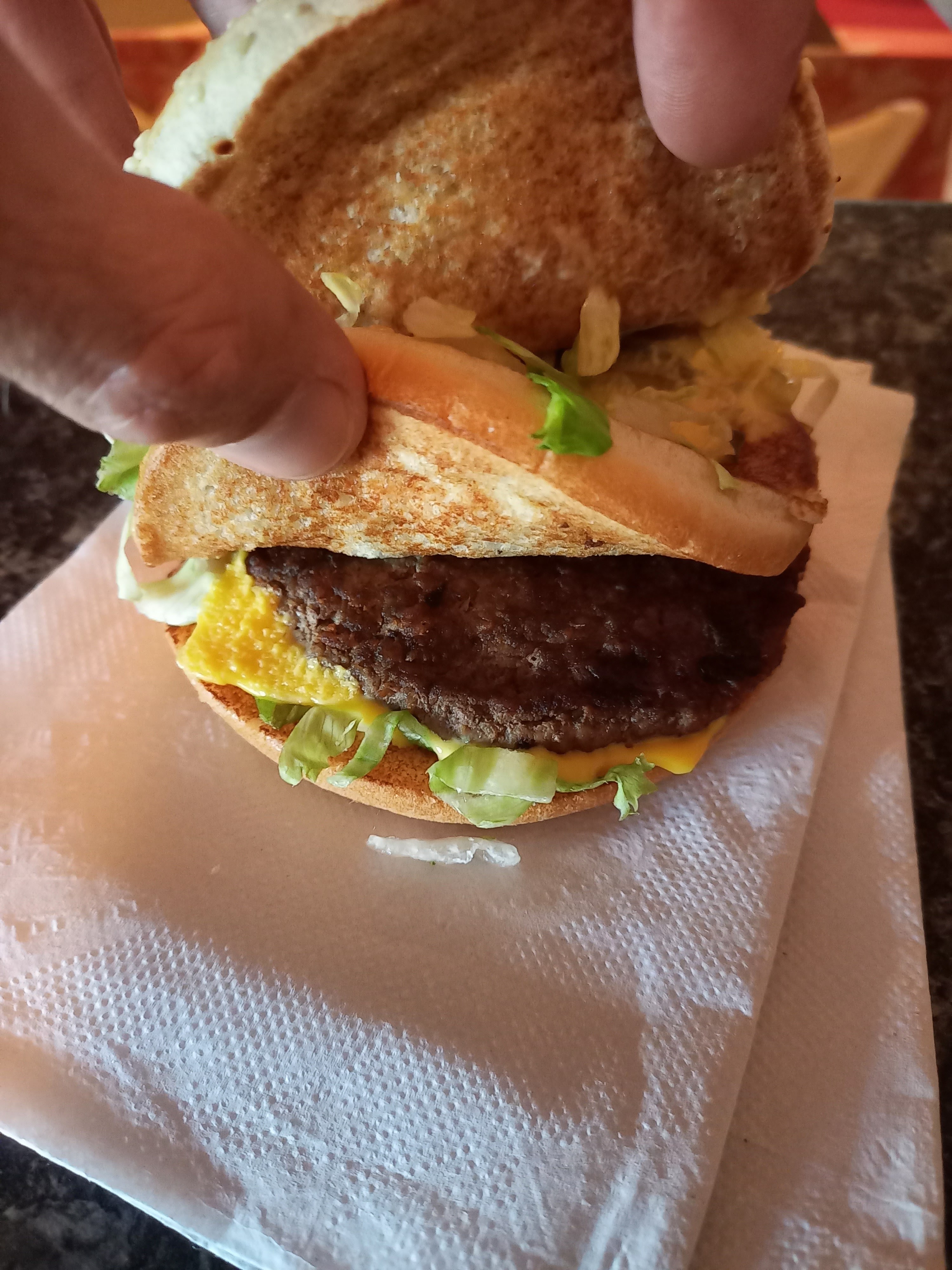 Bonsoir arrivée au restaurant à 23h en sachant qu’il ferme à 23h30 déçue à chaque fois que j’arrive tard une tonne de ketchups dans le double chess ok on était à 30 minutes de la fermeture mais le service devrait être le même qu’à 15h bref je vous mets une photo du double chess qu’on a demandé a changer et on nous l’a juste remballer 🤣je vous mets une photo du chess et dites-moi ce que vous en pensez c’est sûr que le remballage et normal et encore heureux qu’on a demandé à la caisse des frites chaude qui était froide allez continuez comme ça 🤣🤣🤣🤣🤣et pour moi le ketchups a était mis à côté du chess mais sûrement pas dedans !!!!