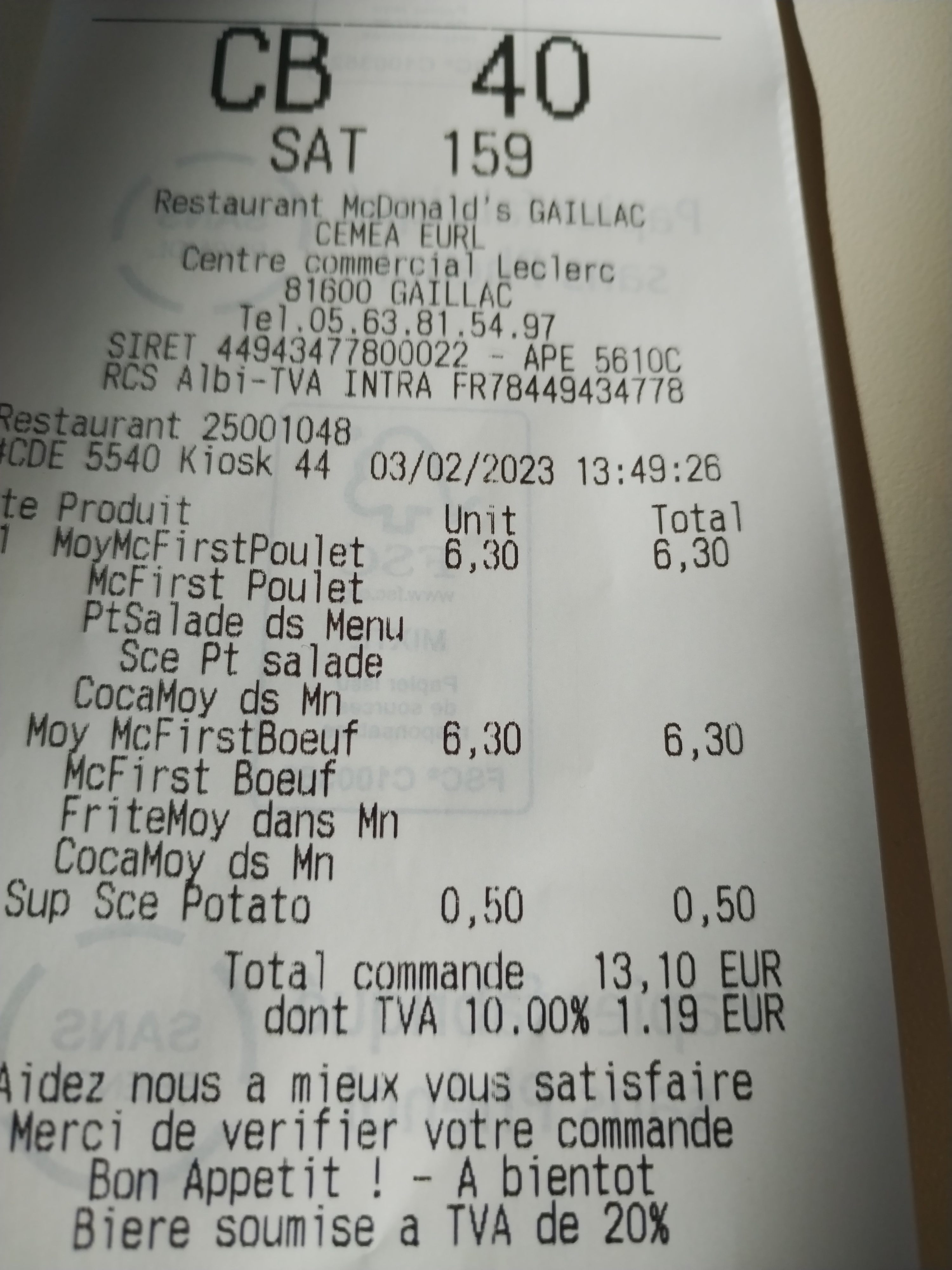 Au bout de trois allés retour pas la bonne Commande. 3 frites et 1 potatoes au lieu de 2 frites et 2 potatoes initialement commandés. Difficile le calcul... Bref jamais rien ne correspond quand on passe au drive a Gaillac contrairement à lavaur.