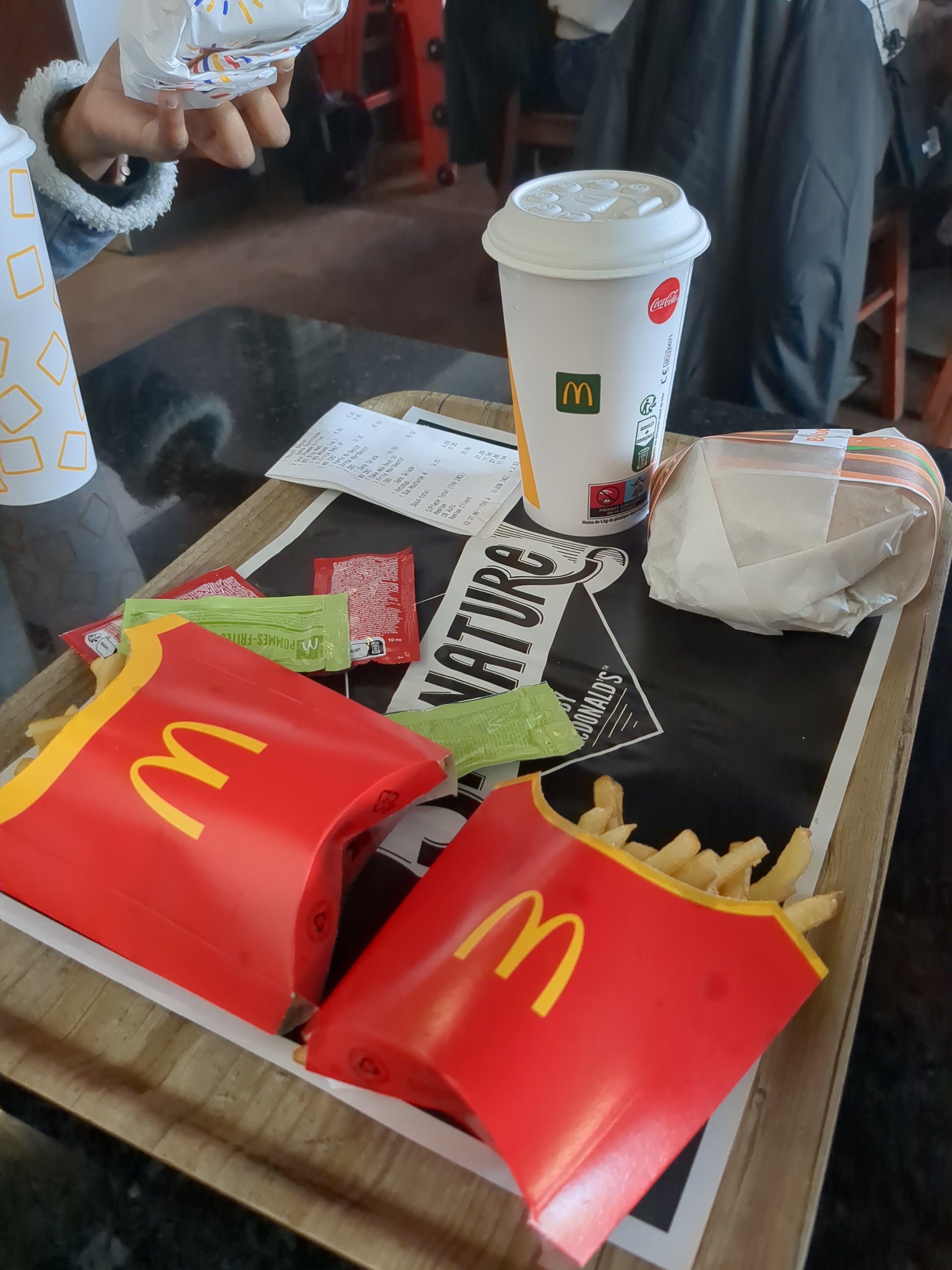 Un passage au macdo le 7 mars avant de reprendre un train….un monde fou! Un groupe de 60 personnes qui voulait être servi en même temps, un stress pour nous qui avions réglé aux bornes, MAIS une personne en salle ULTRA ADORABLE ET EFFICACE….grâce à elle, nous avons pu manger ET avoir notre train! Merci à vous Madame !