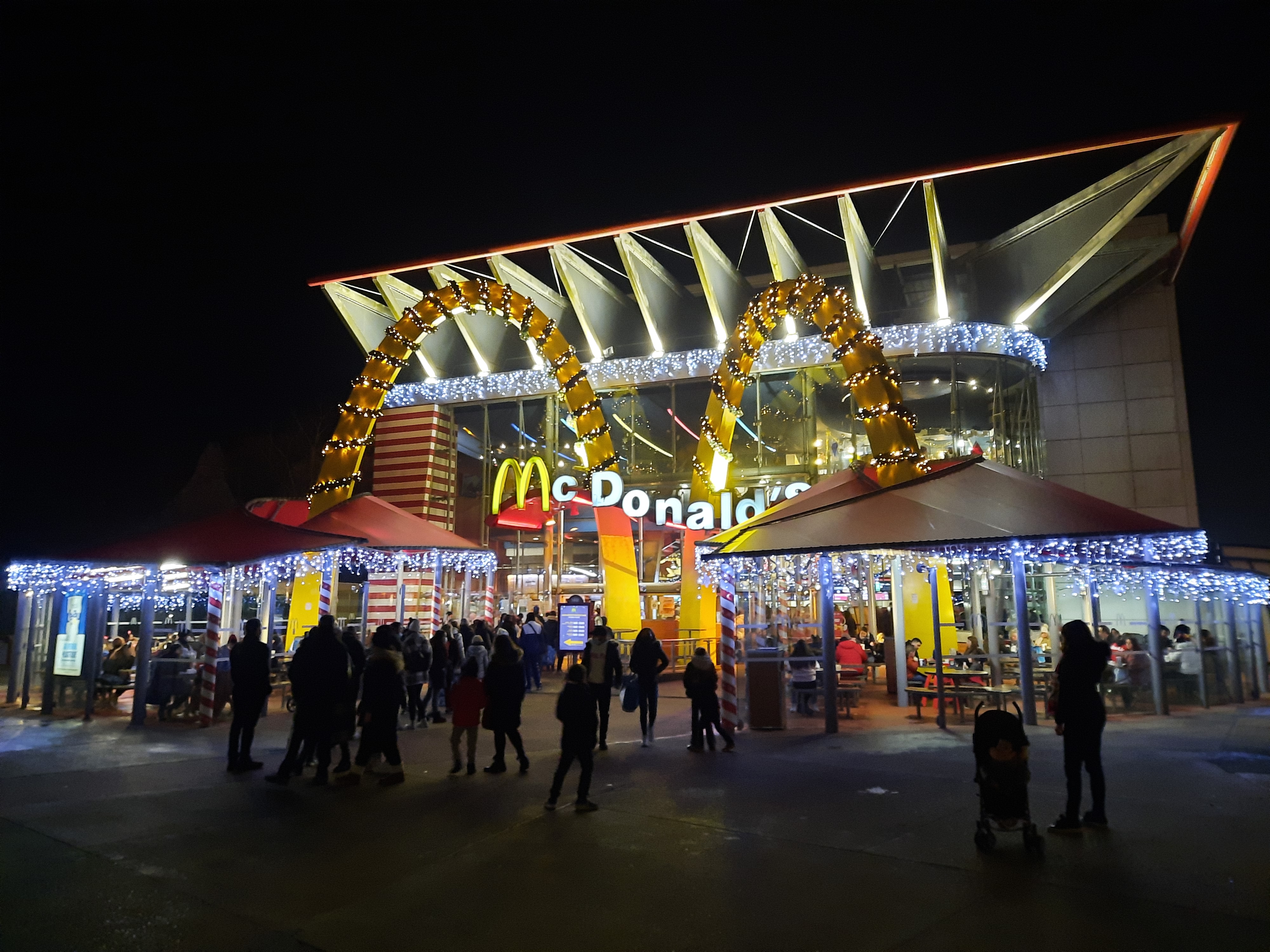 Équipe toujours accueillante malgré le monde. Situé dans l'enceinte du Disney Village, ce restaurant McDonald's a une grande amplitude horaire et accueil beaucoup de clients tous les jours. Vous y trouverez tous les produits McDo (sauf les Potatoes ☹), mais également un McCafé. Il y a une terrasse extérieure et un étage afin de manger sur place. Un petit rafraîchissement de la décoration serait un gros plus. (P.S: très belle déco extérieure pour les fêtes).